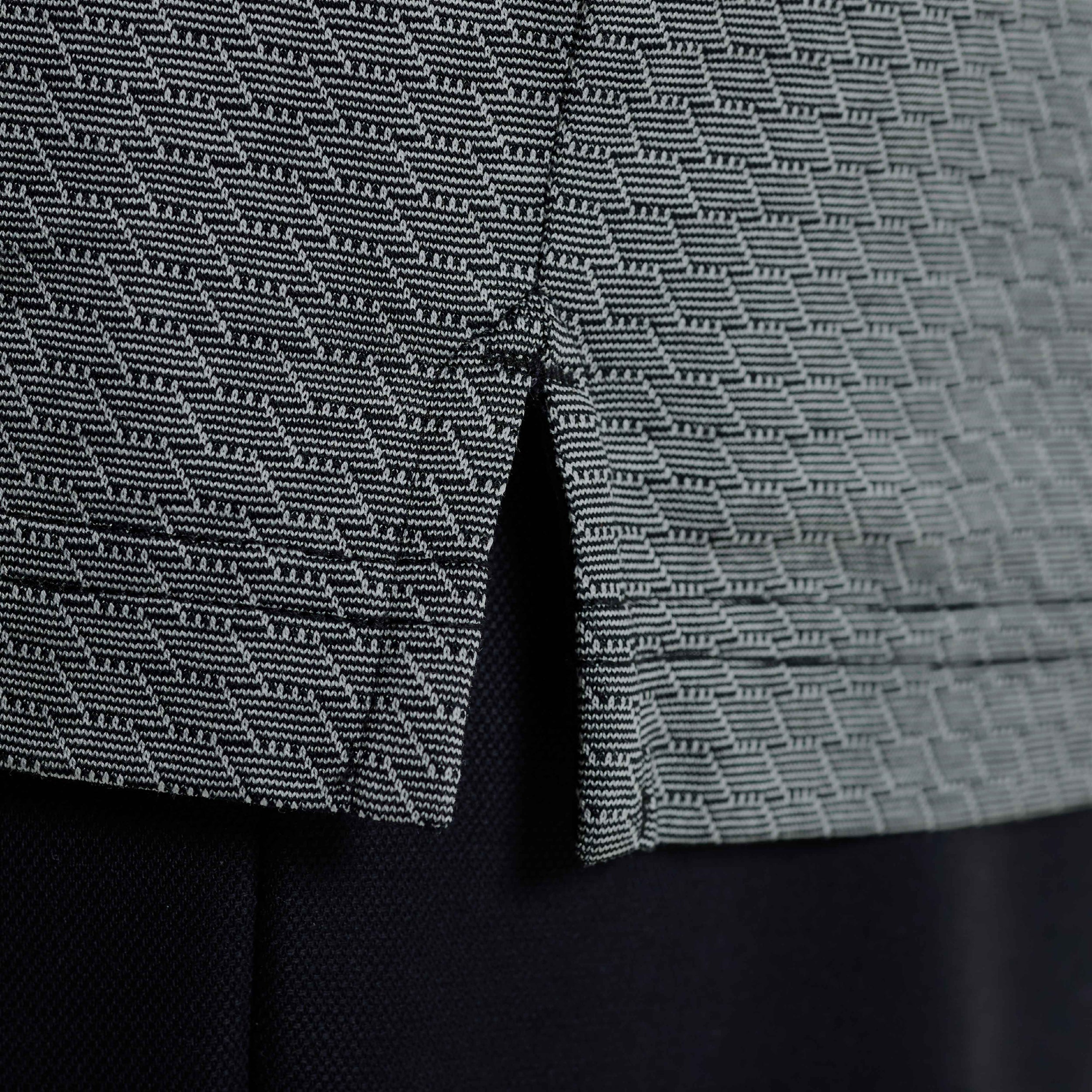 Crafted from 100% mercerized cotton, this long sleeve polo showcases a sophisticated geometric jacquard pattern and a bird's eye rib collar with double stripe contrast detail. Finished with a straight hem, straight cuffs, a three-button placket and mother-of-pearl buttons, for a clean, modern look.