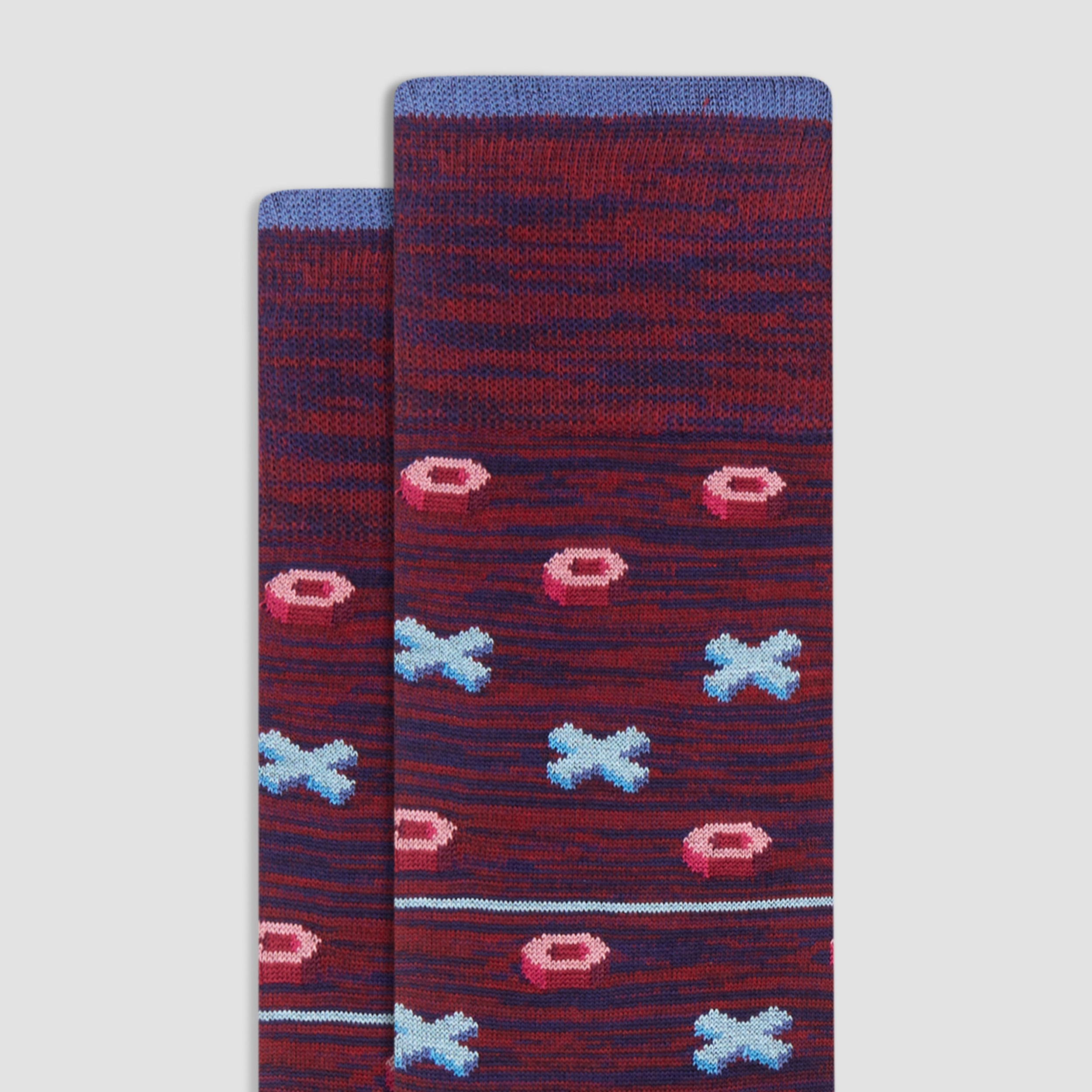 Geometric mid-calf socks in fine gauge mercerized cotton blend with rib knit cuff band, hand linked toe and reinforced heel seams. Made in Italy.