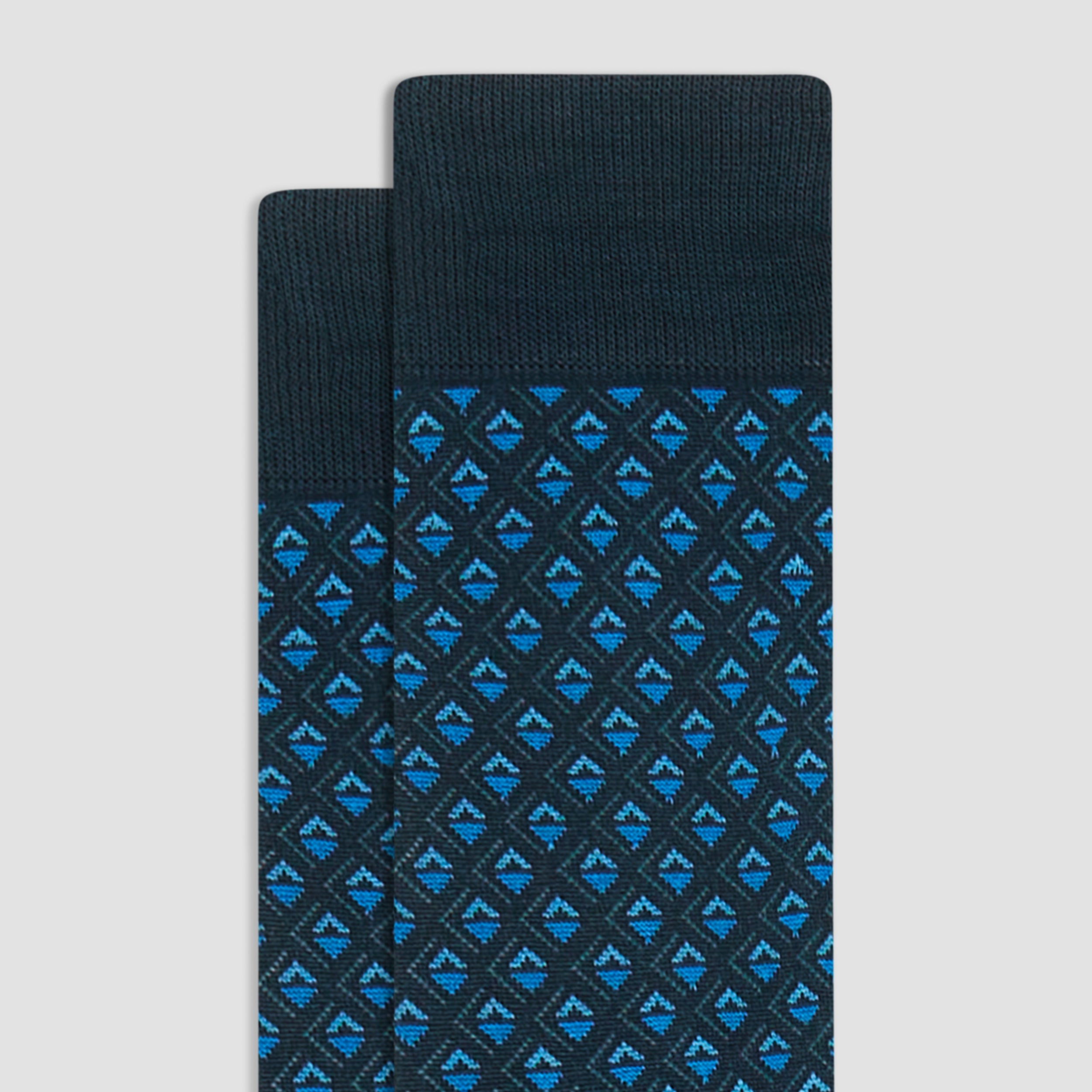 Geometric mid-calf socks in fine gauge mercerized cotton blend with rib knit cuff band, hand linked toe and reinforced heel seams. Made in Italy.