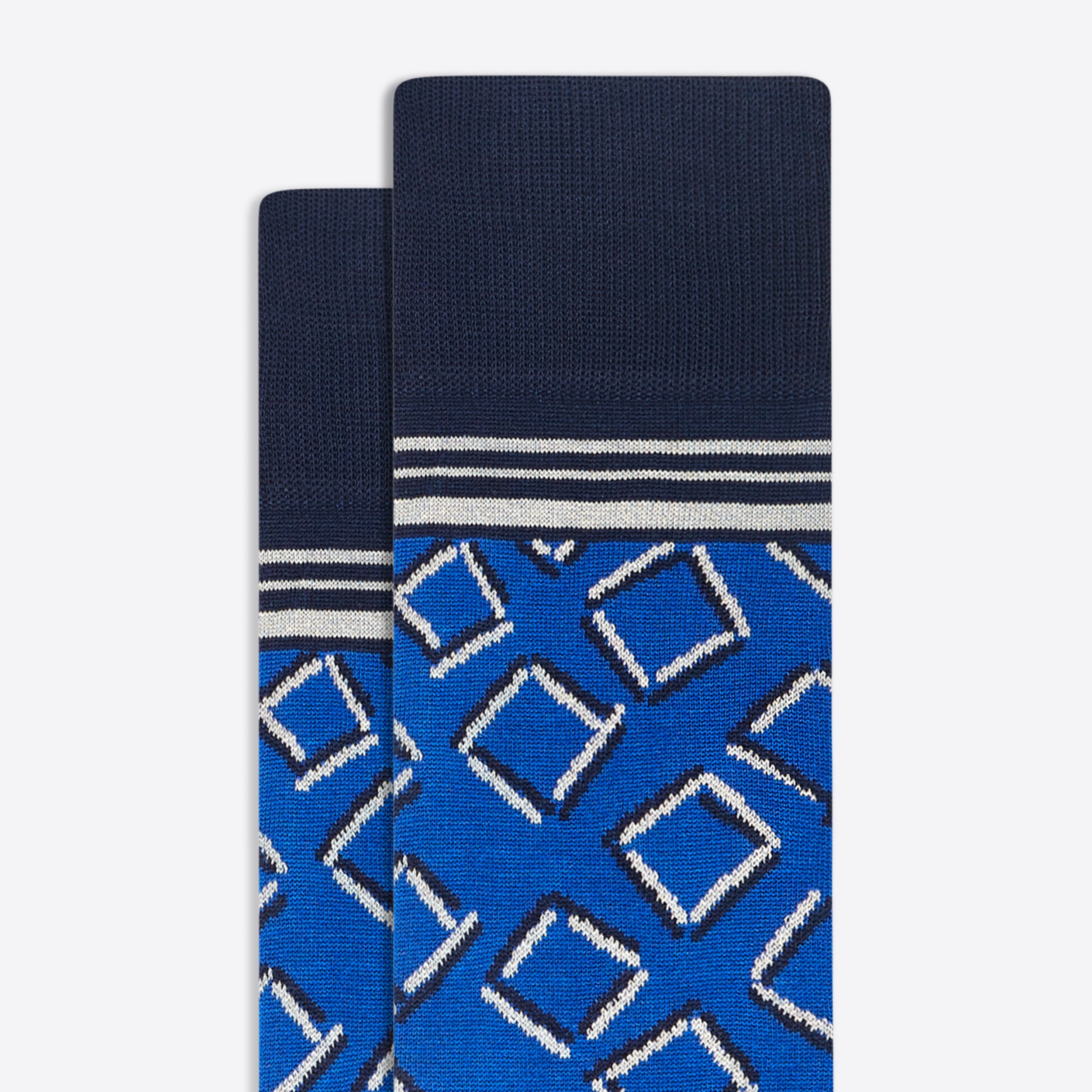 Geometric mid-calf socks in fine gauge mercerized cotton blend with rib knit cuff band, hand linked toe and reinforced heel seams. Made in Italy.