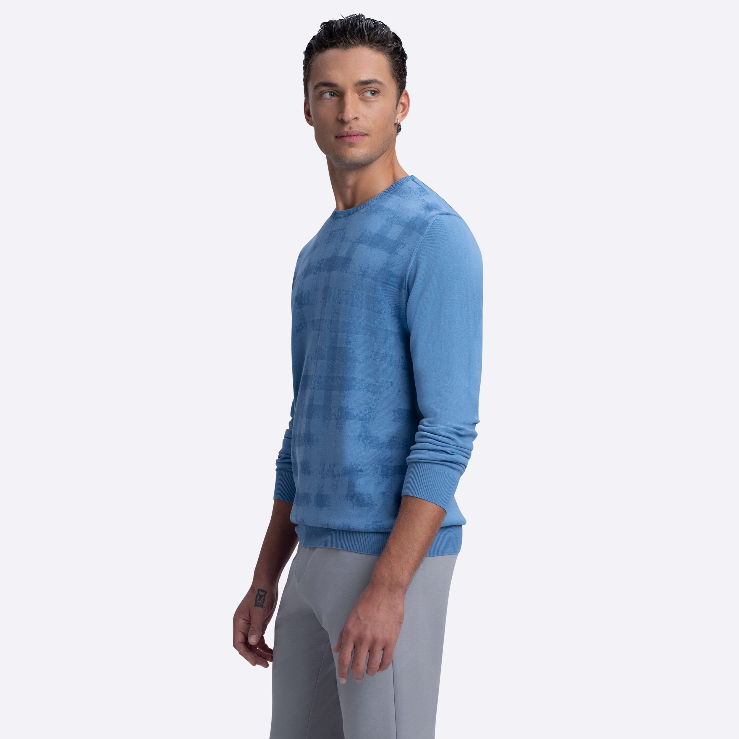 Ghost check long sleeve crew neck sweater in 100% cotton with solid rib knit cuffs and waistband. Made in Italy.