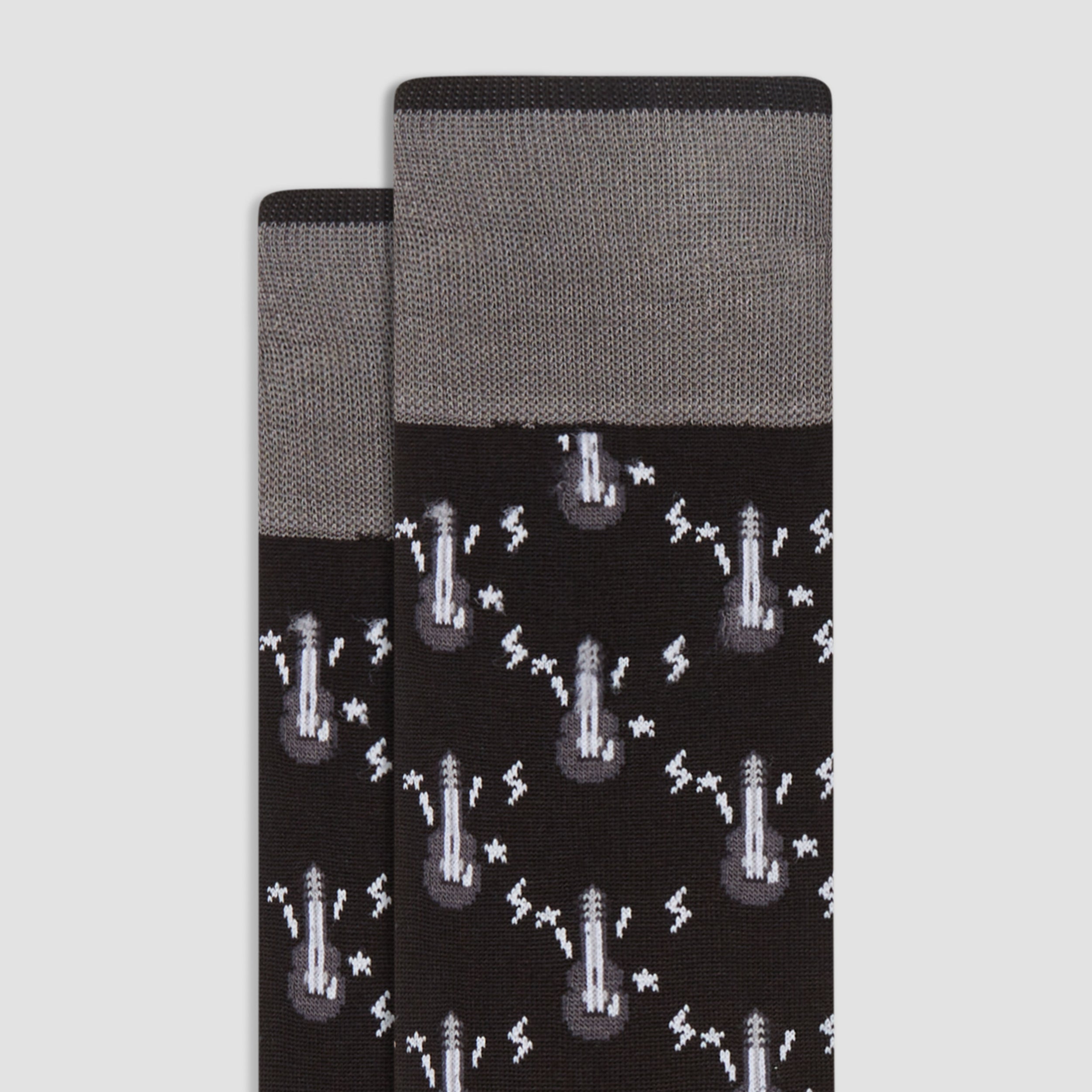 Guitars mid-calf socks in fine gauge mercerized cotton blend with rib knit cuff band, hand linked toe and reinforced heel seams. Made in Italy.