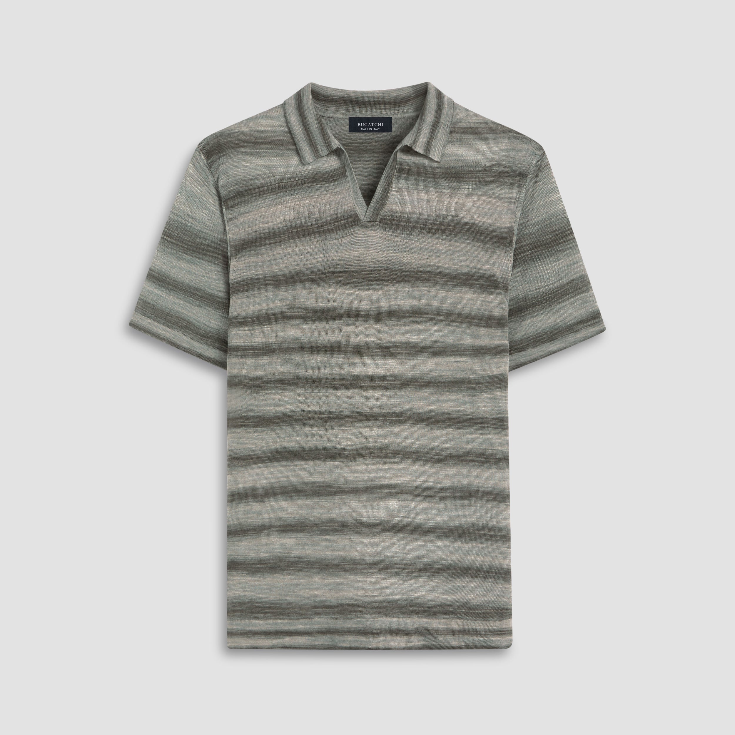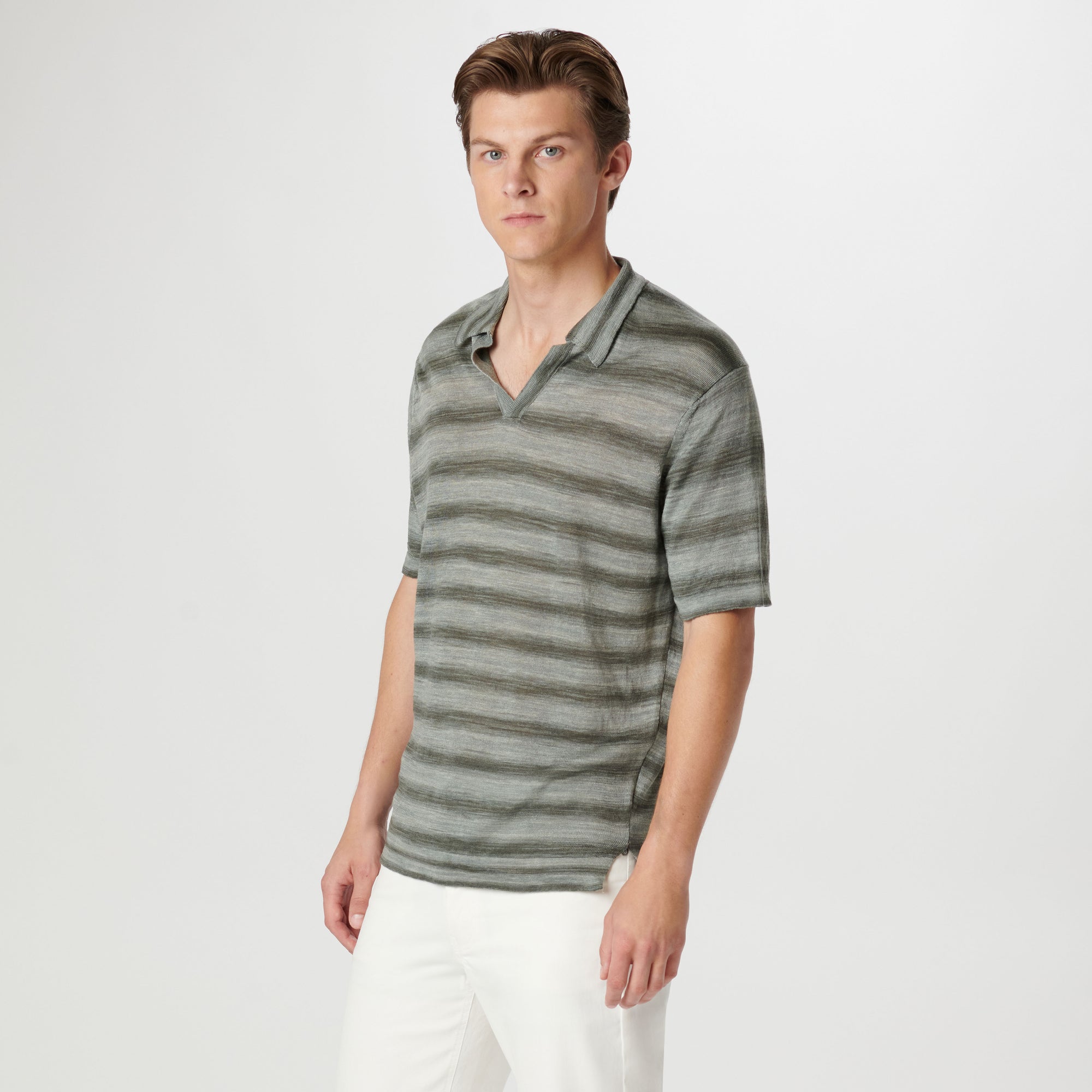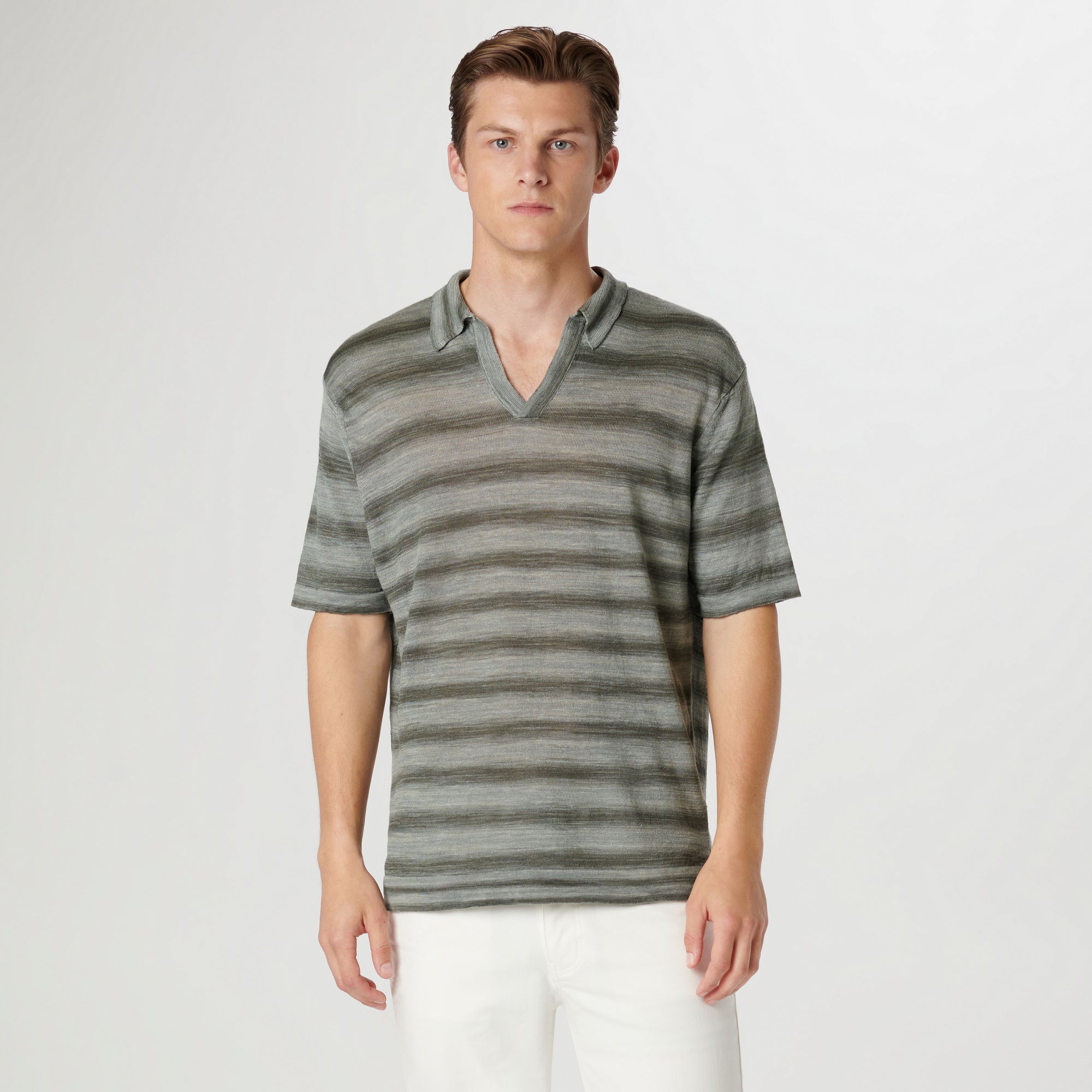 Contemporary and stylish, this Italian-made short-sleeved heather striped polo is crafted in 100% linen yarn and features a distinctive Johnny collar. The natural properties of linen make it not only breathable but also exceptionally durable. Perfect for warm days or casual occasions, this polo effortlessly combines style, comfort, and resilience .