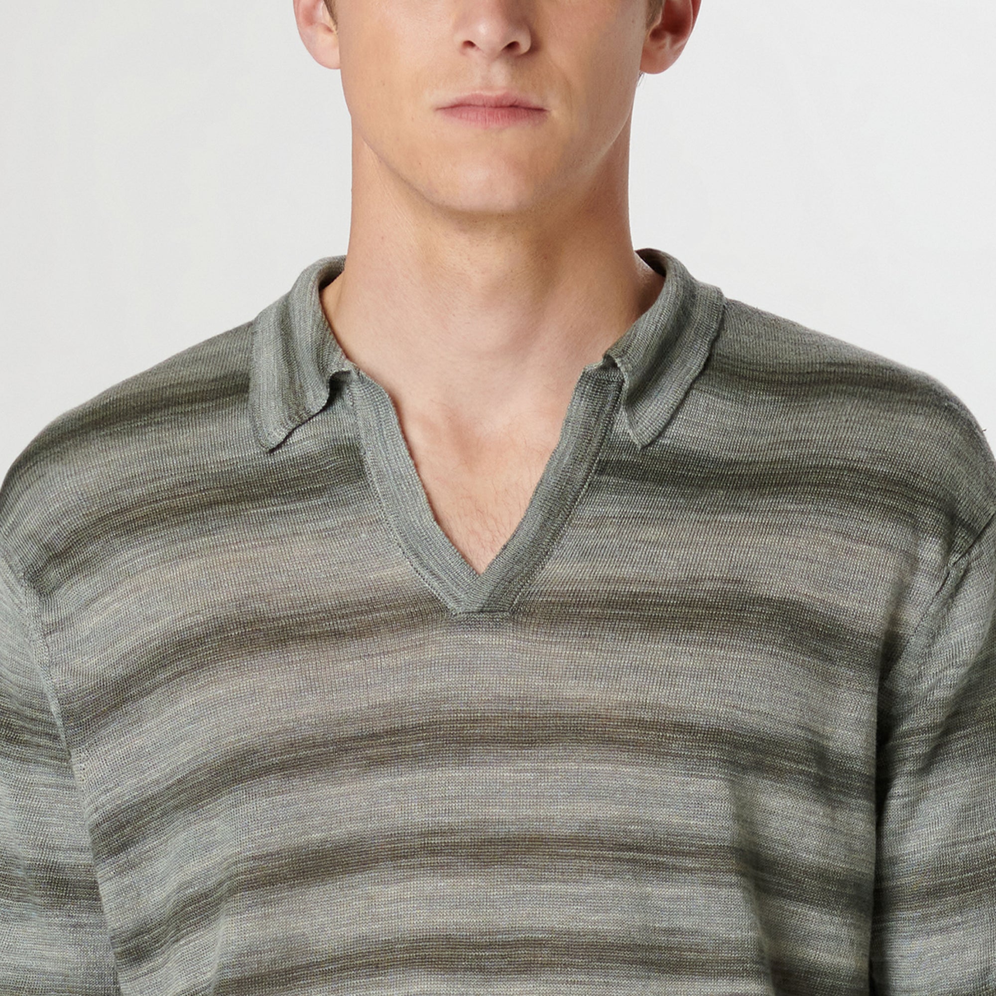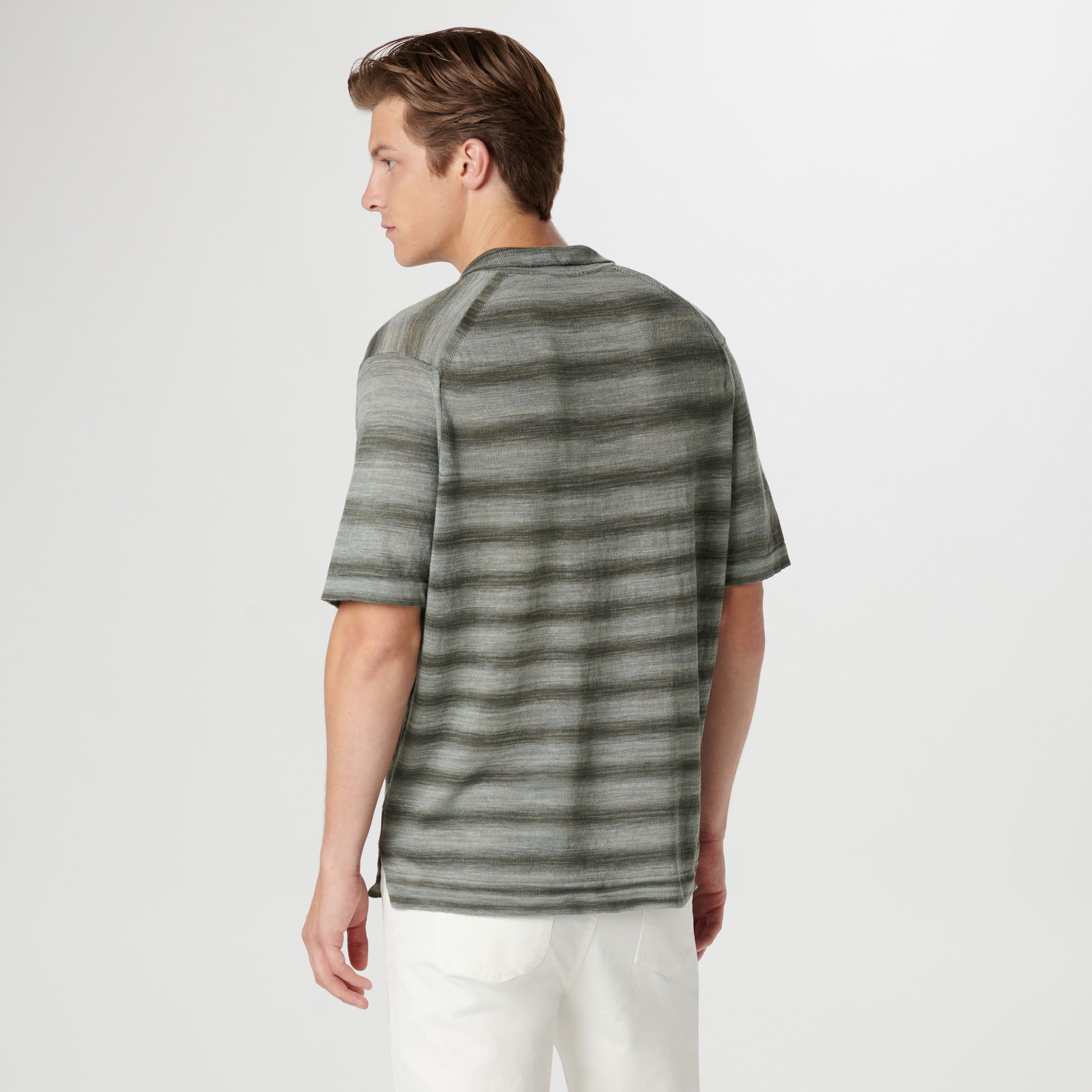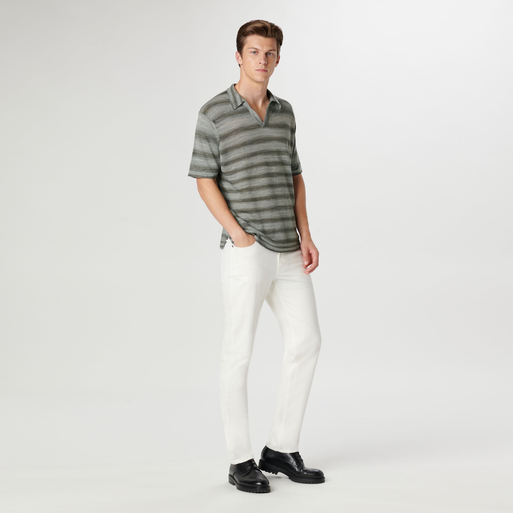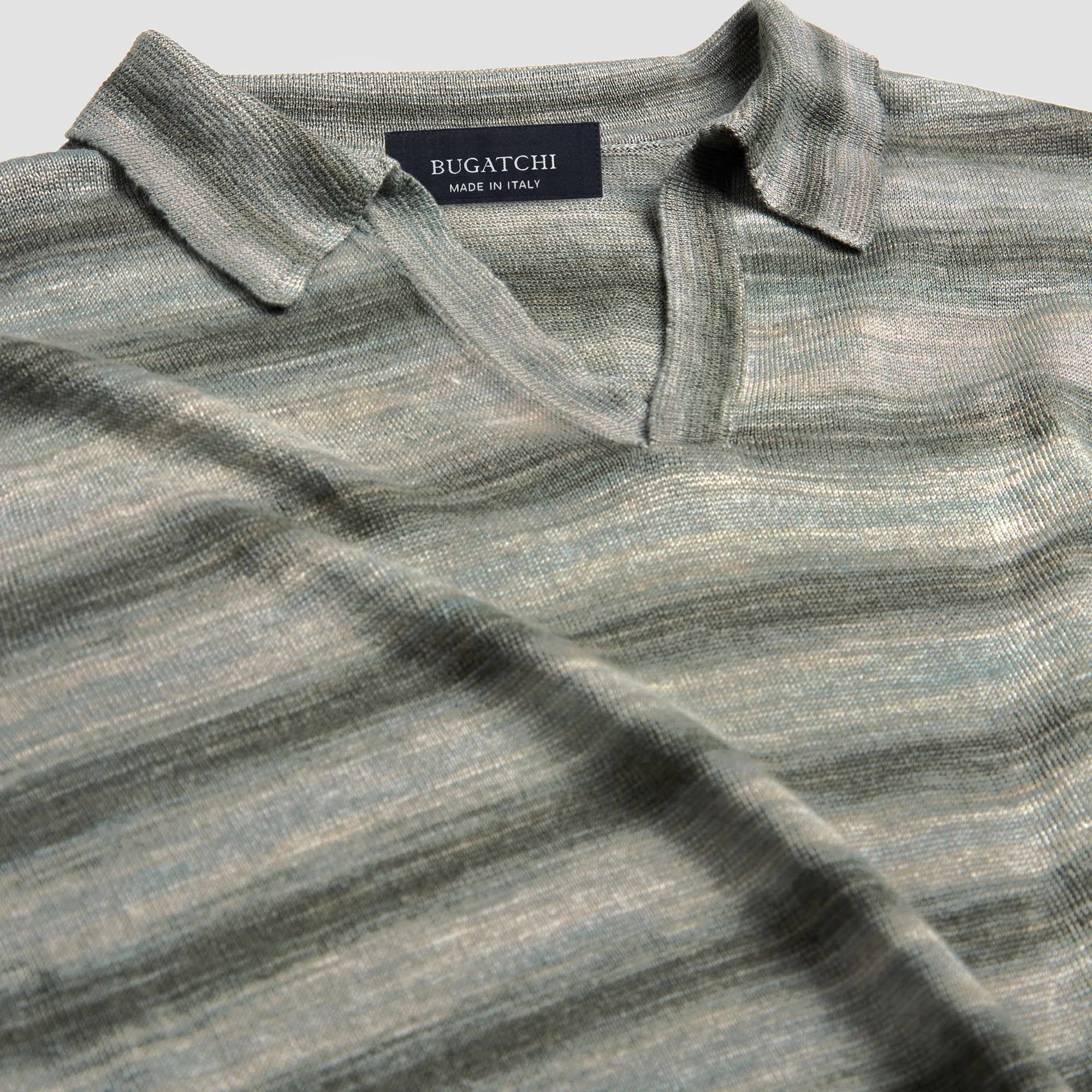 Contemporary and stylish, this Italian-made short-sleeved heather striped polo is crafted in 100% linen yarn and features a distinctive Johnny collar. The natural properties of linen make it not only breathable but also exceptionally durable. Perfect for warm days or casual occasions, this polo effortlessly combines style, comfort, and resilience .