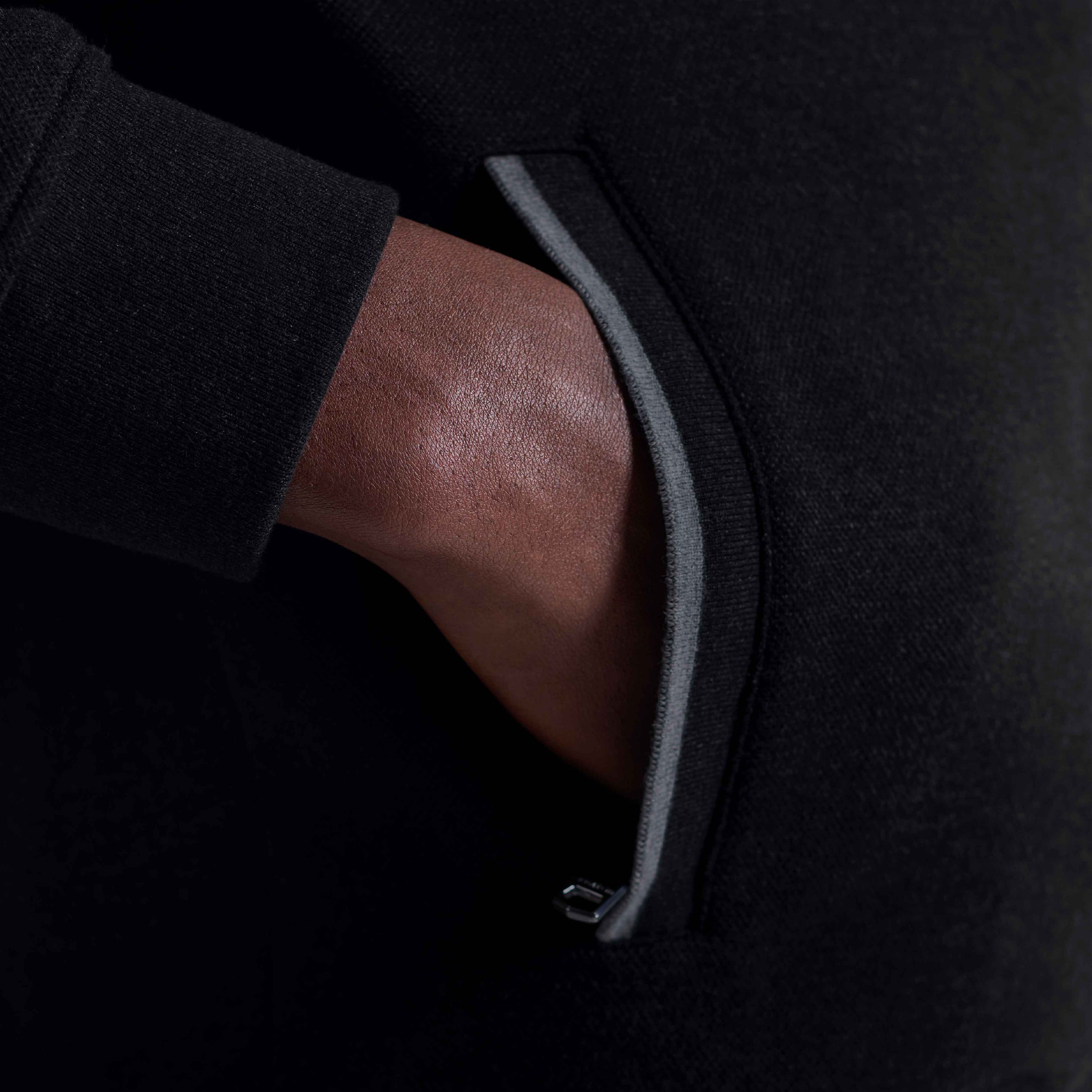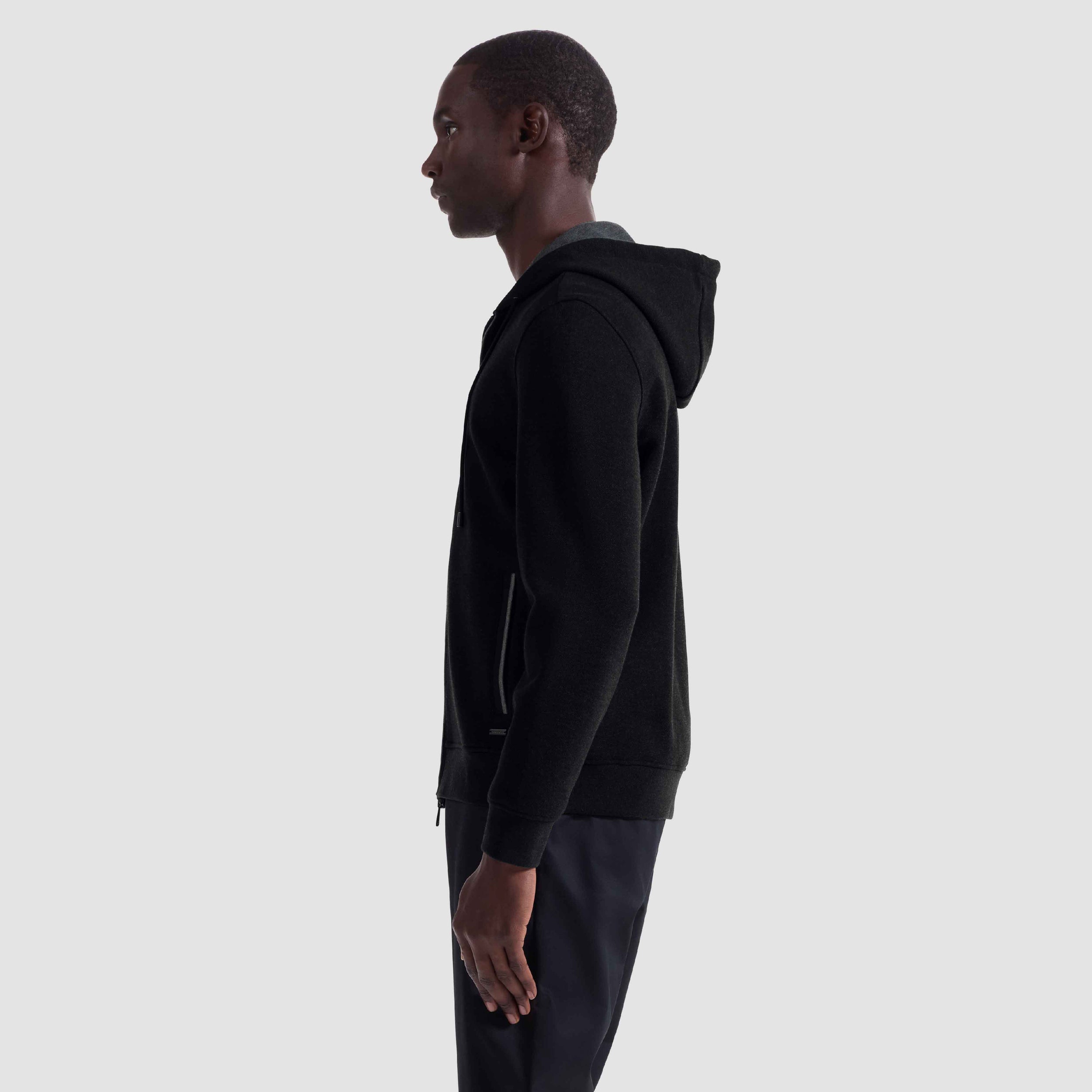 Crafted from a premium performance polyester-cotton blend, this hoodie features a heathered pique exterior with a soft heathered jersey interior for a comfortable, double-faced finish. Designed with a drawstring hood, two-way zipper closure, and two zippered side pockets with covered plackets. Contrast tipping detail on the zipper placket and pocket plackets adds a refined touch.