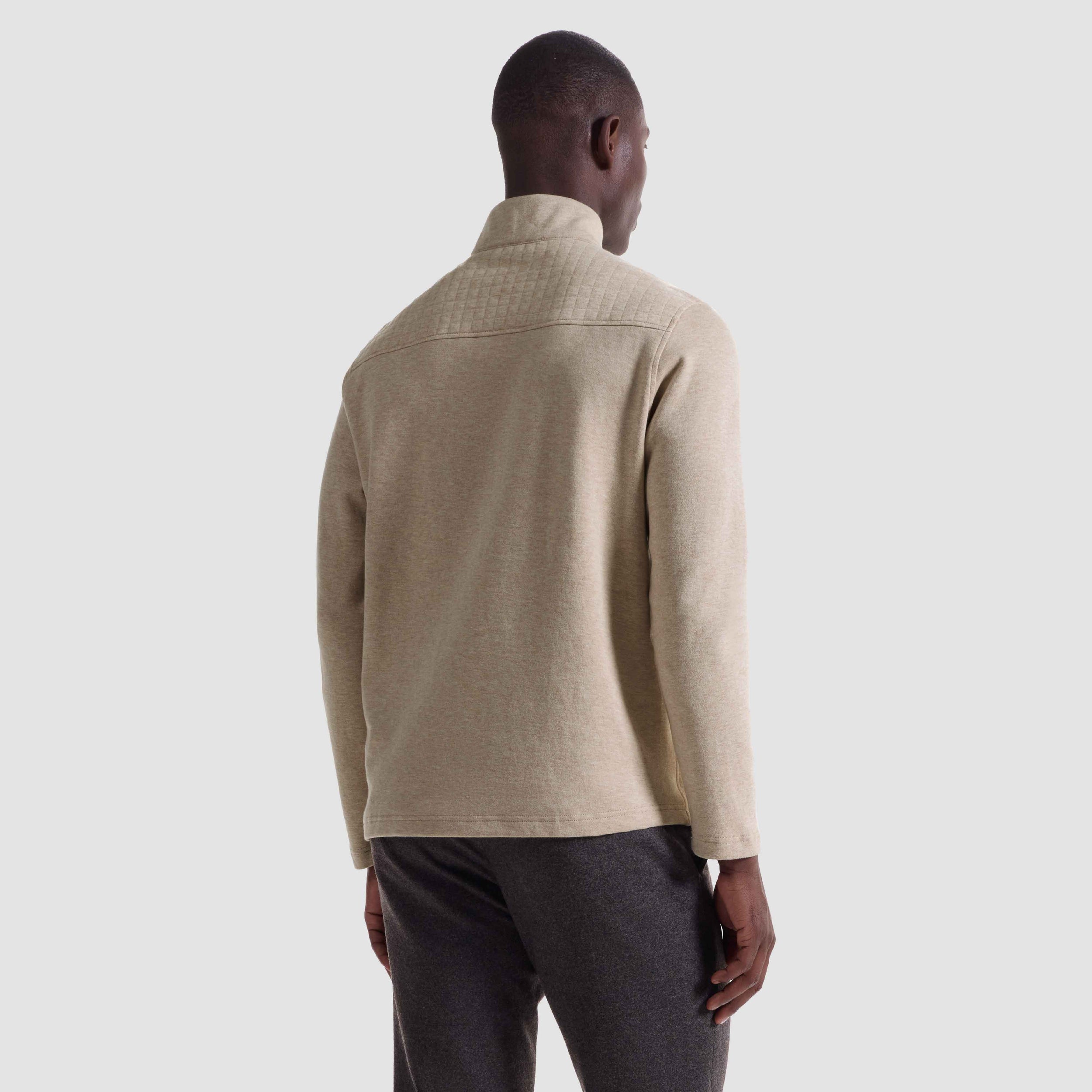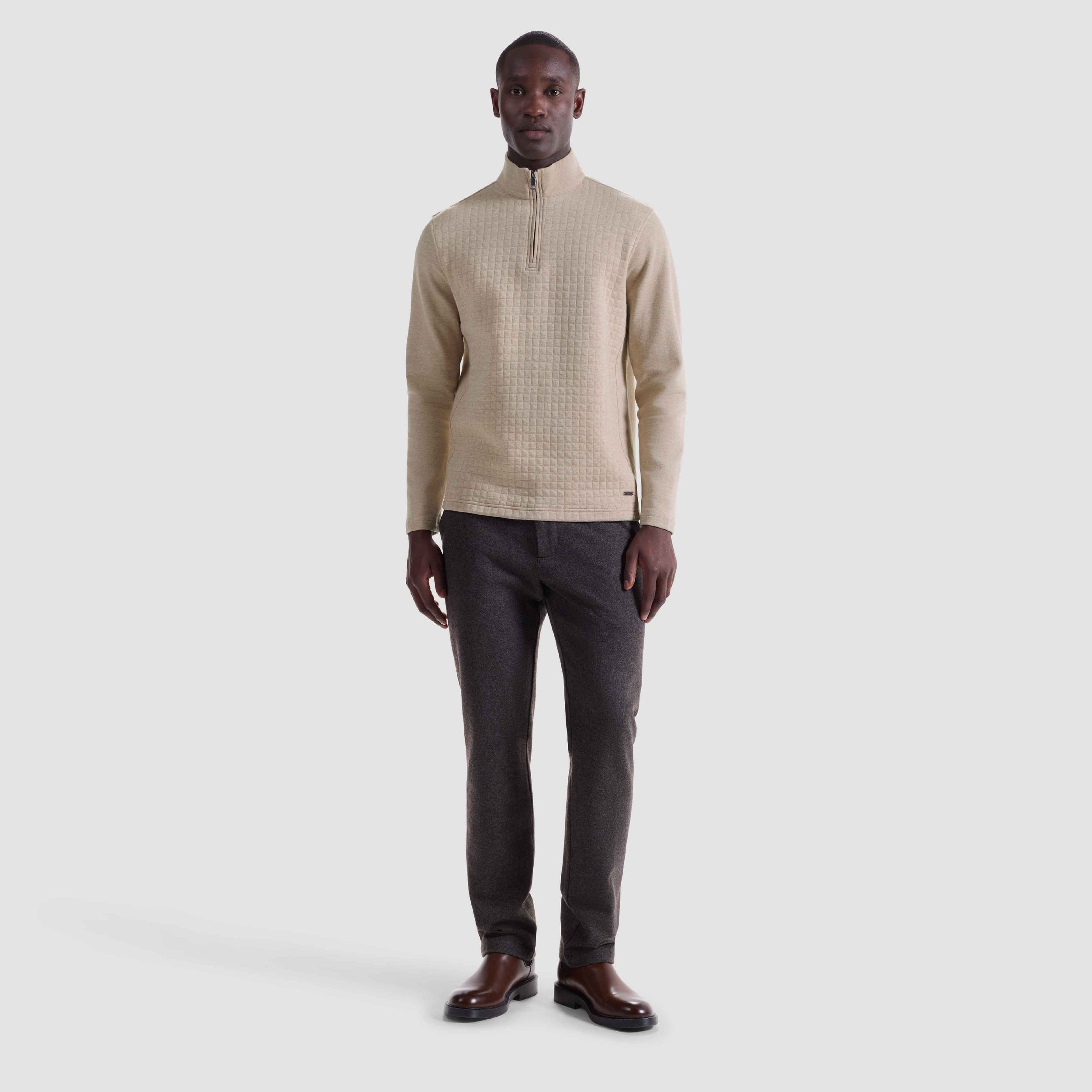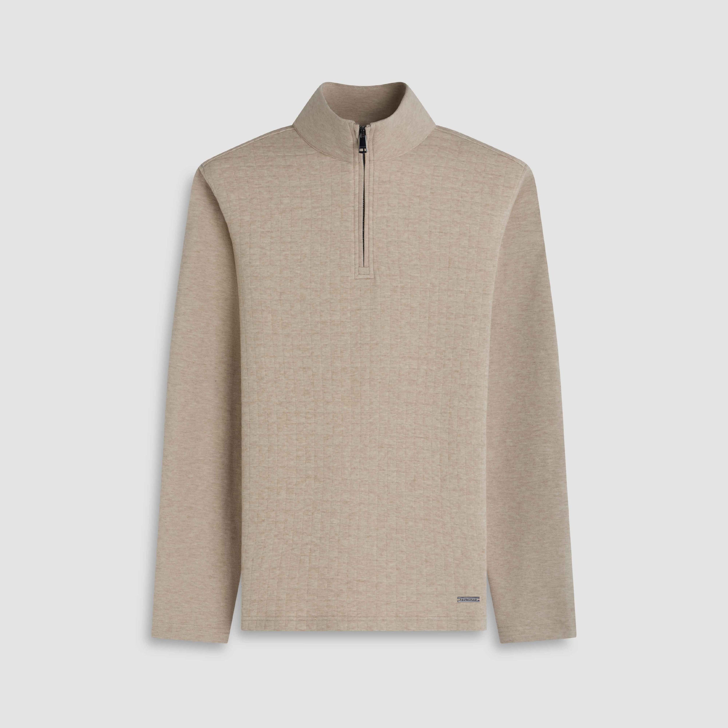 Crafted from a soft cotton blend, this quarter zip features a heathered waffle knit pattern across the front, adding subtle texture and visual interest. The sleeves, back, and mock collar are constructed in a smooth heathered plain knit for a refined contrast. Finished with a straight hem and straight cuffs for a clean, minimalist look.
