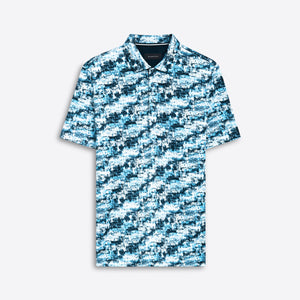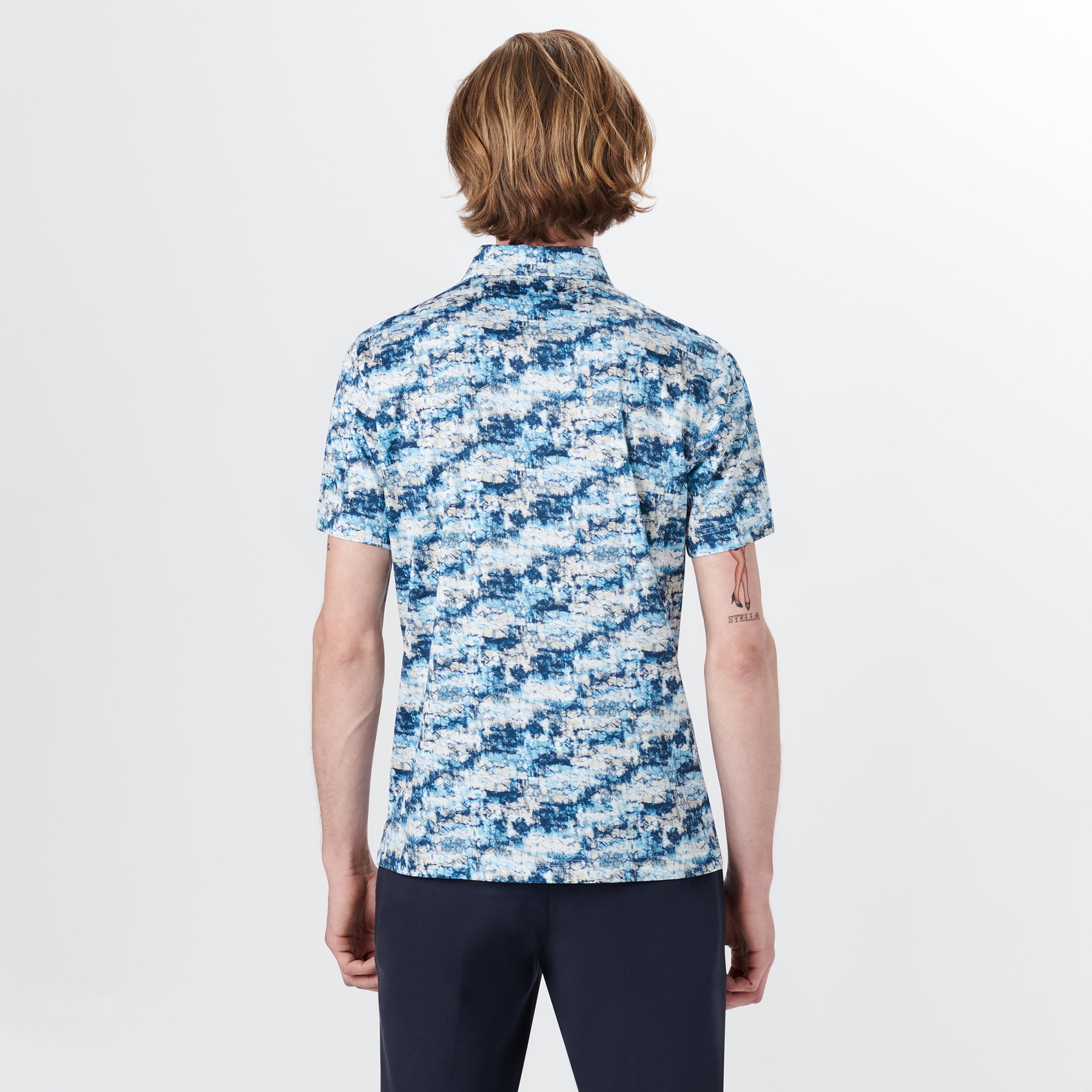 Hendrix short-sleeved polo in 100% mercerized cotton abstract digital print with solid contrast detail, three button placket and self fabric collar.