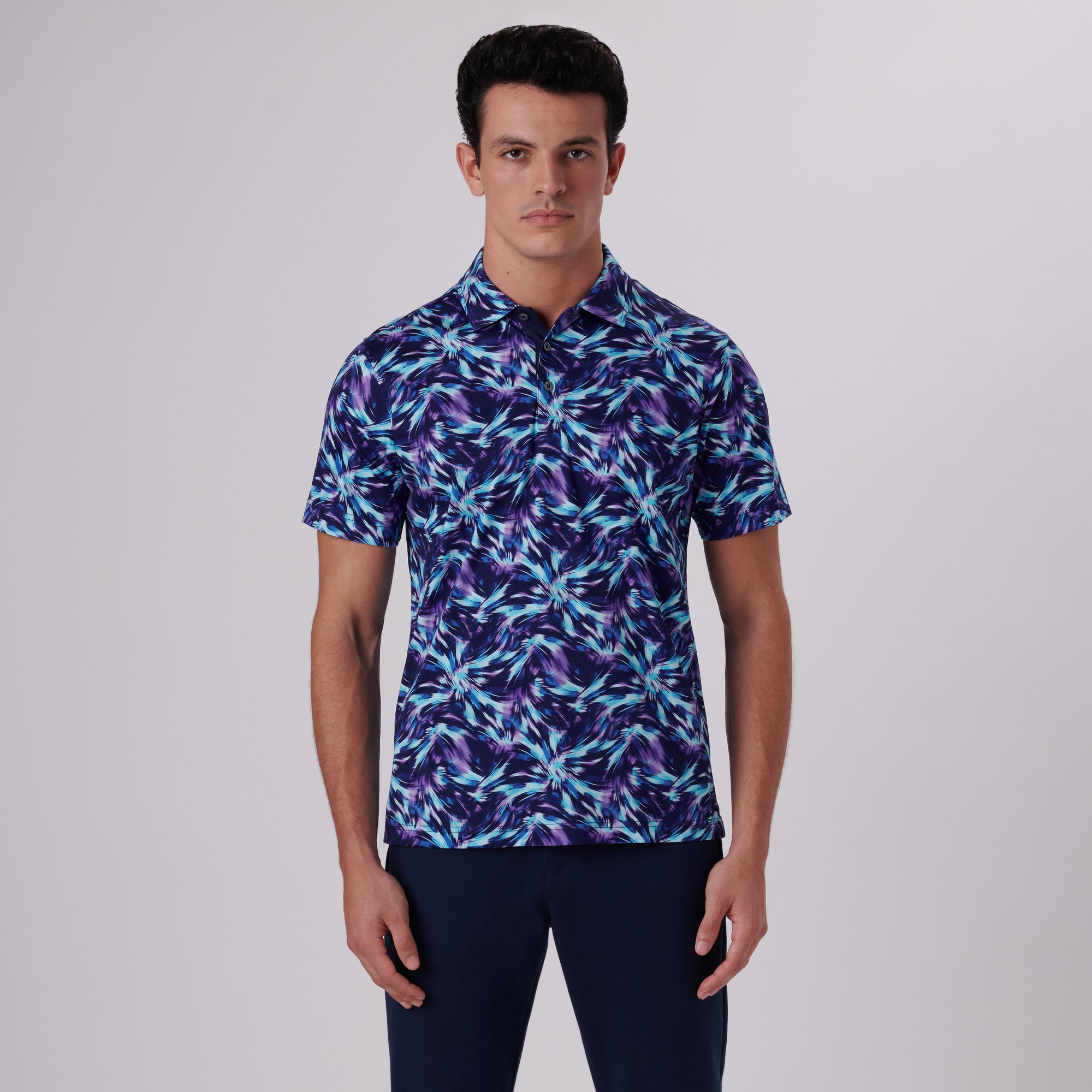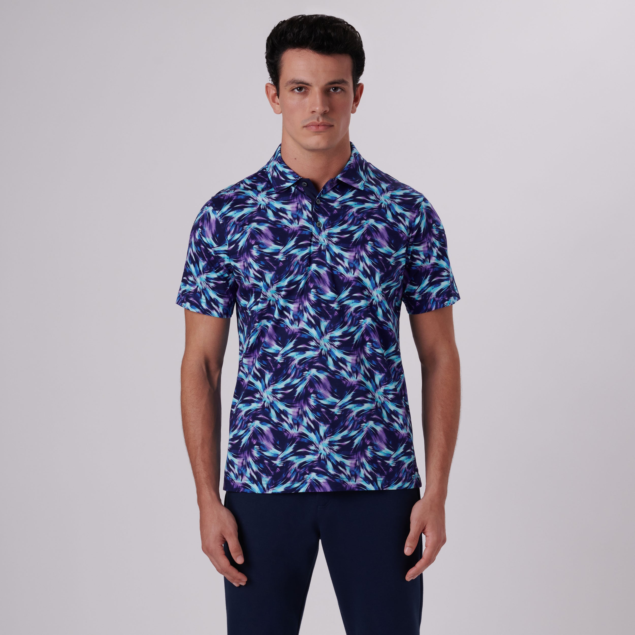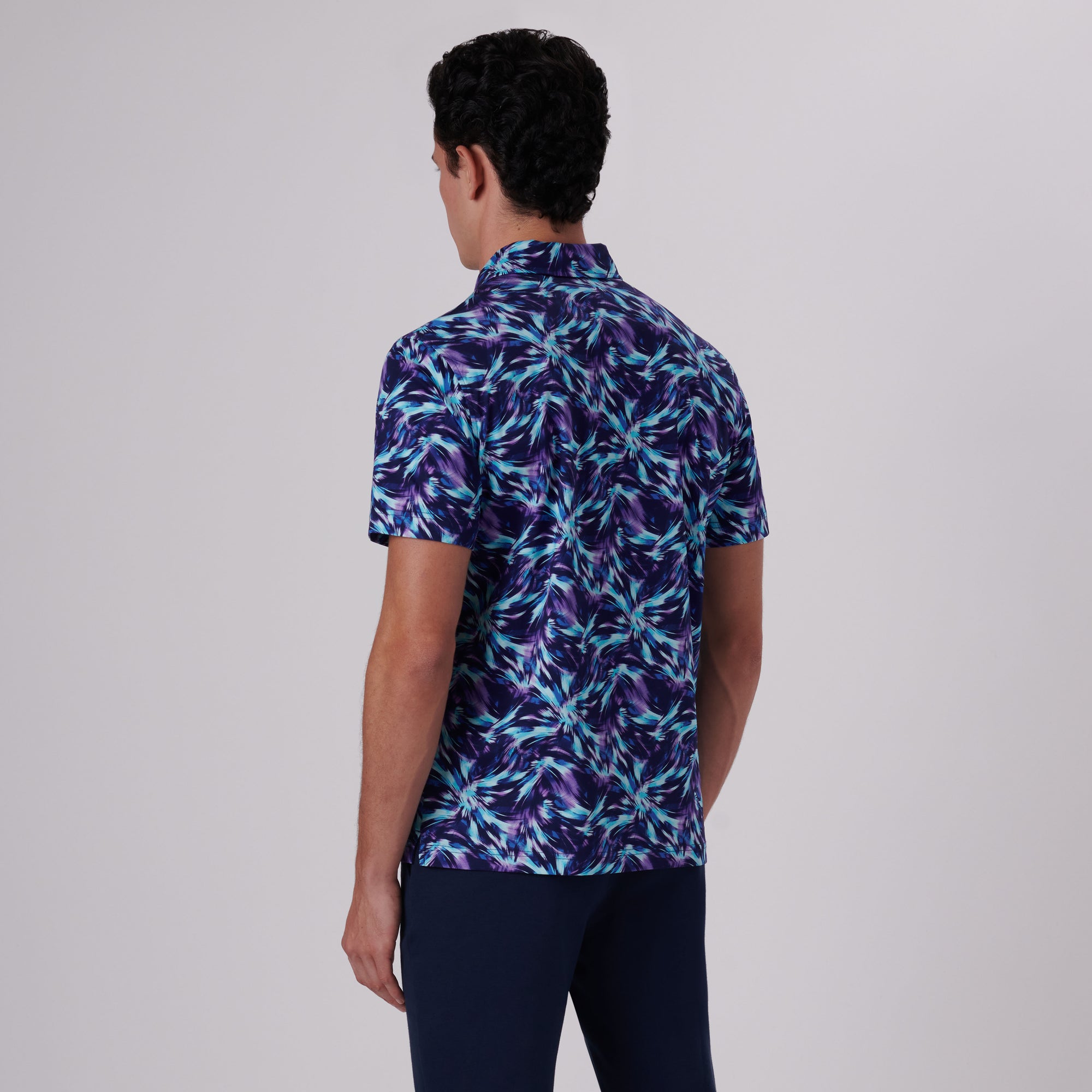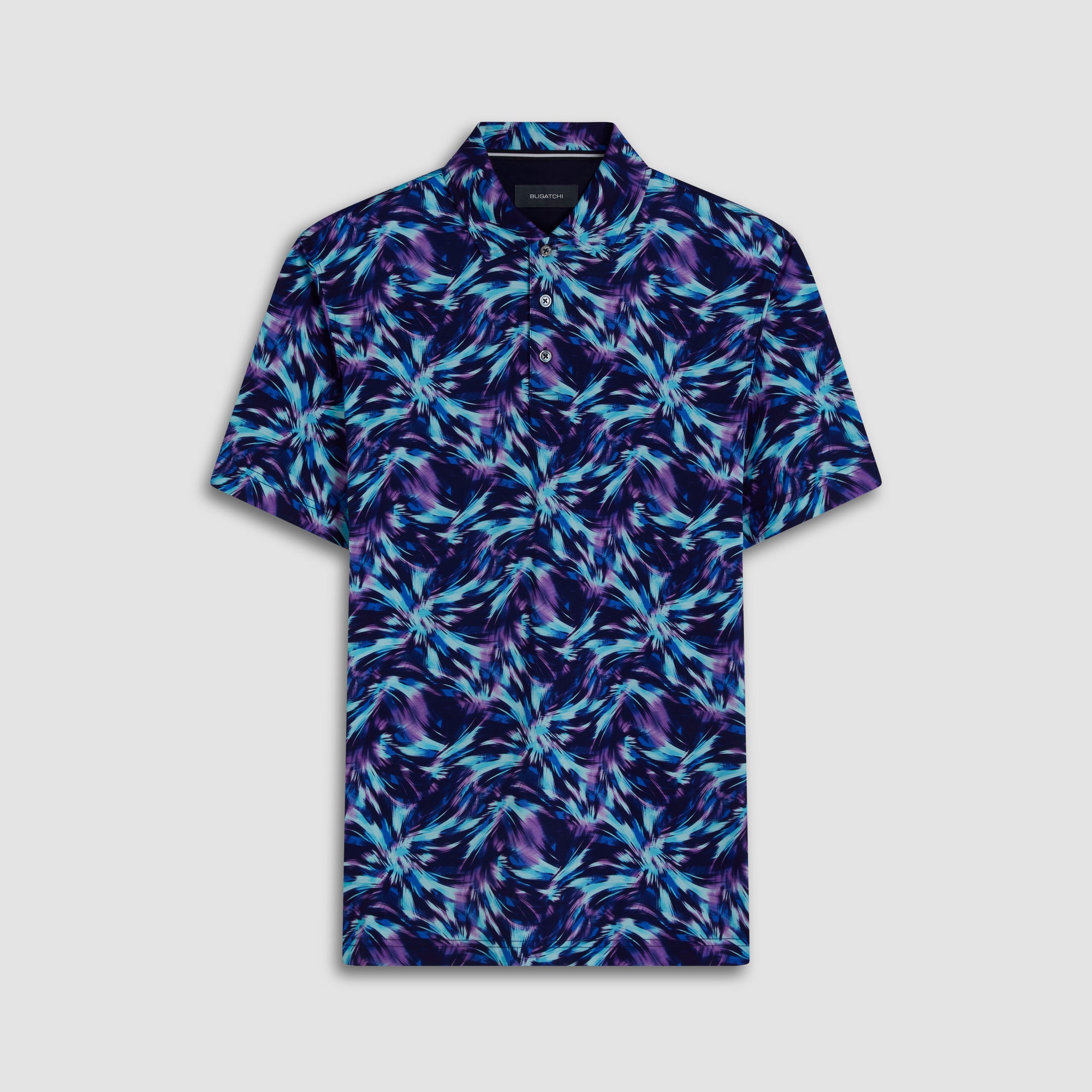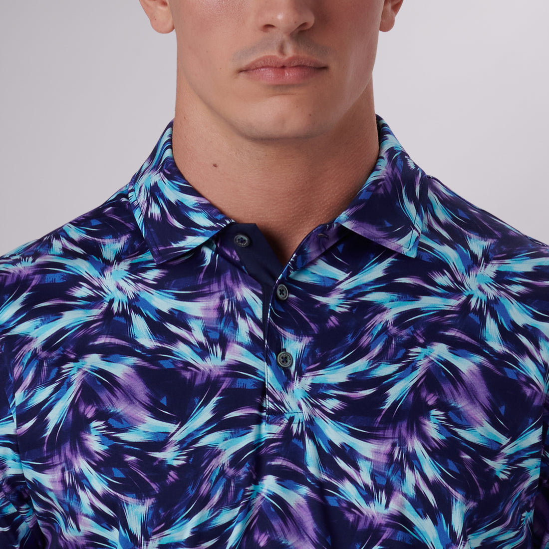 Hendrix abstract short-sleeved polo shirt in 100% mercerized cotton digital print with solid contrast detail, three button placket, genuine shell buttons and self fabric collar.