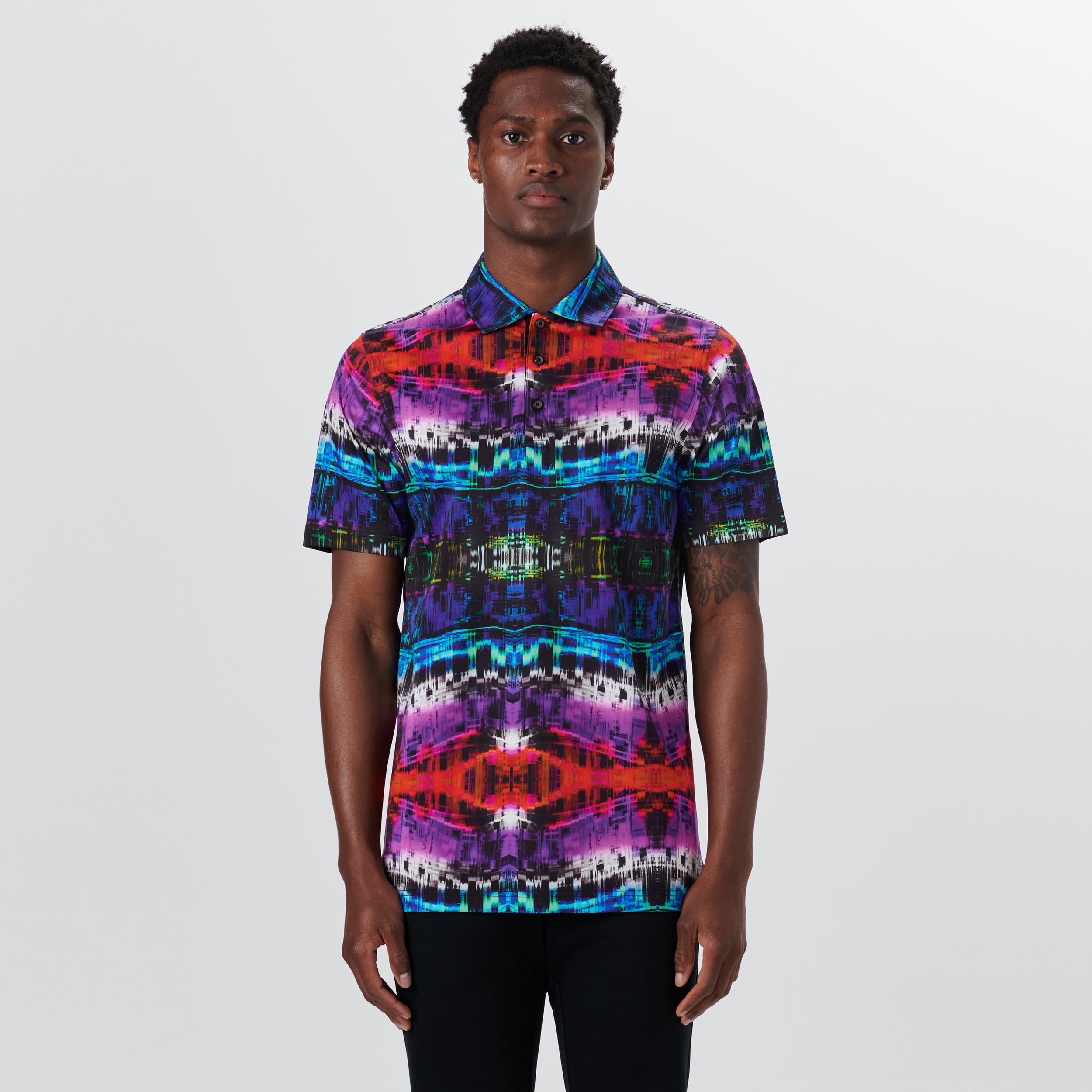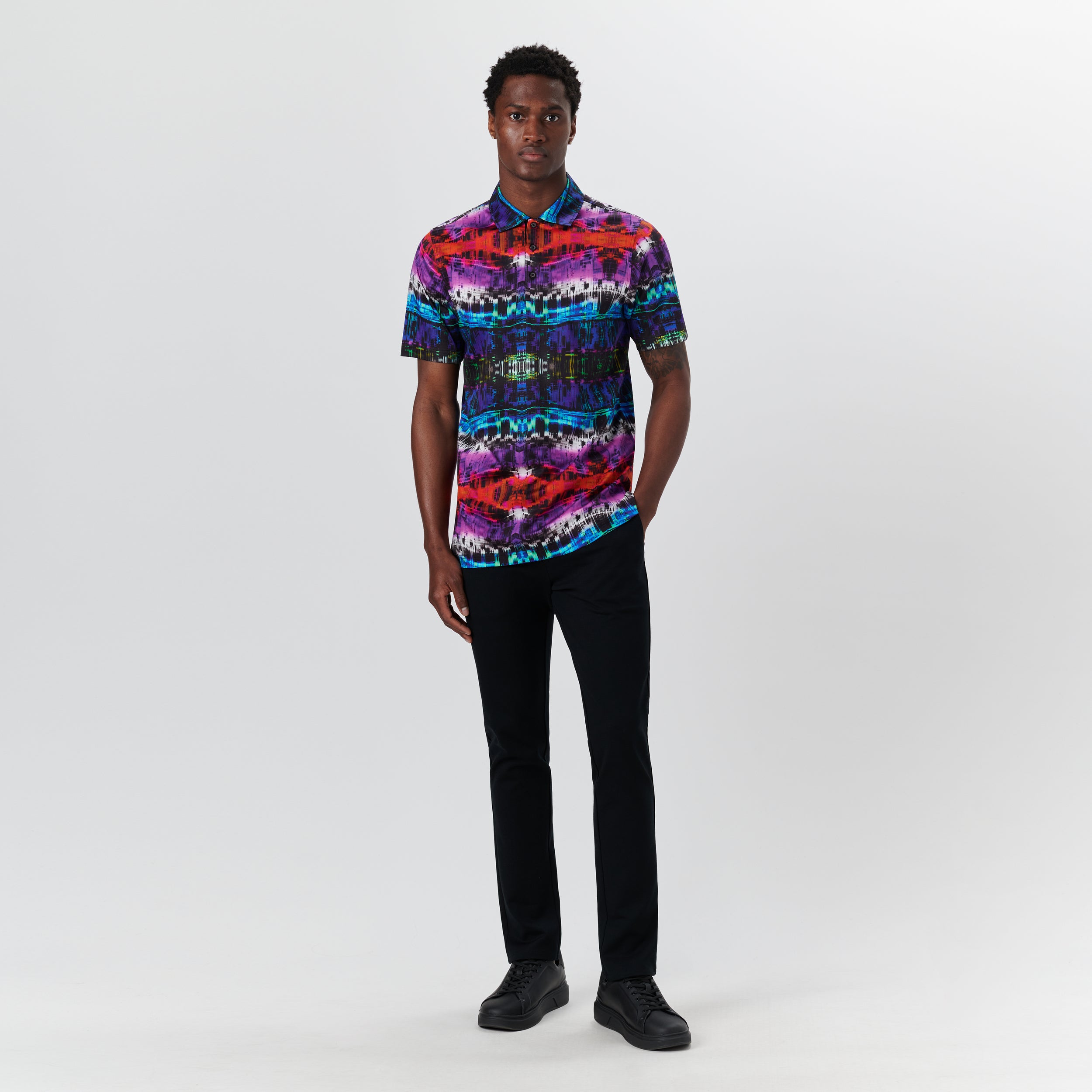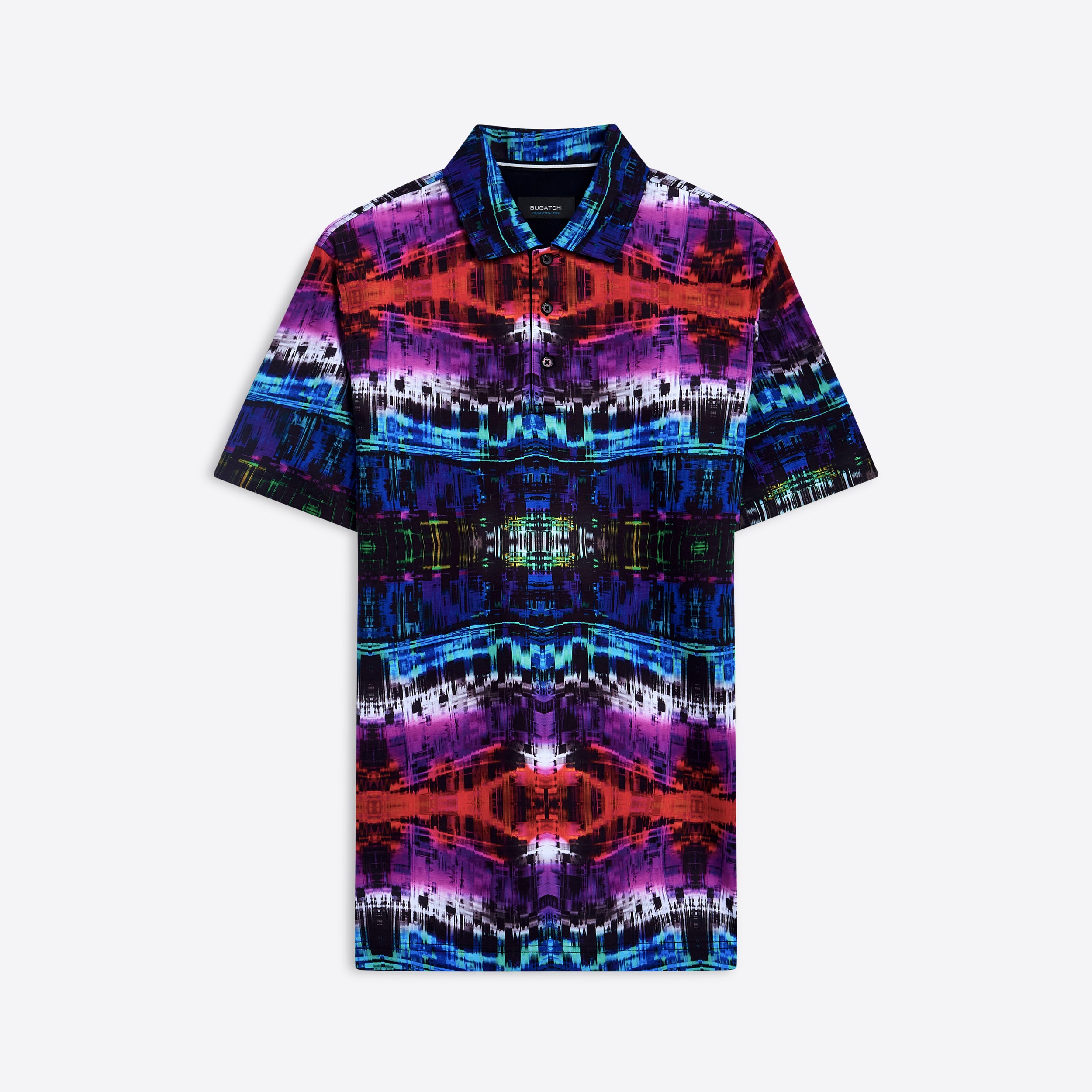 Hendrix short-sleeved polo in 100% mercerized cotton batik digital print with solid contrast detail, three button placket and self fabric collar.