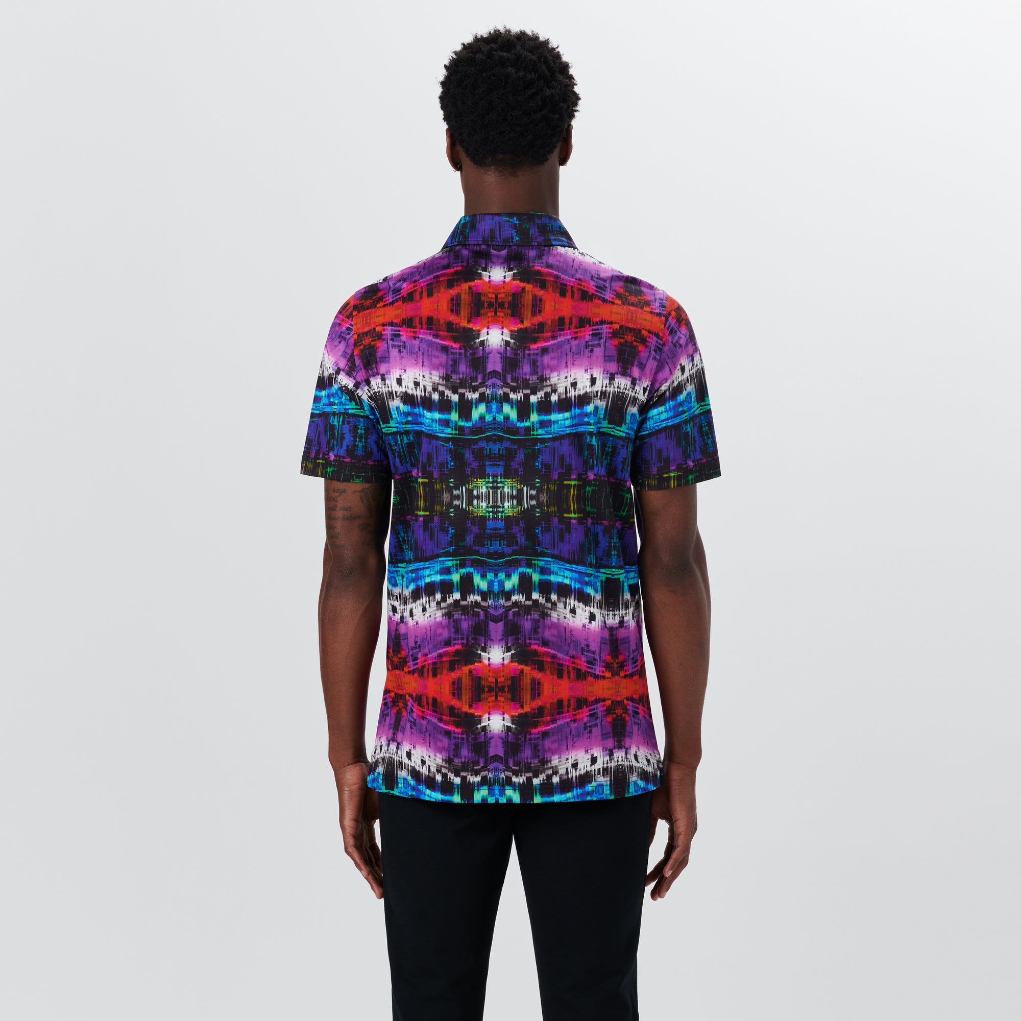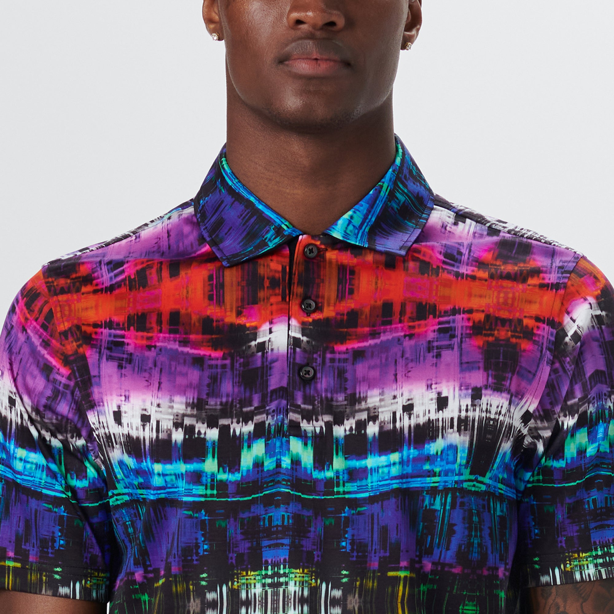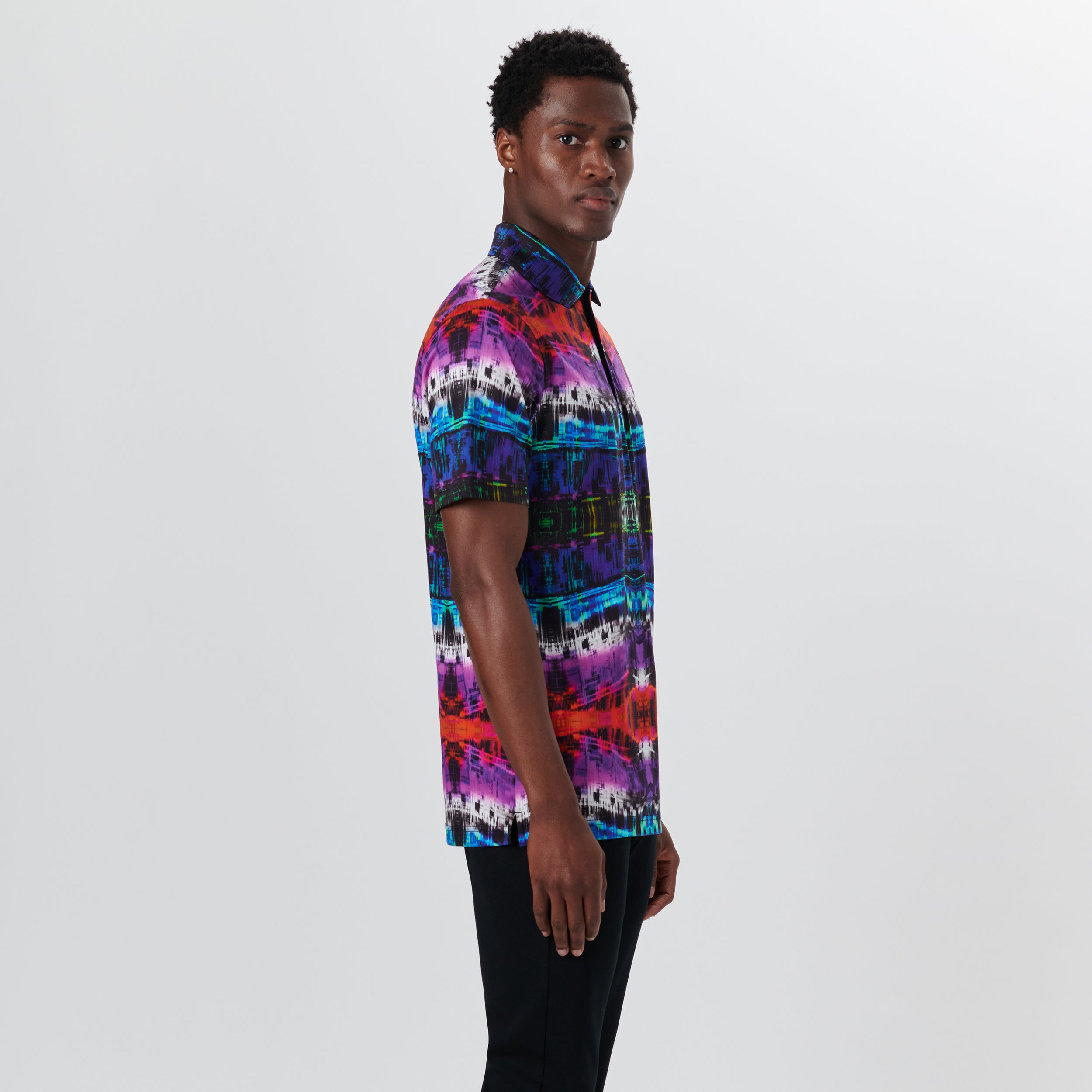 Hendrix short-sleeved polo in 100% mercerized cotton batik digital print with solid contrast detail, three button placket and self fabric collar.