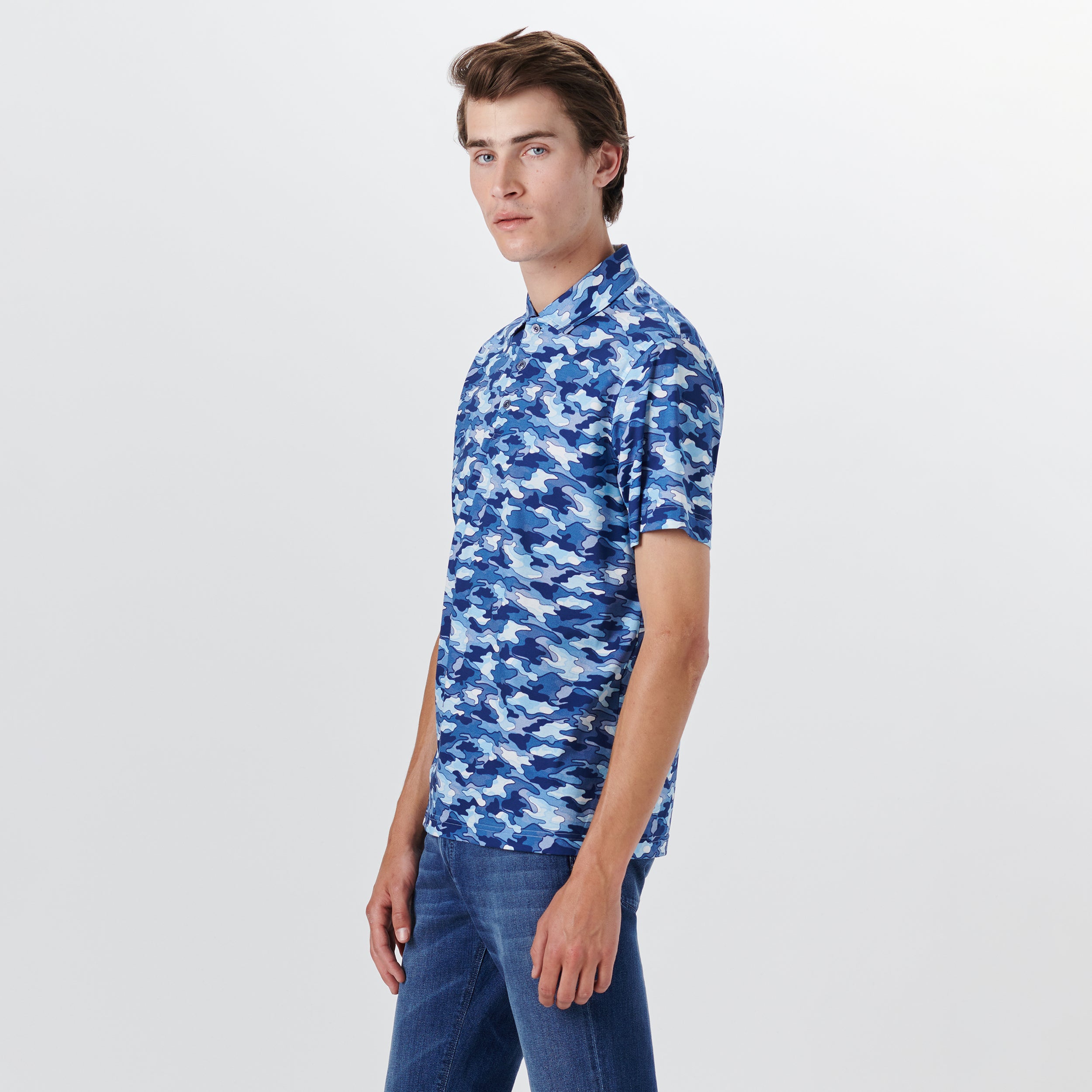 Hendrix short-sleeved polo in 100% mercerized cotton camouflage digital print with solid contrast detail, three button placket and self fabric collar.