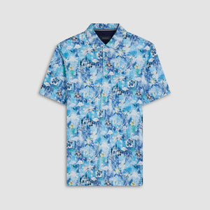 Hendrix flamingo floral short-sleeved polo shirt in 100% mercerized cotton digital print with solid contrast detail, three button placket, genuine shell buttons and self fabric collar.