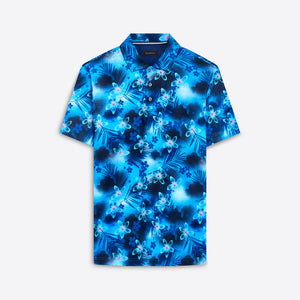Hendrix short-sleeved polo in 100% mercerized cotton floral digital print with solid contrast detail, three button placket and self fabric collar.