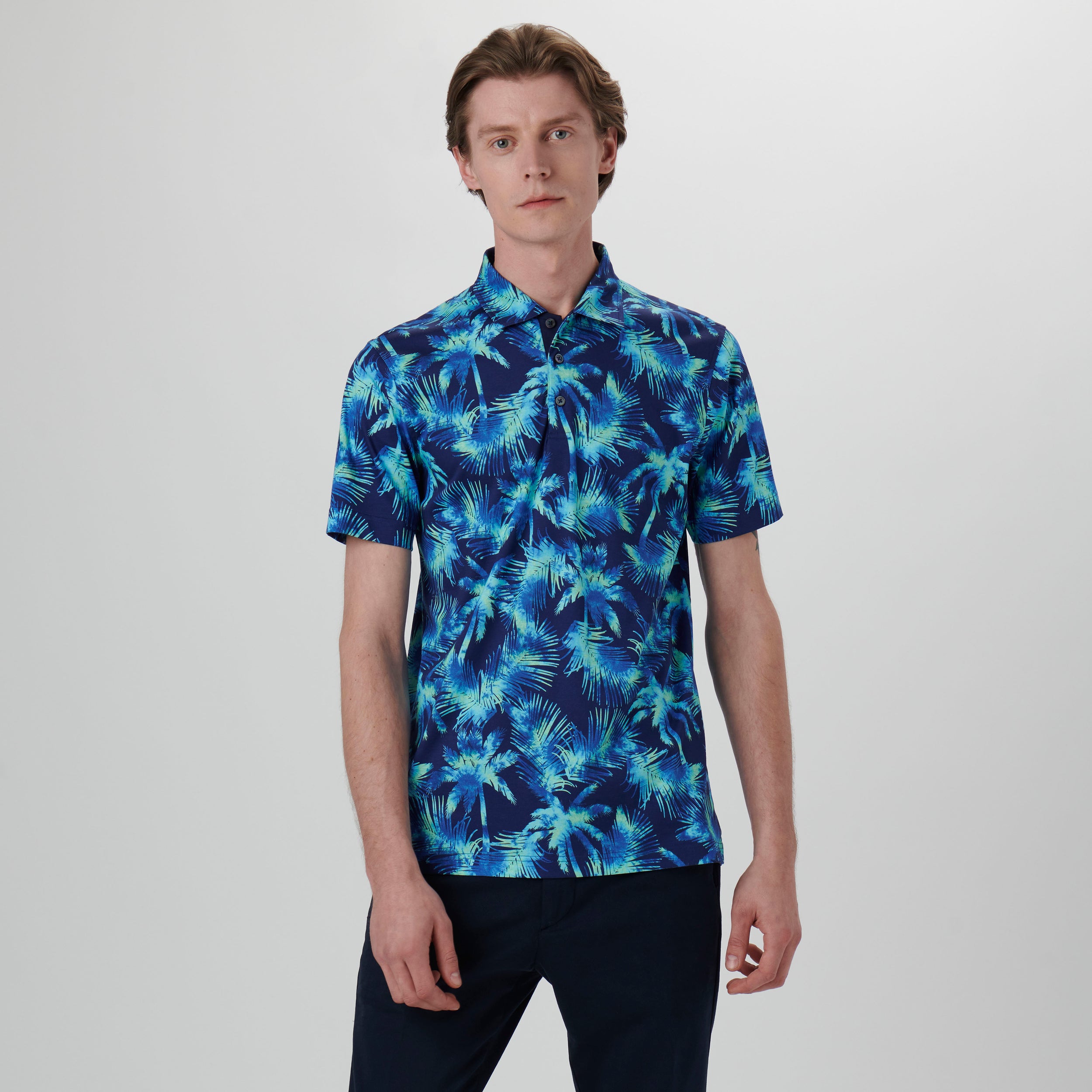 Hendrix polo shirt in digital palm tree print 100% mercerized pima cotton with special soft finish, short sleeves, solid contrast detail, three button placket, genuine shell buttons and self fabric collar.