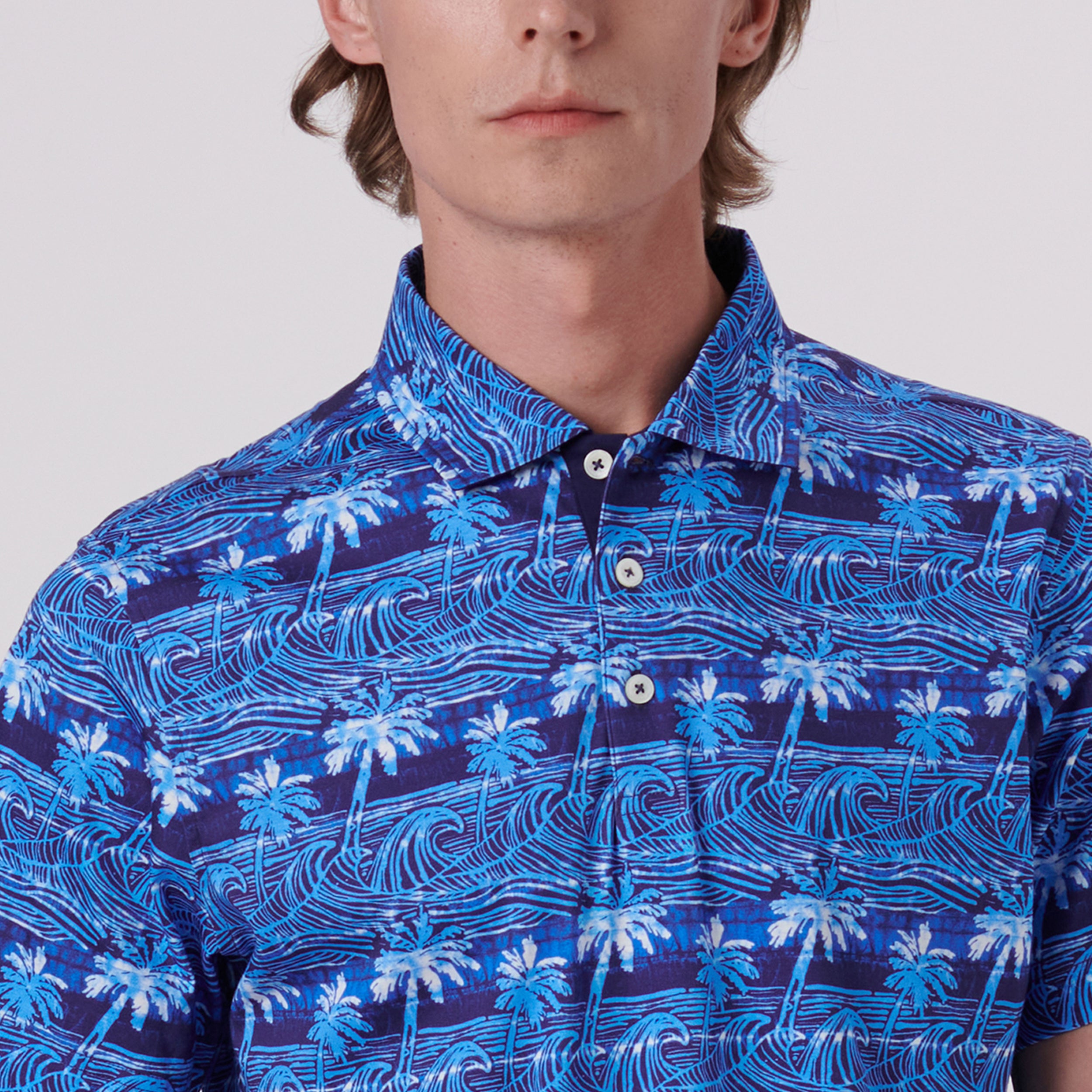 Hendrix palms and waves short-sleeved polo shirt in 100% mercerized cotton digital print with solid contrast detail, three button placket, genuine shell buttons and self fabric collar.