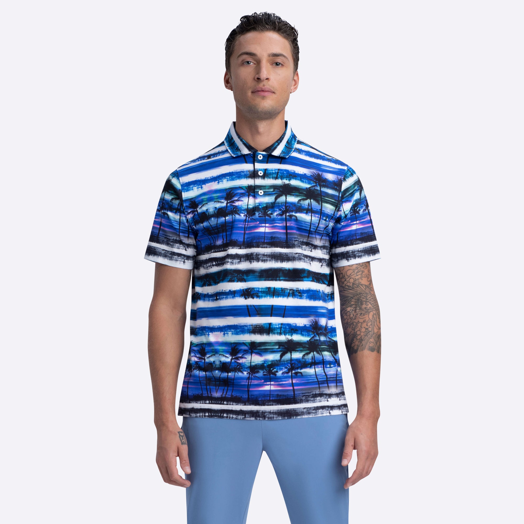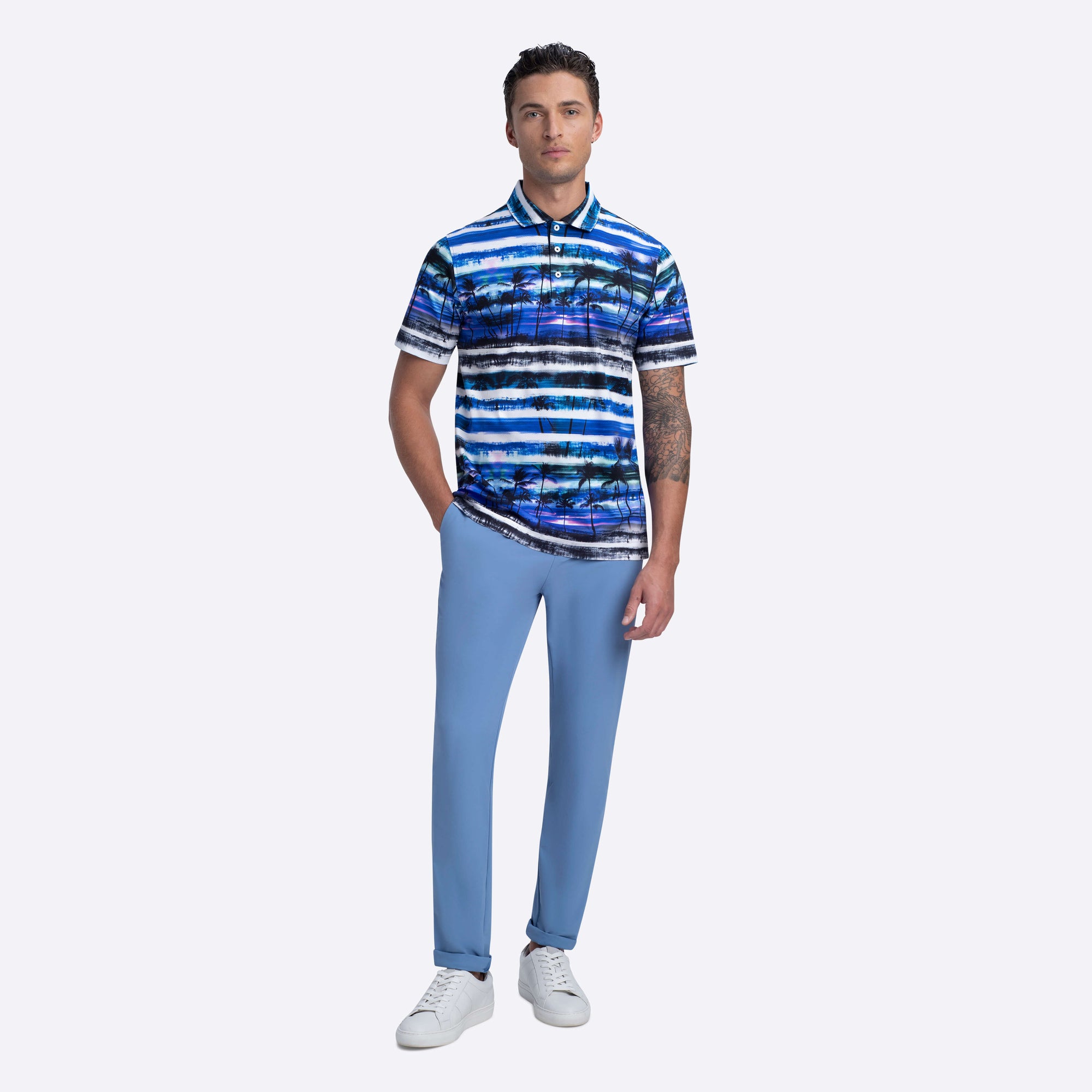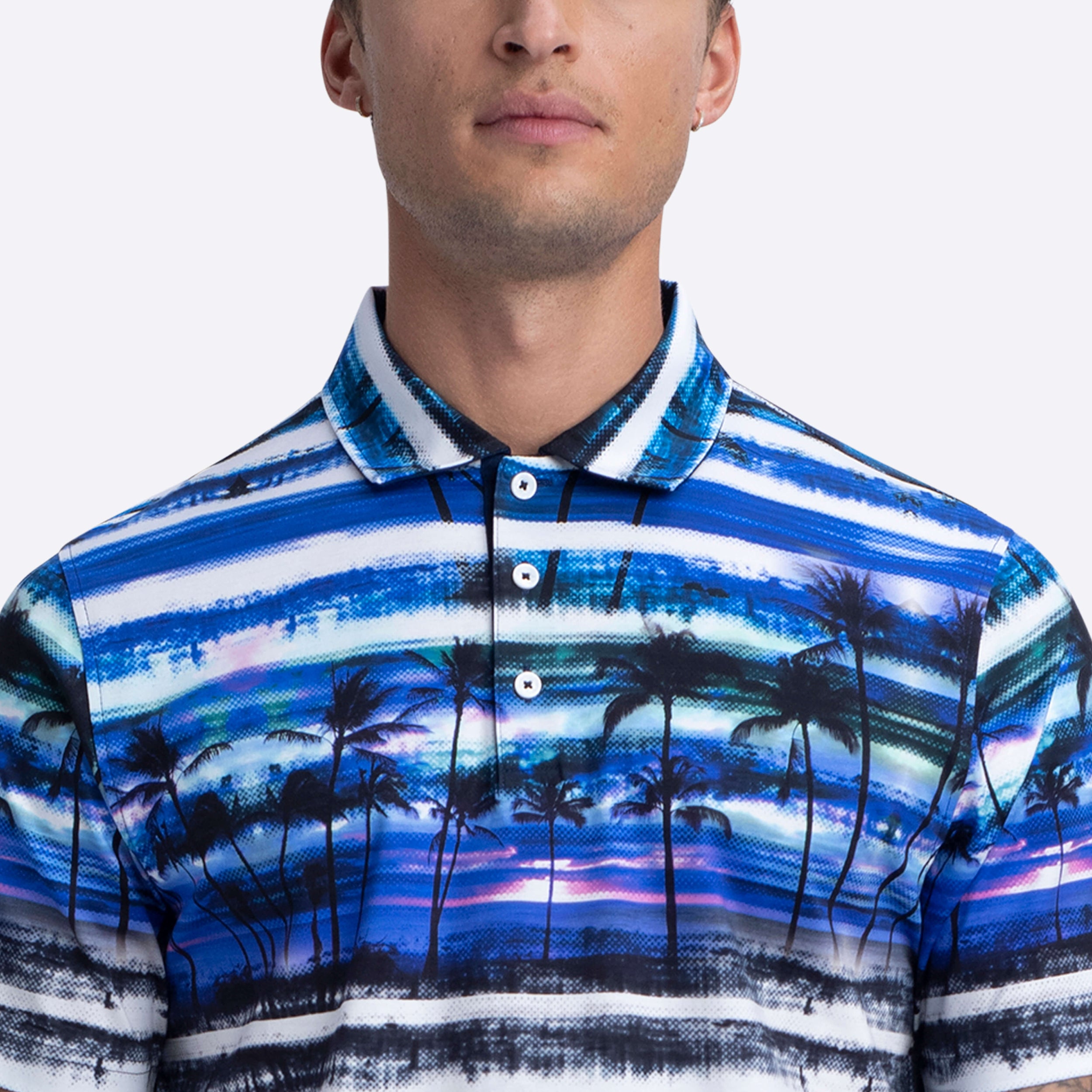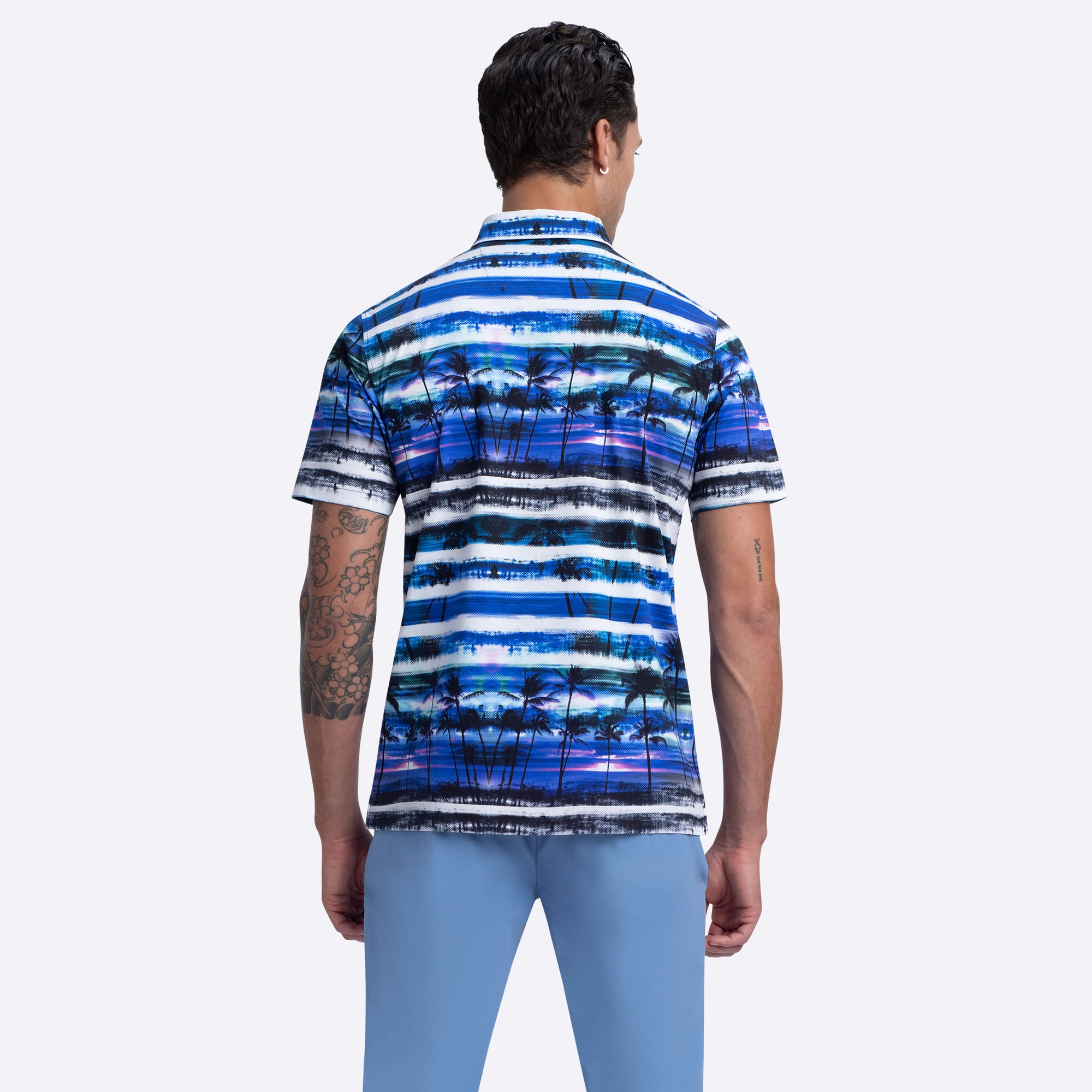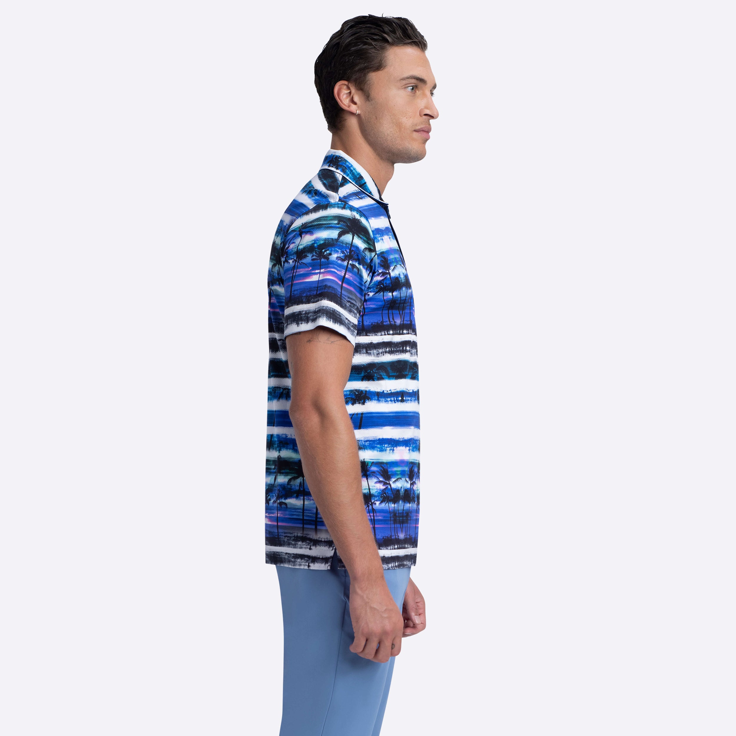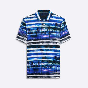 Hendrix short-sleeved polo in striped palm tree digital print 100% cotton with solid contrast three button placket and self fabric collar.