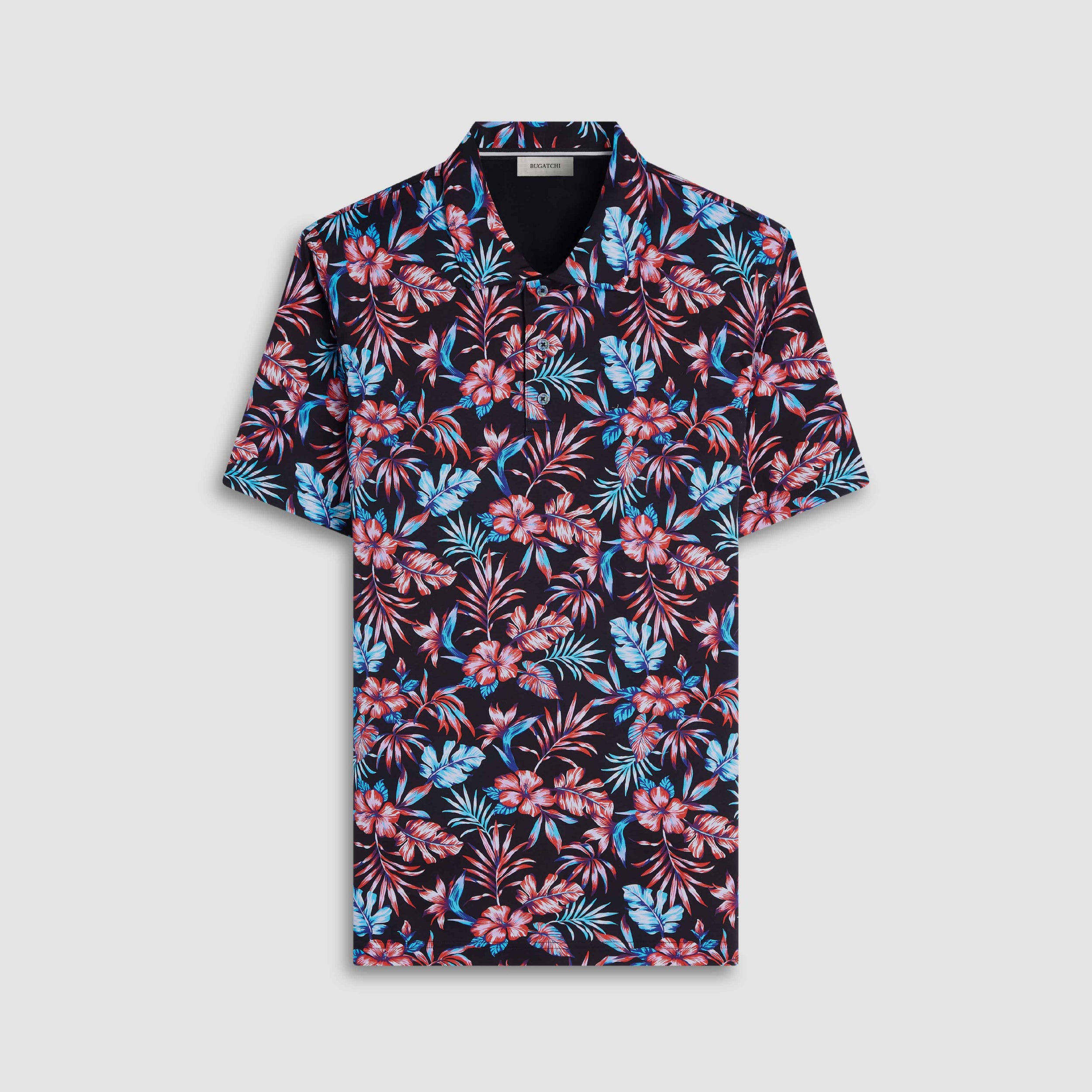 The Hendrix digital tropical floral print polo is crafted from ultra-soft 100% Pima cotton finished with a premium Turkish process that enhances softness, durability, and breathability. With a three-button placket, mother-of-pearl buttons, and a self-fabric collar, this polo delivers a perfect balance of style, comfort and function, making it an ideal choice for resort wear, casual outings, and days on the golf course.
