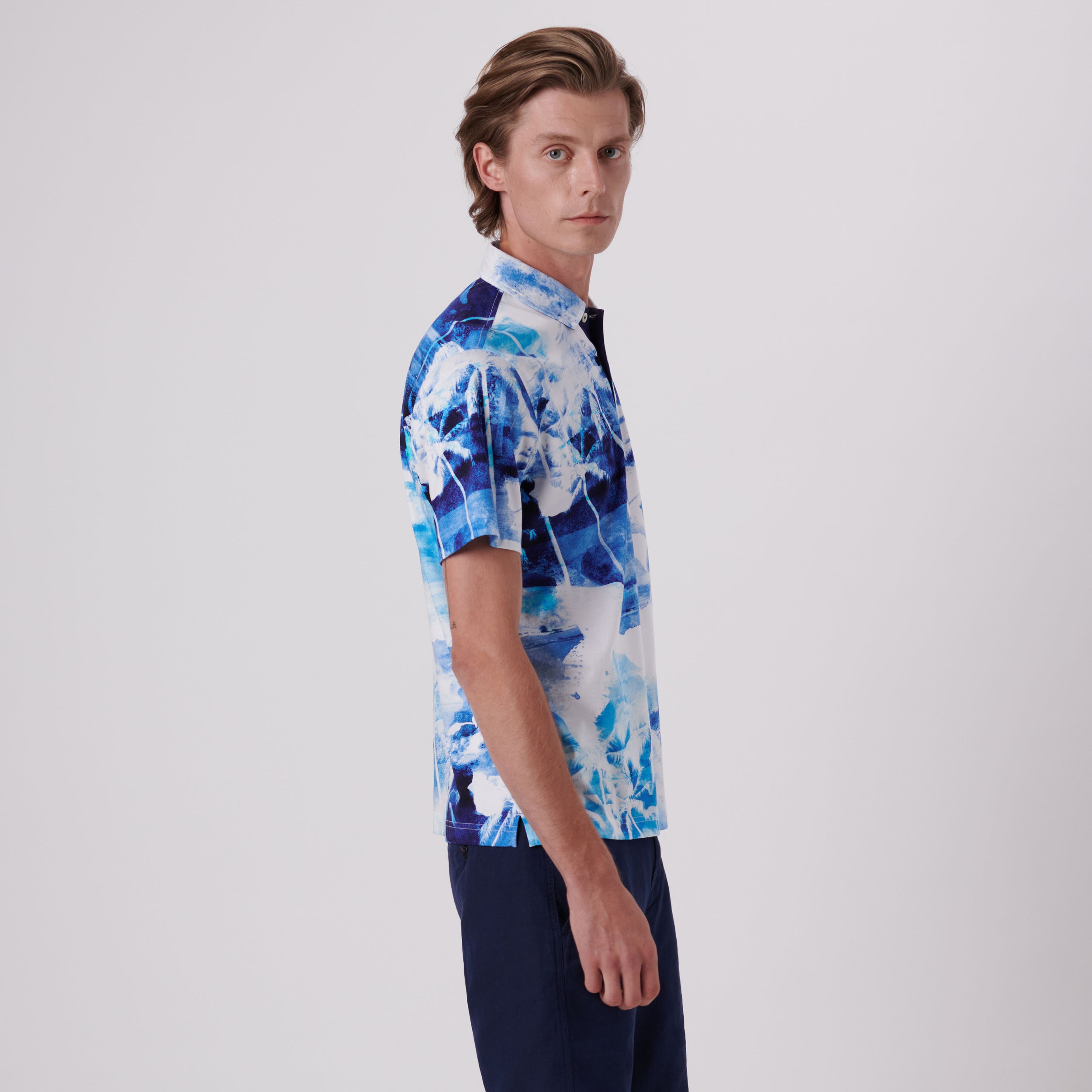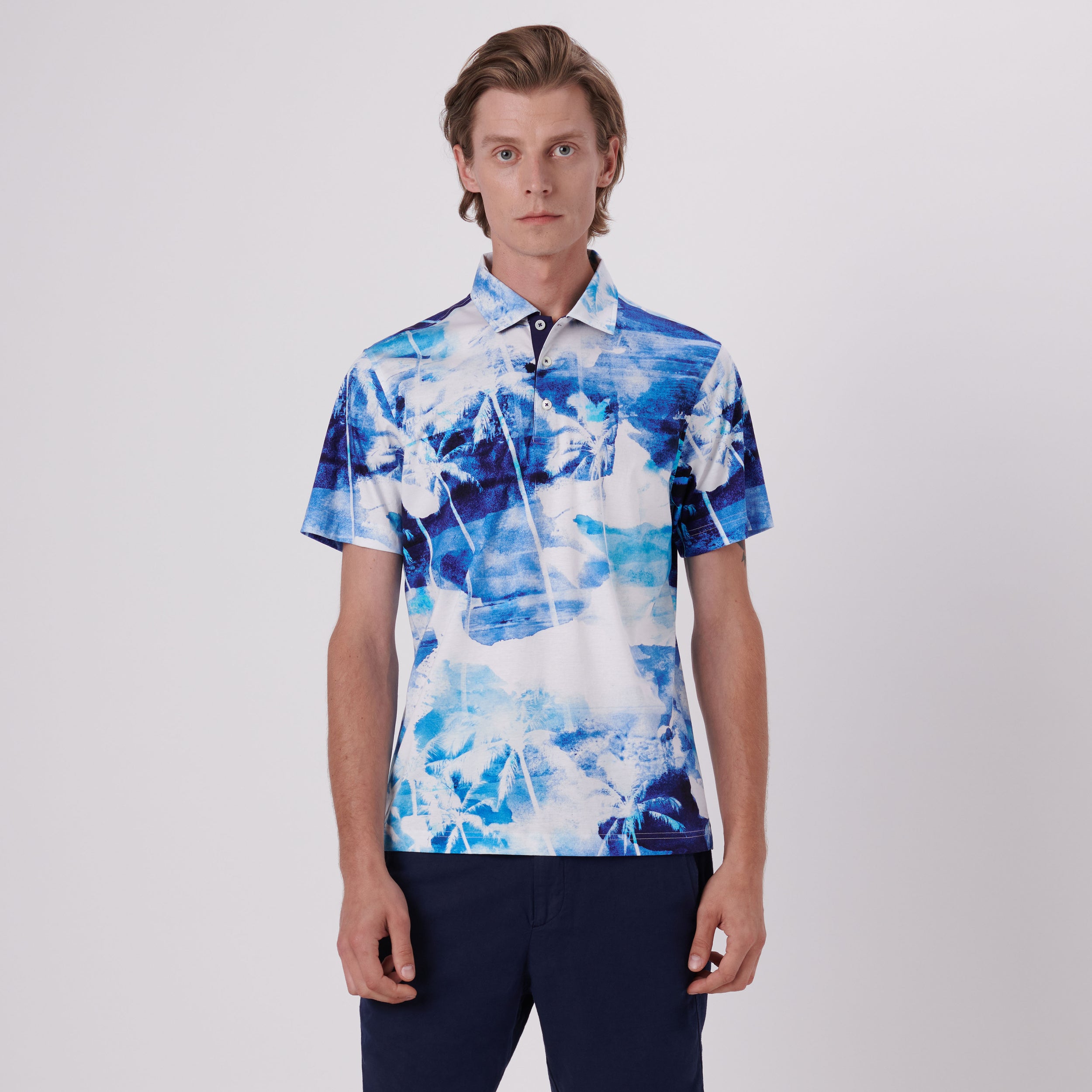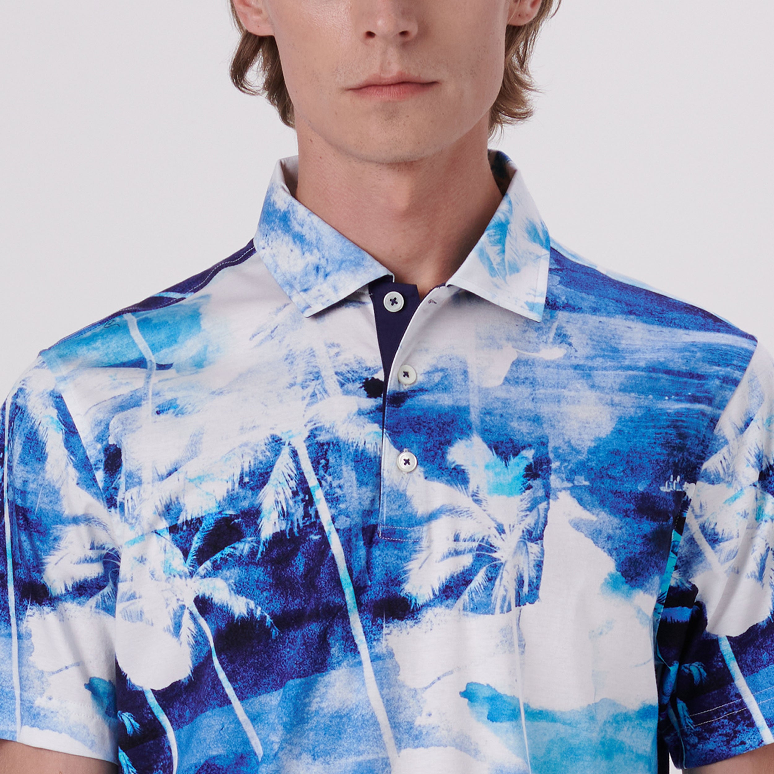 Hendrix watercolor tropics short-sleeved polo shirt in 100% mercerized cotton digital print with solid contrast detail, three button placket, genuine shell buttons and self fabric collar.