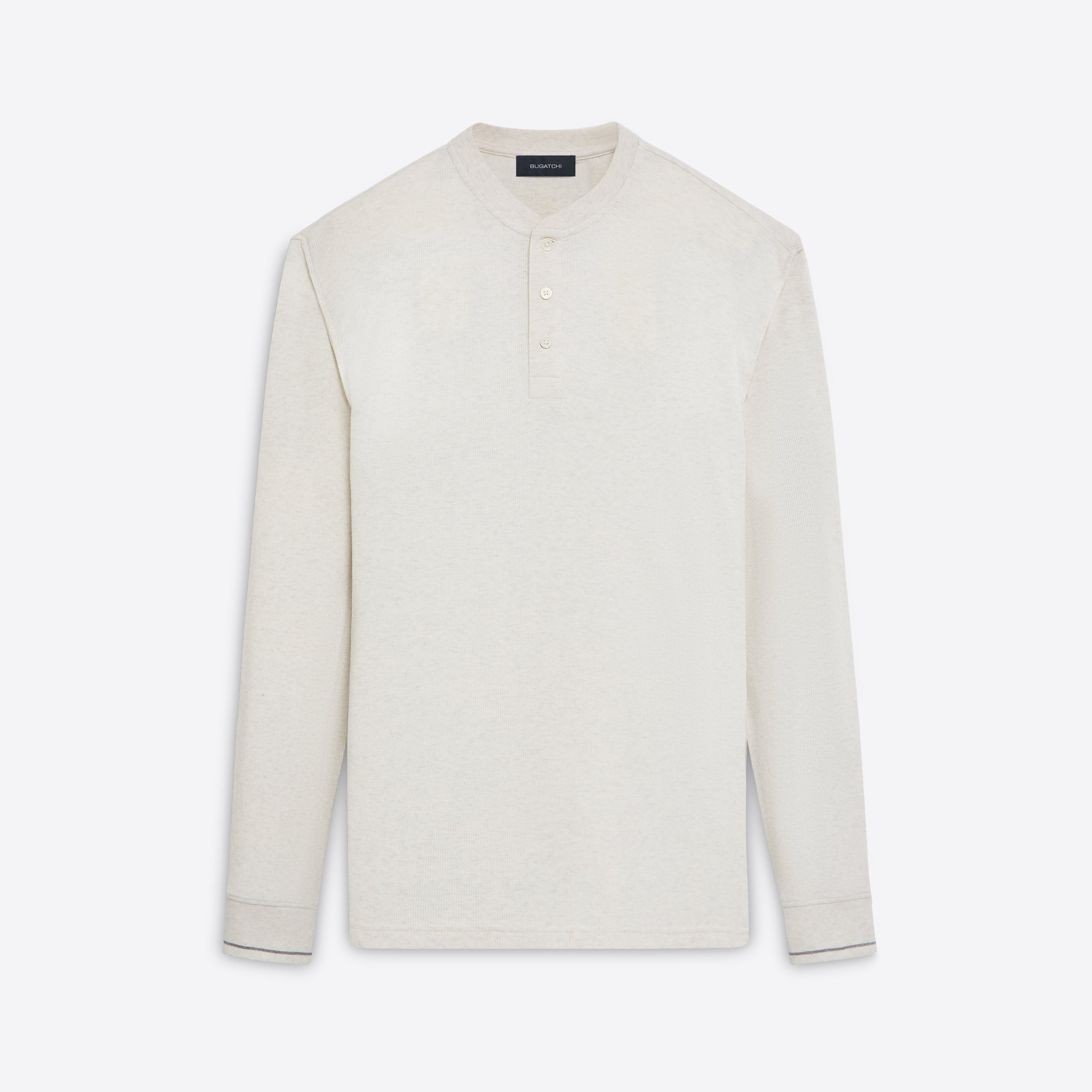 Long sleeve henley in 100% cotton waffle knit with three button placket and ribbed collar and cuffs.
