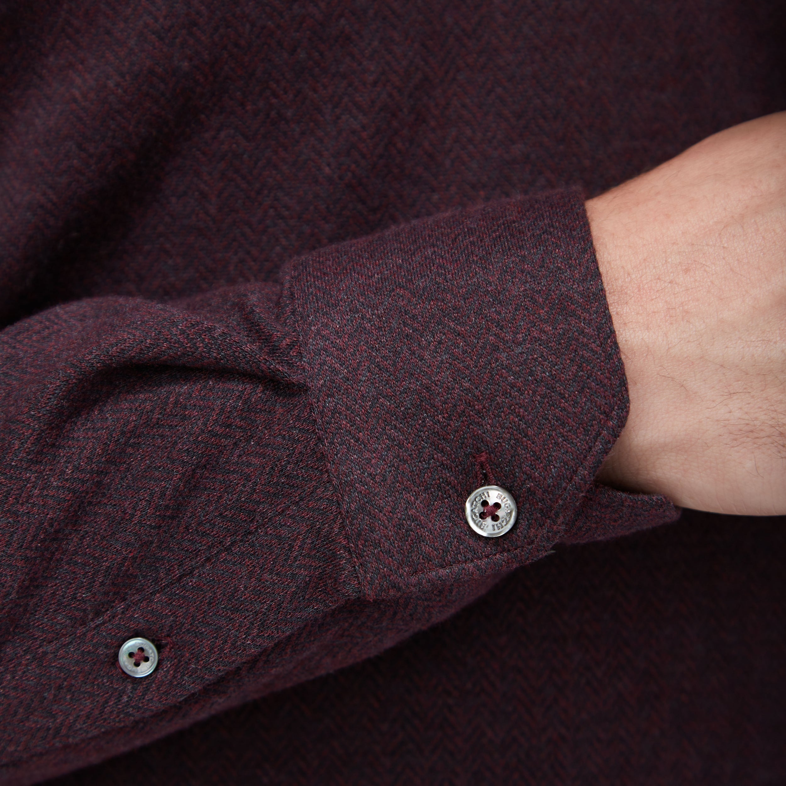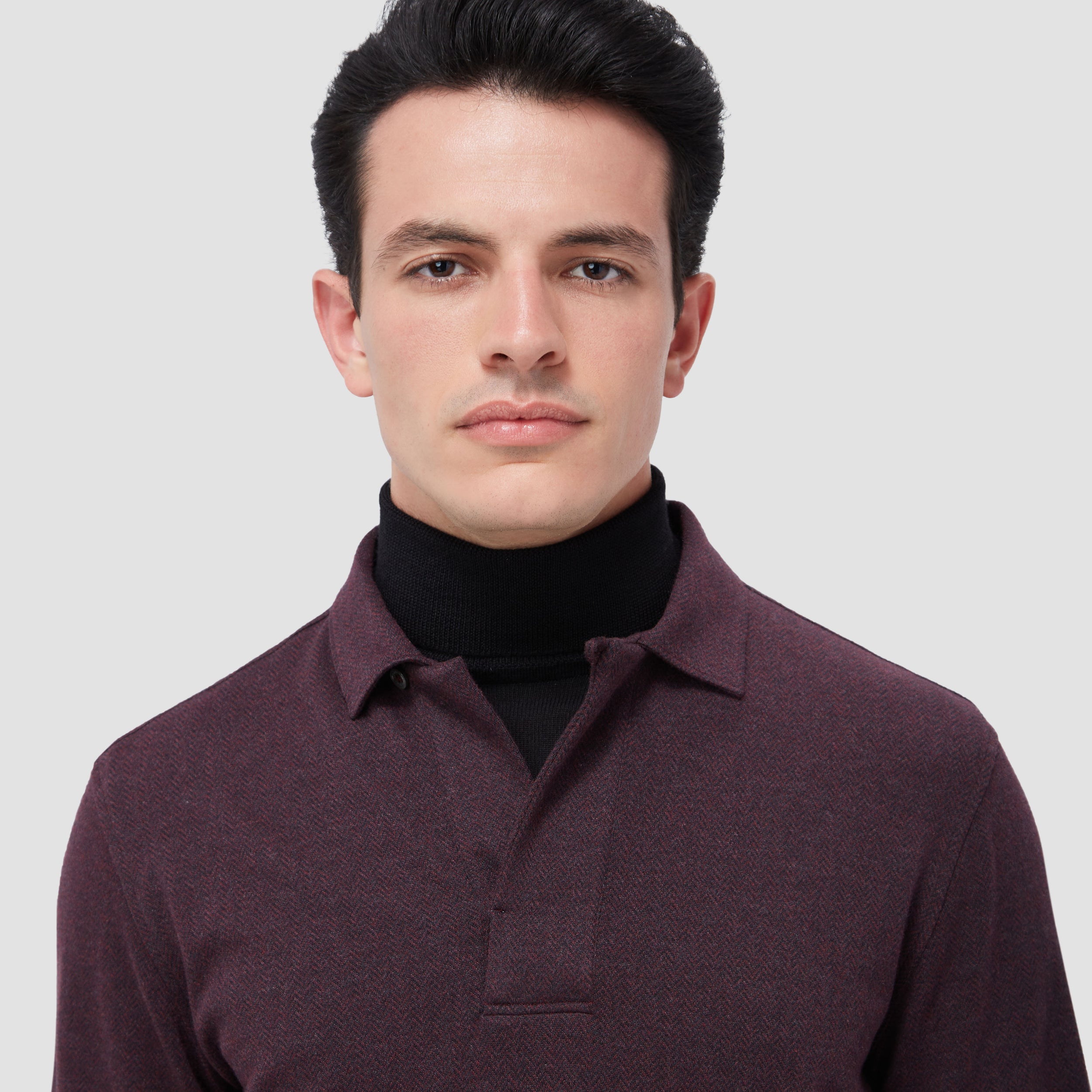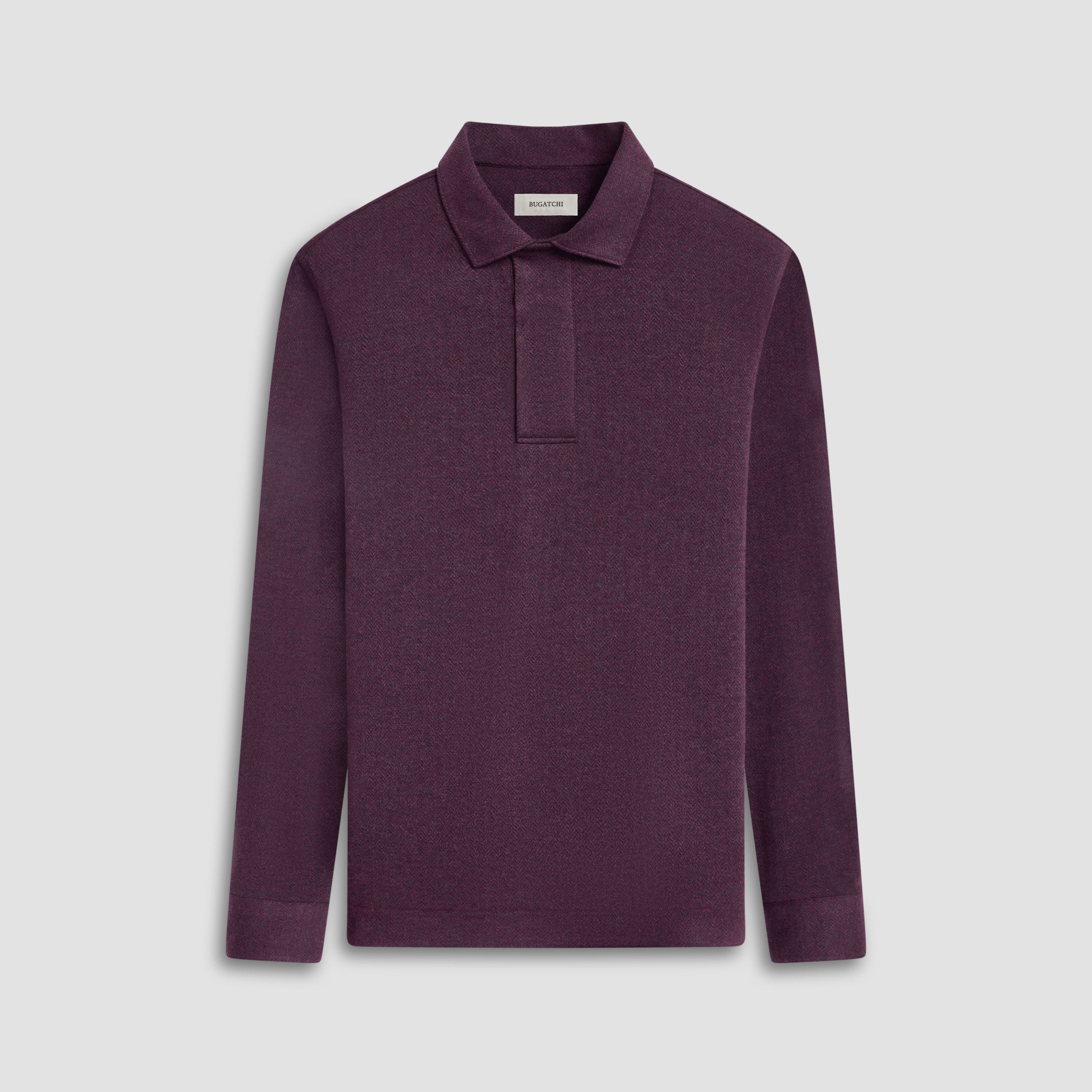 Embrace timeless elegance with this long sleeve polo shirt, expertly crafted from a soft cotton blend with a distinctive herringbone pattern. This elegant polo features a three-button covered placket and a self-fabric collar. Perfect for any occasion.