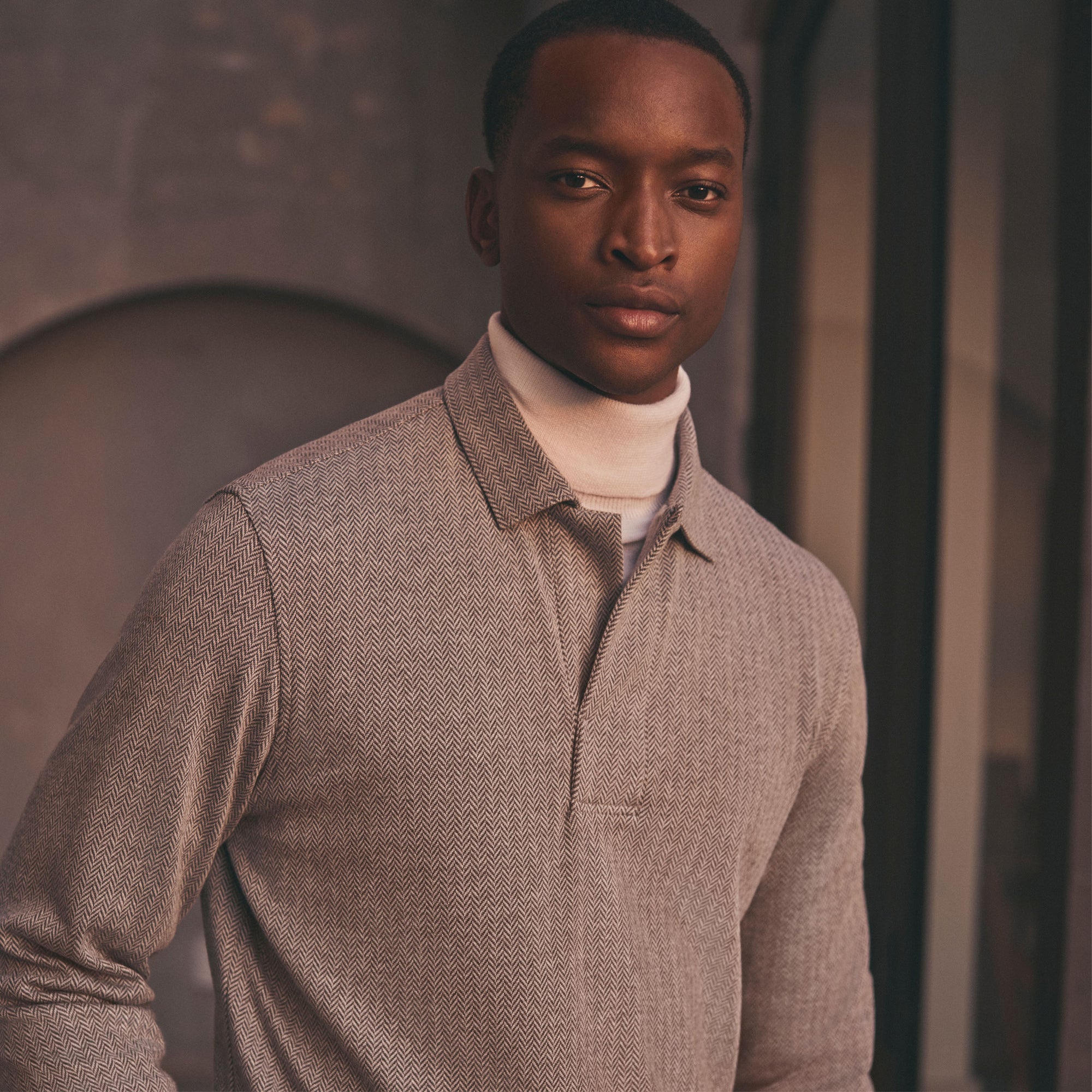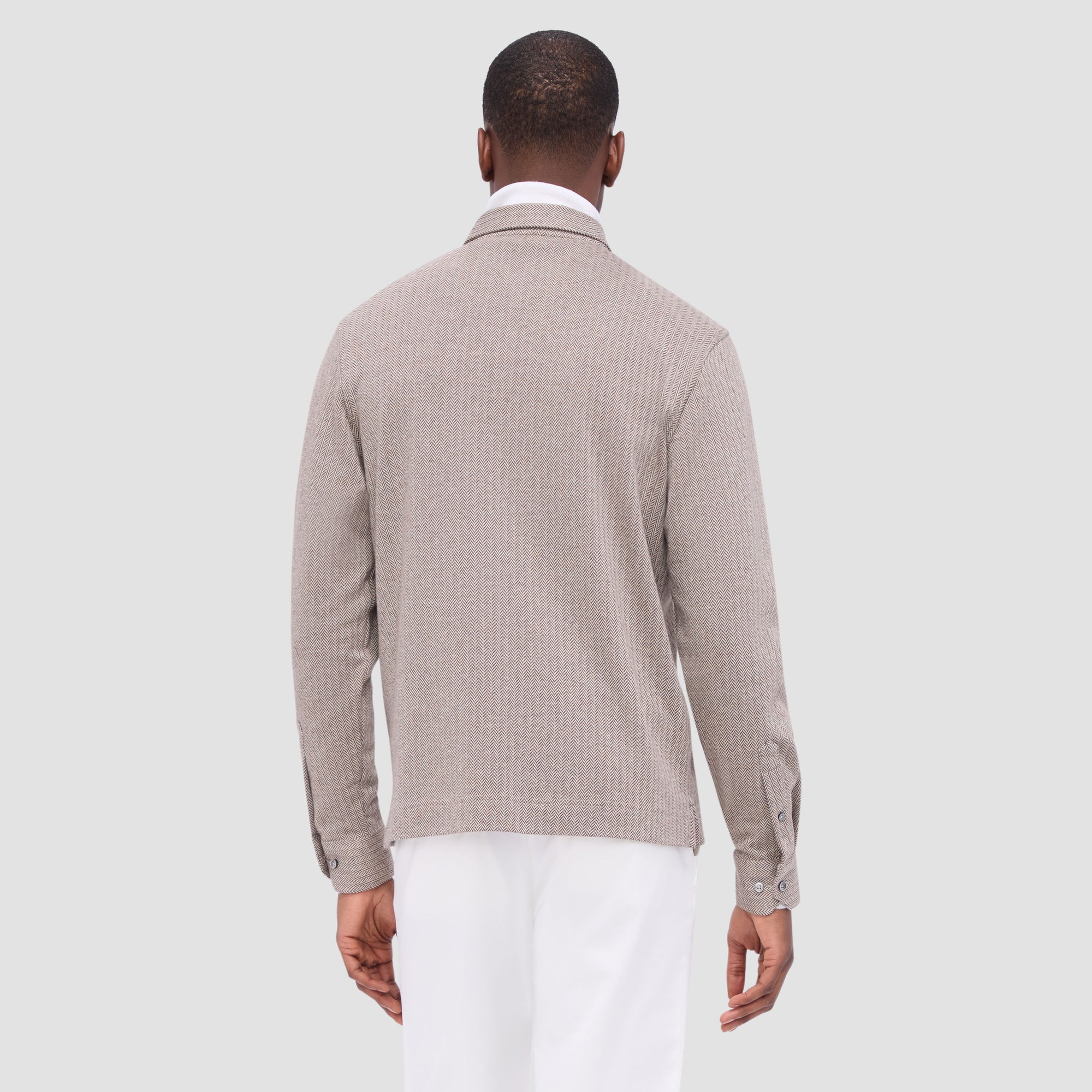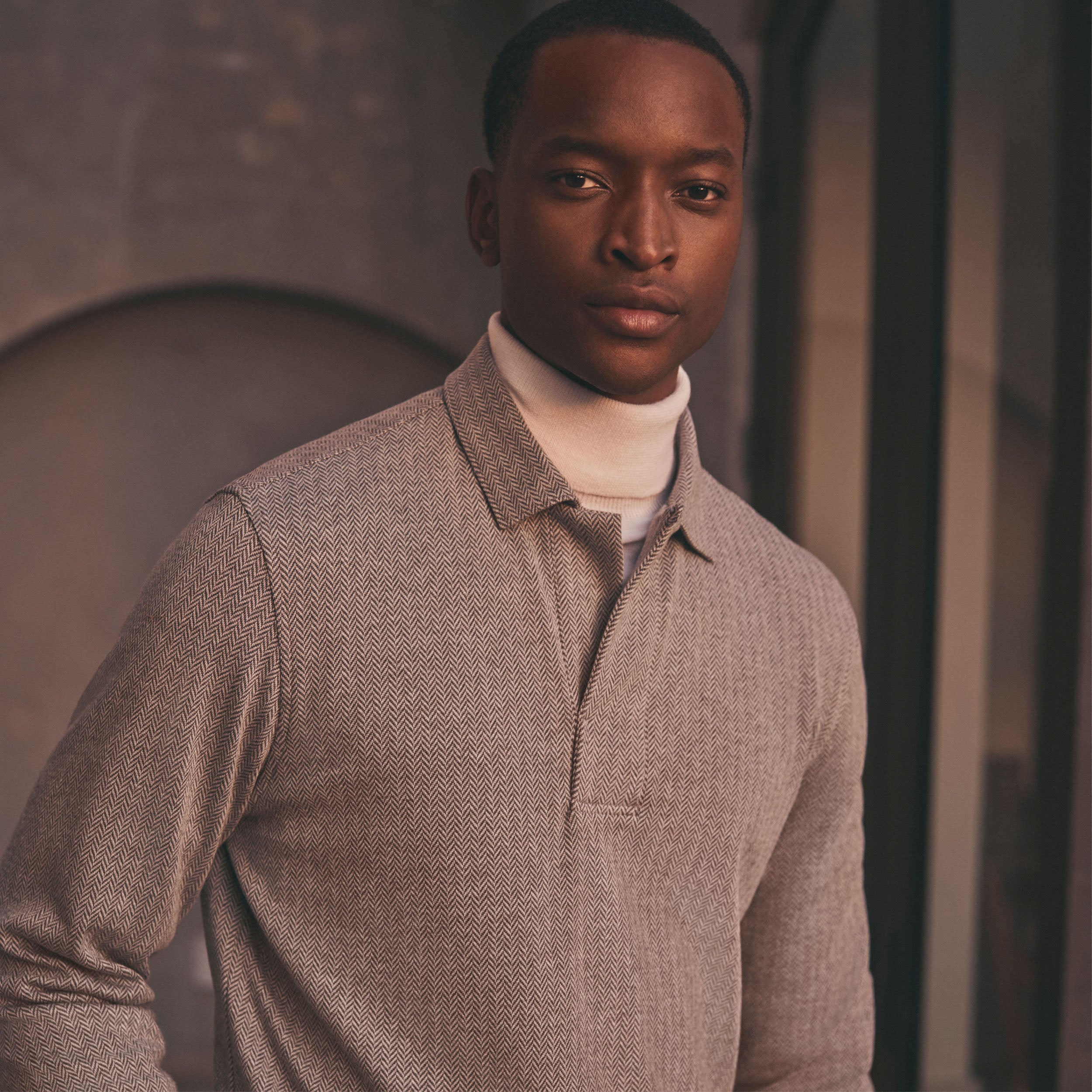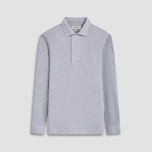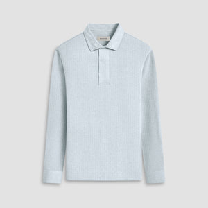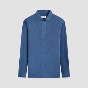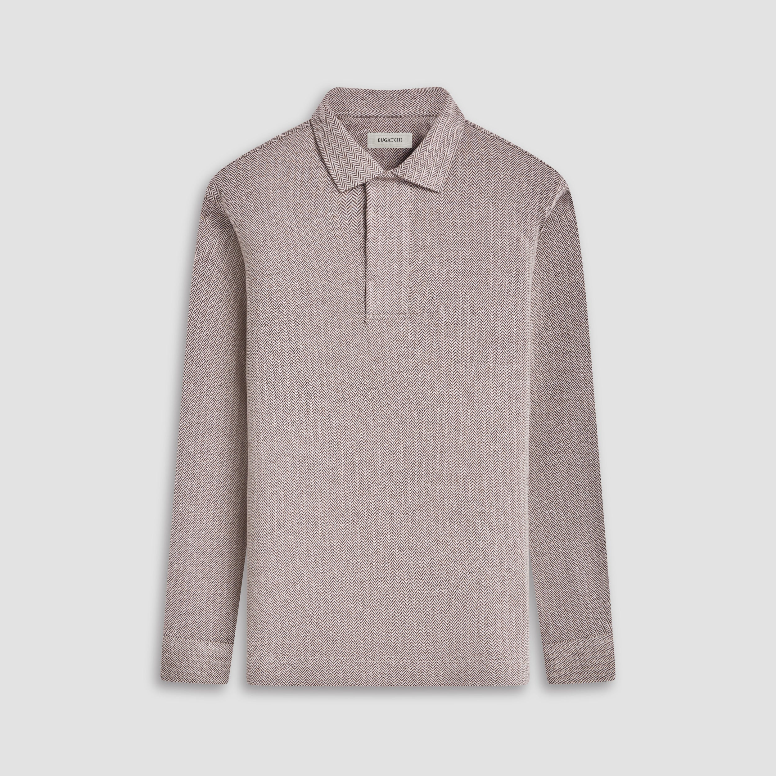 Embrace timeless elegance with this long sleeve polo shirt, expertly crafted from a soft cotton blend with a distinctive herringbone pattern. This elegant polo features a three-button covered placket and a self-fabric collar. Perfect for any occasion.