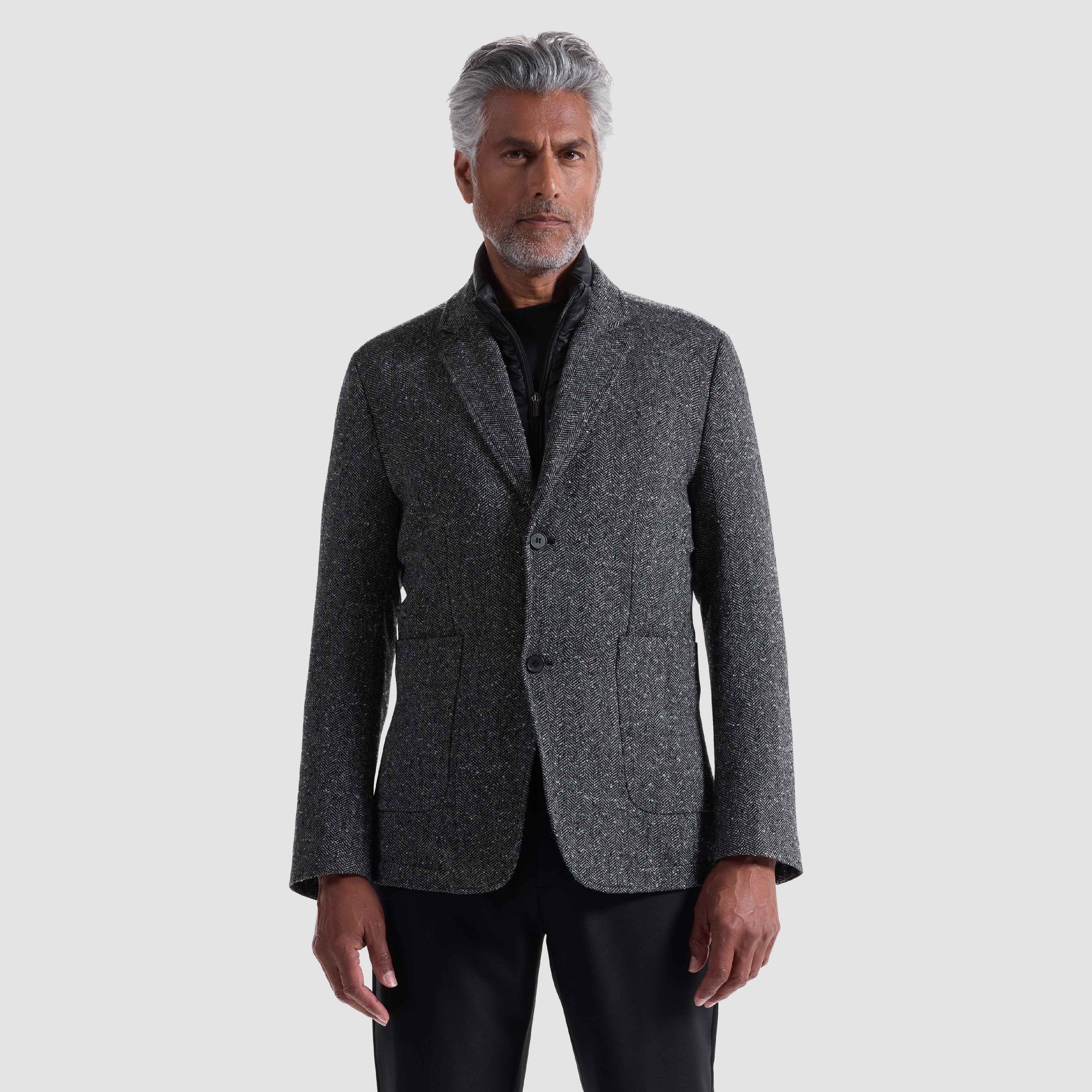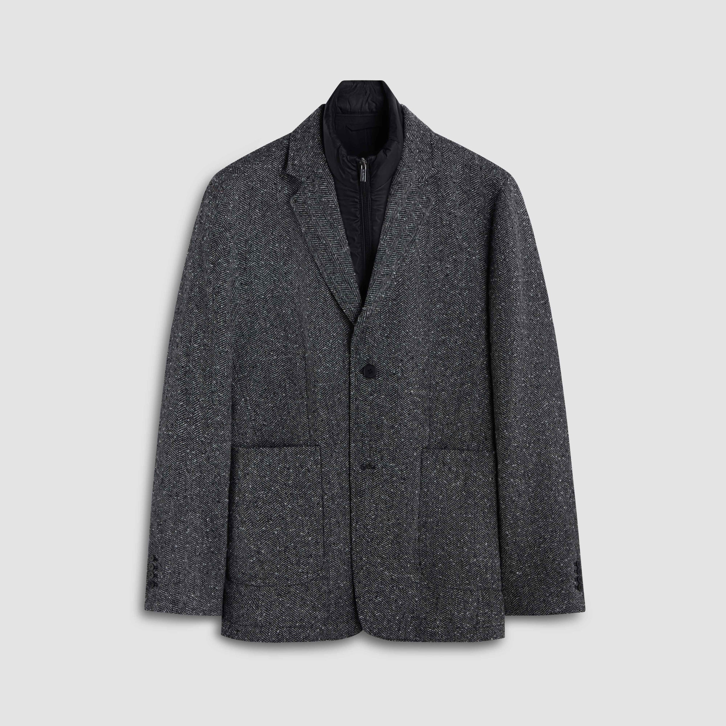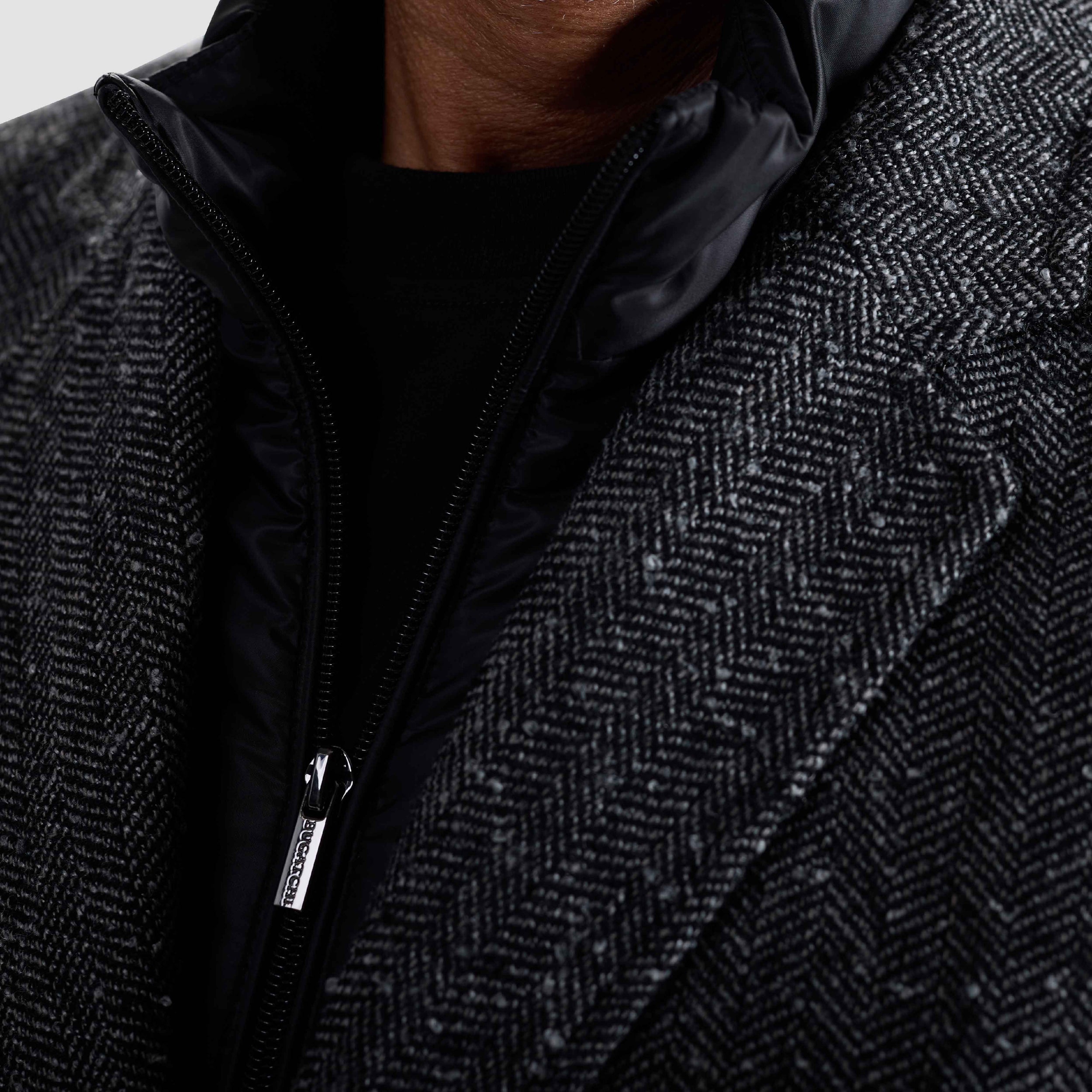 Refined and versatile, this wool-blend blazer features a classic herringbone pattern with a notched lapel, two-button closure, two patch pockets, two inner pockets, and a back vent for ease of movement. The detachable nylon bib with a high collar and zipper closure adds functional warmth and a contemporary layered look.