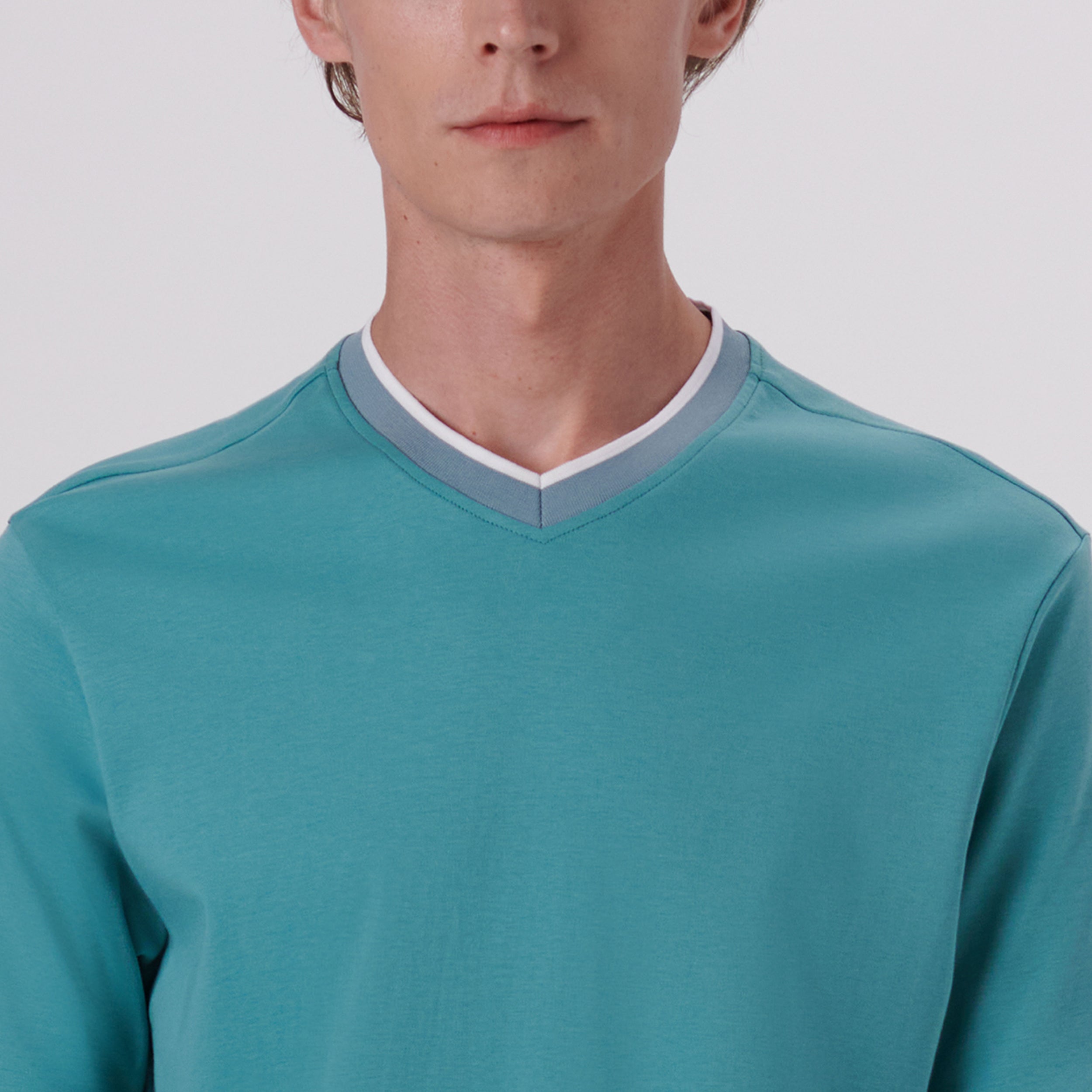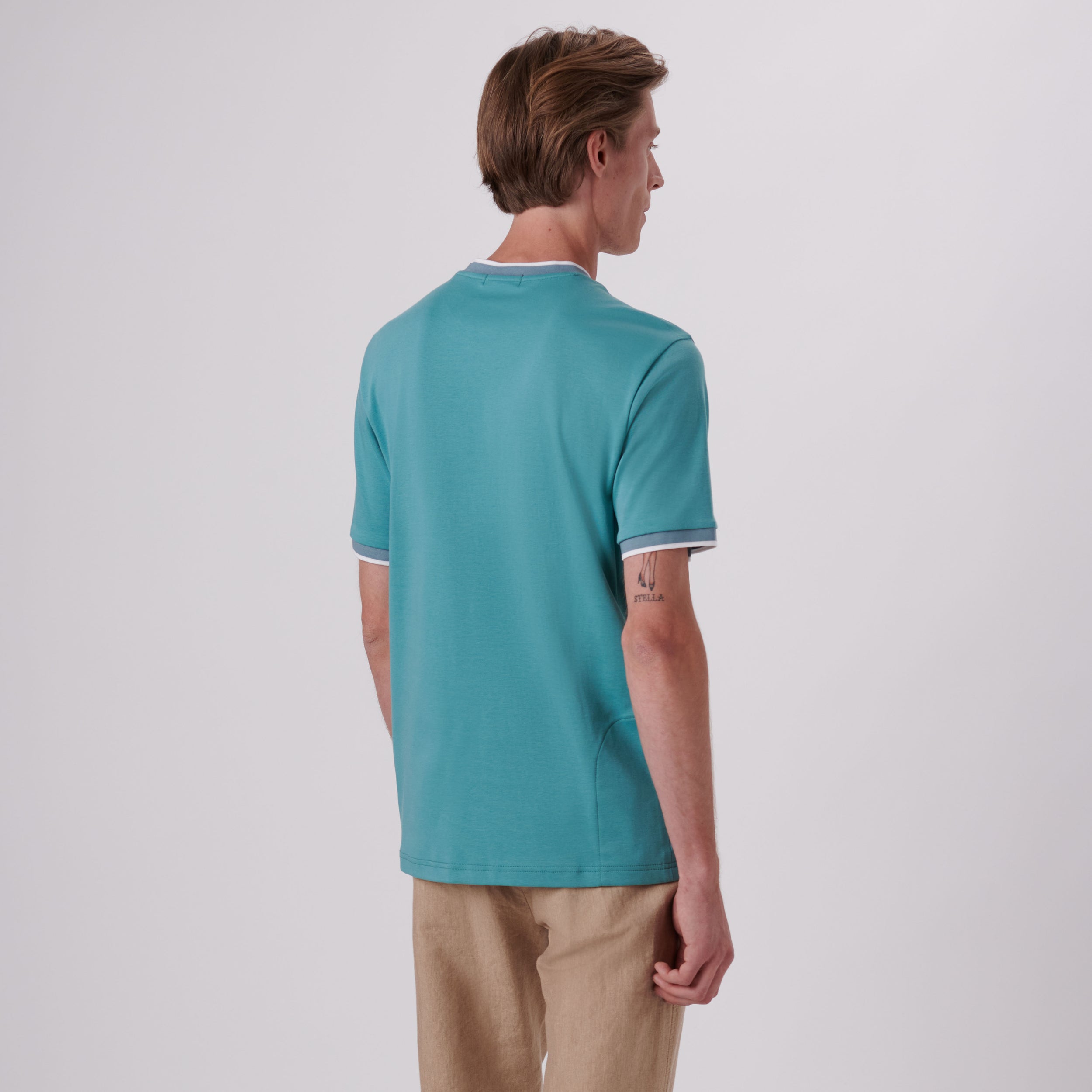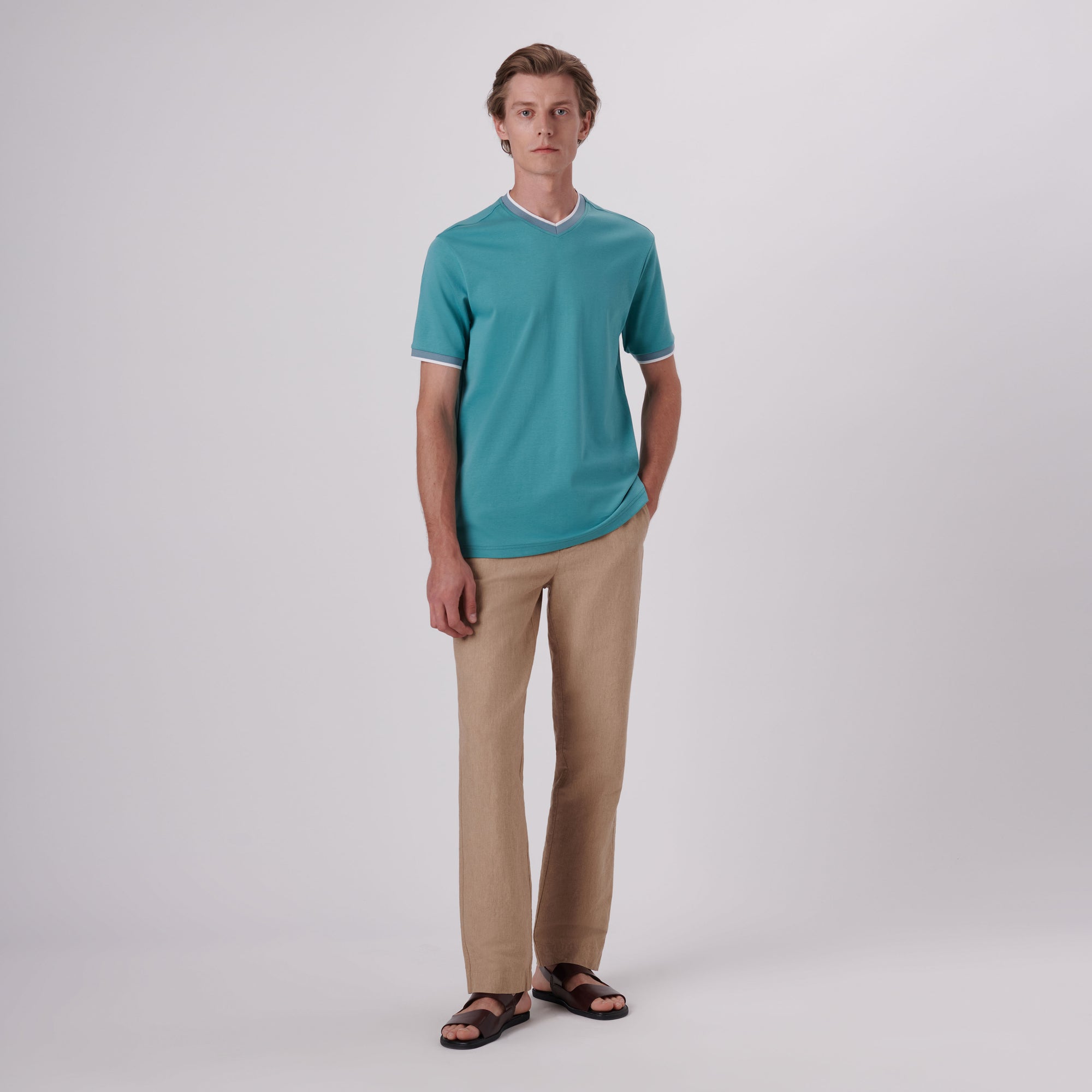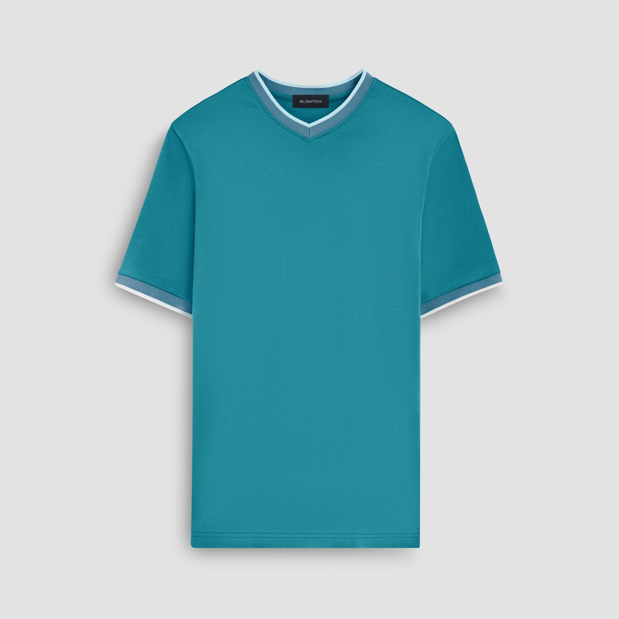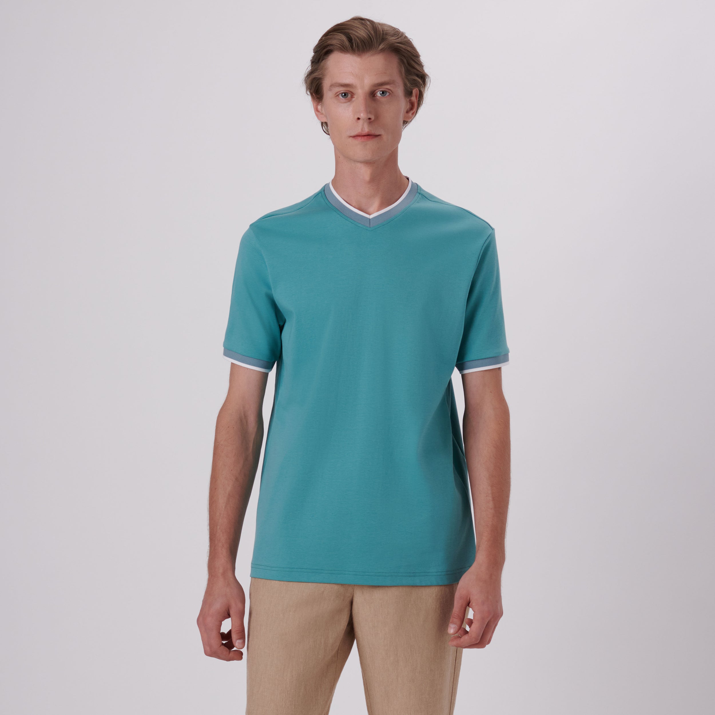 Solid short-sleeved high V- neck T-shirt in 100% pima cotton with contrast rib knit collar and armbands detailed with contrast tipping.