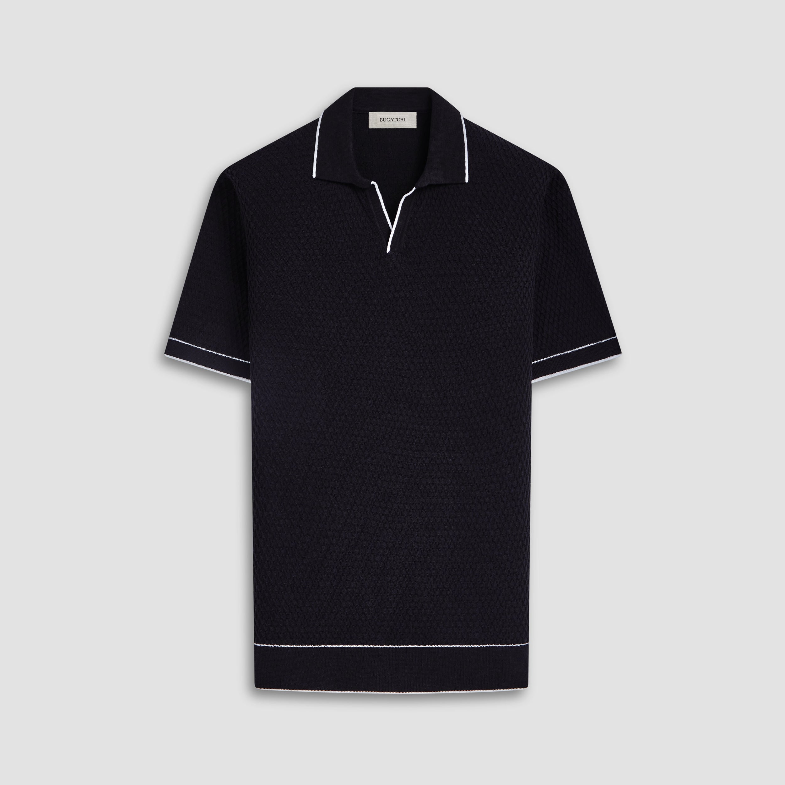 Crafted from soft cotton blend, this honeycomb stitch short-sleeved polo offers an impeccable balance of comfort, softness, breathability, and durability. It features a sleek Johnny collar and distinct contrast-tipped V-placket, collar, armbands, and hem for a modern touch, while the short sleeves offer versatility for layering or wearing solo on sunnier days.