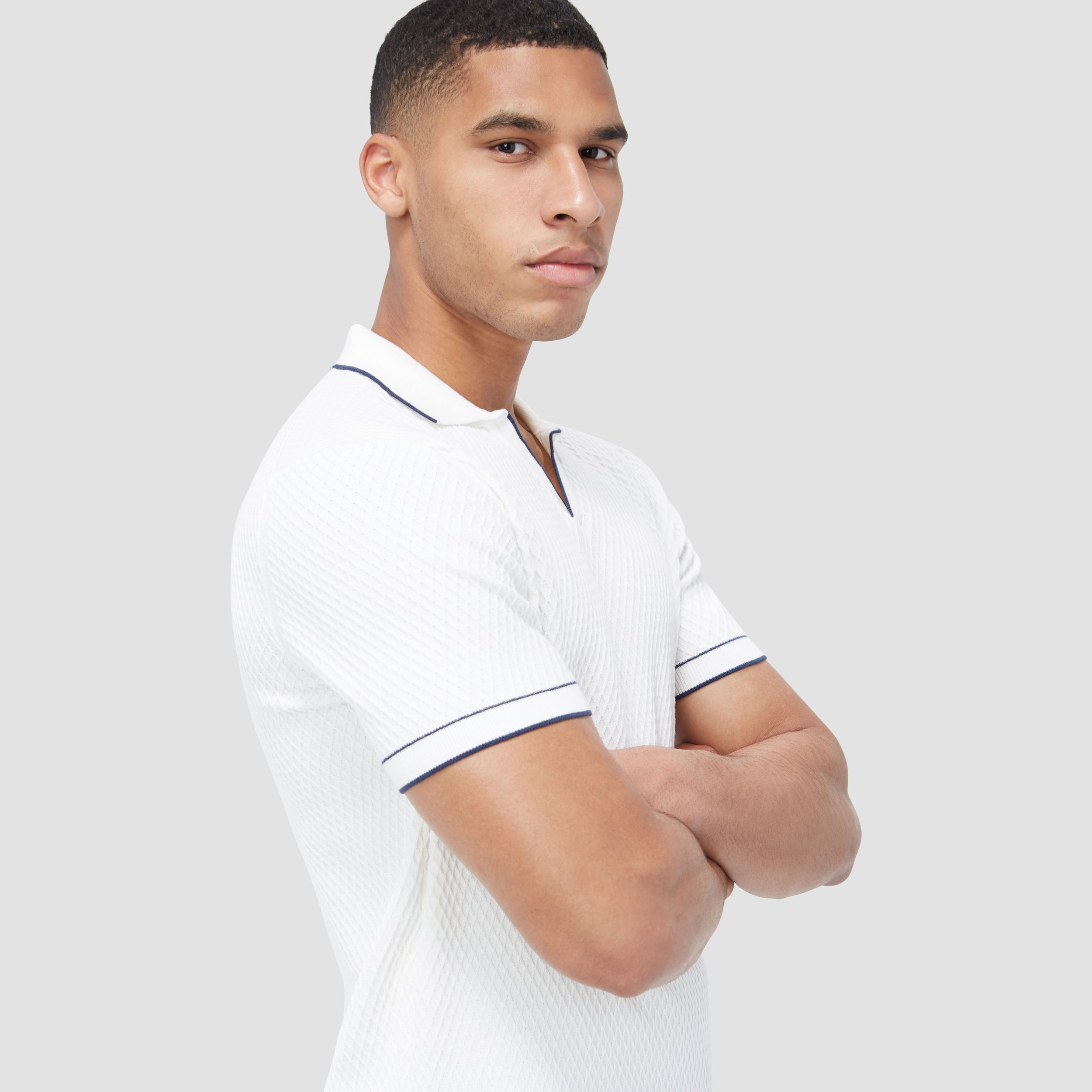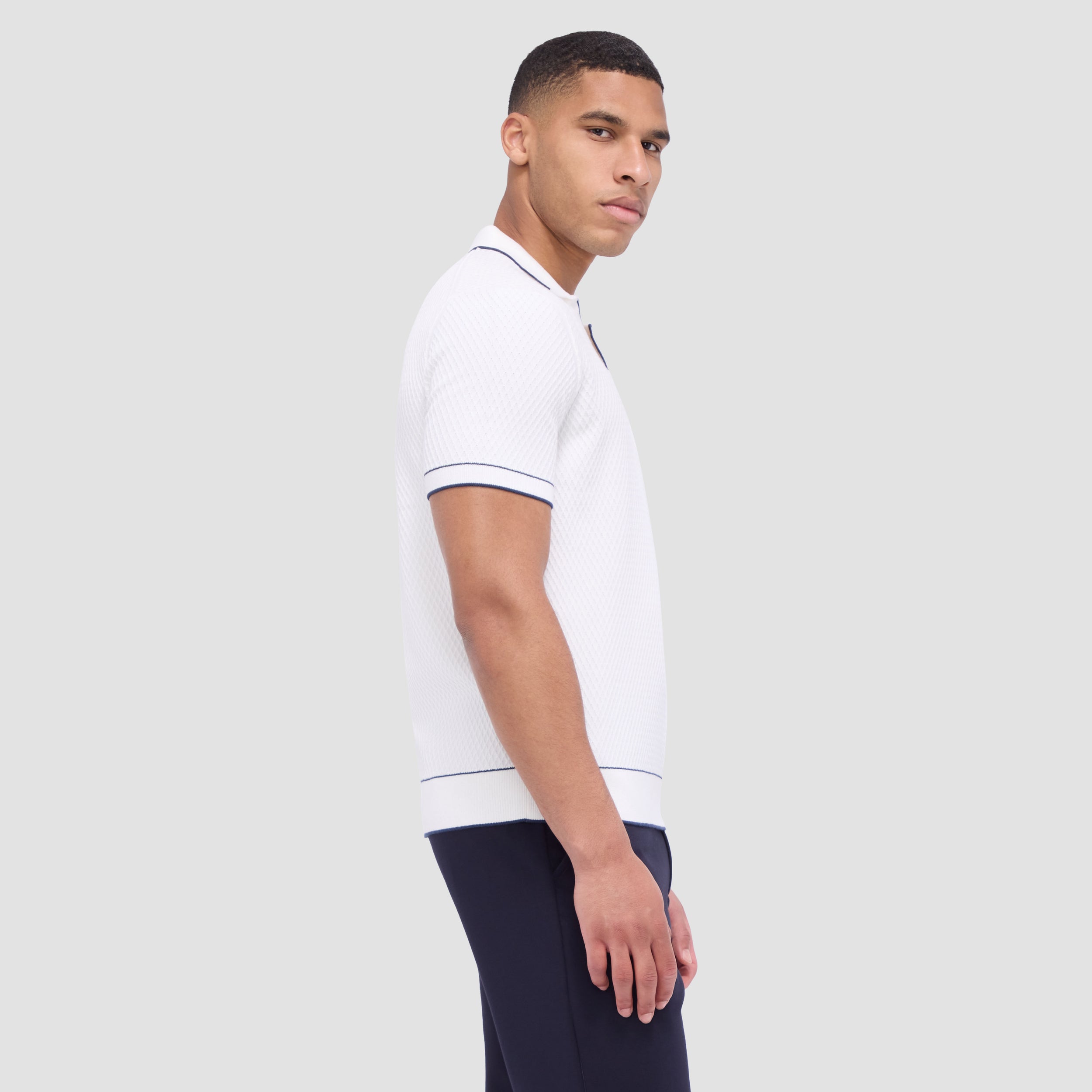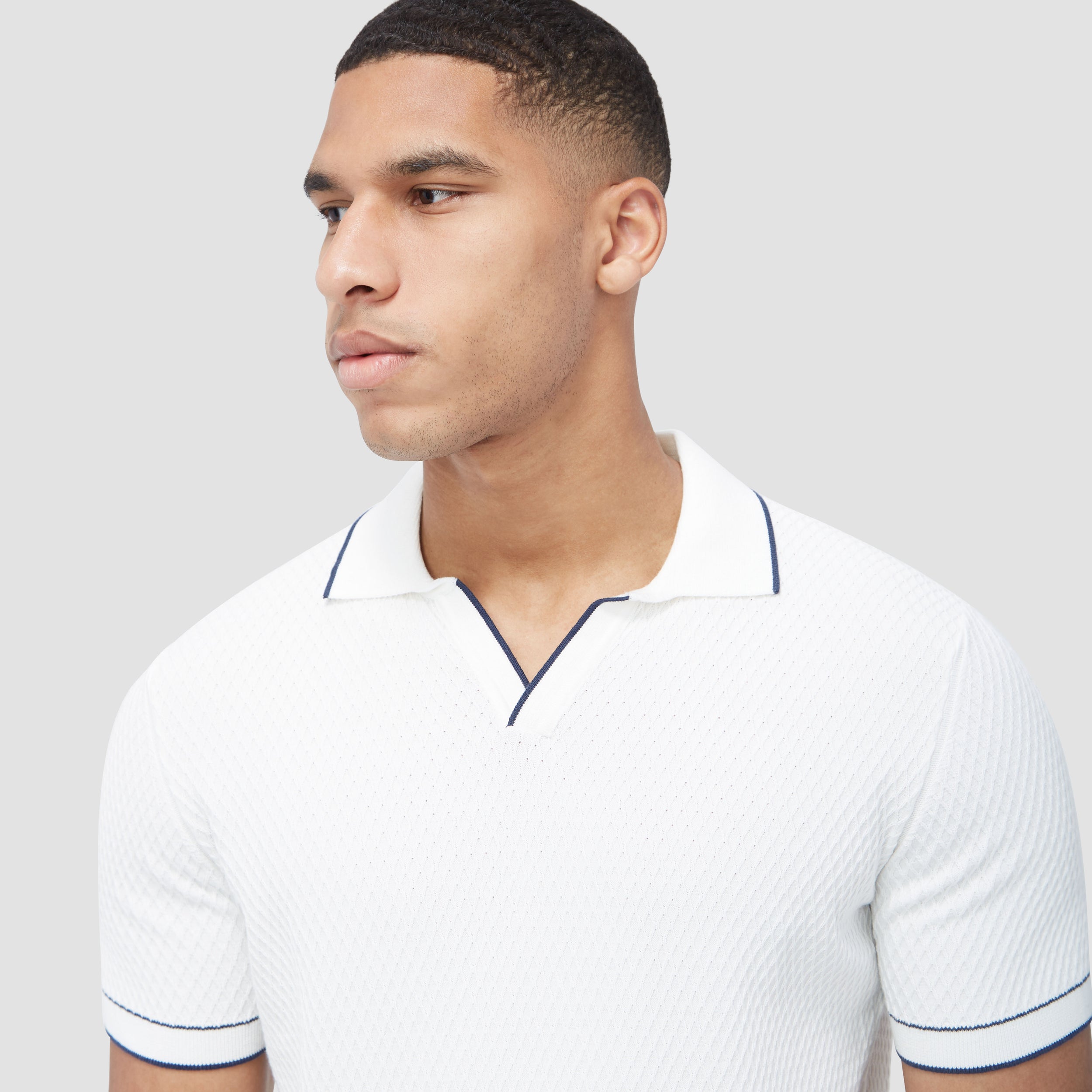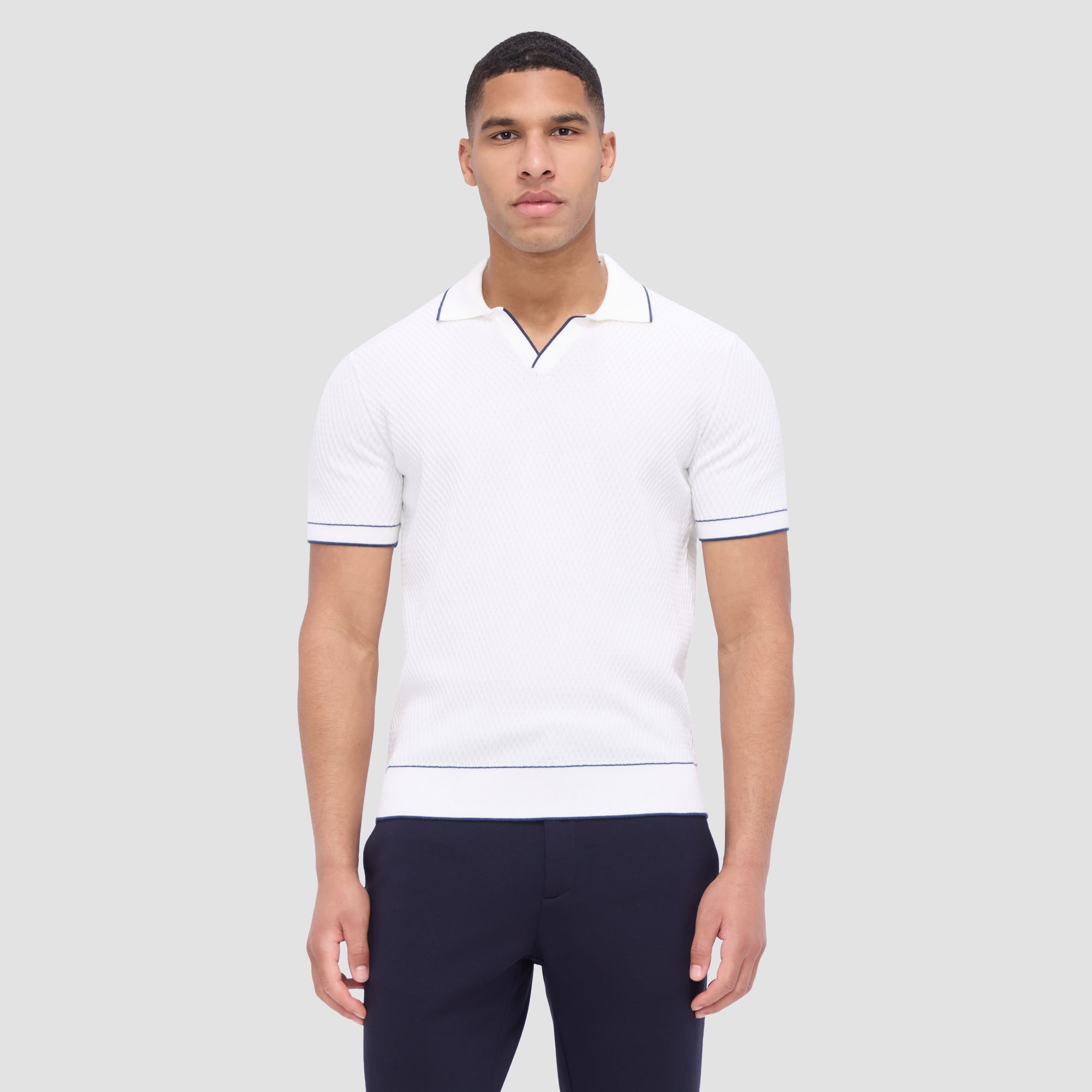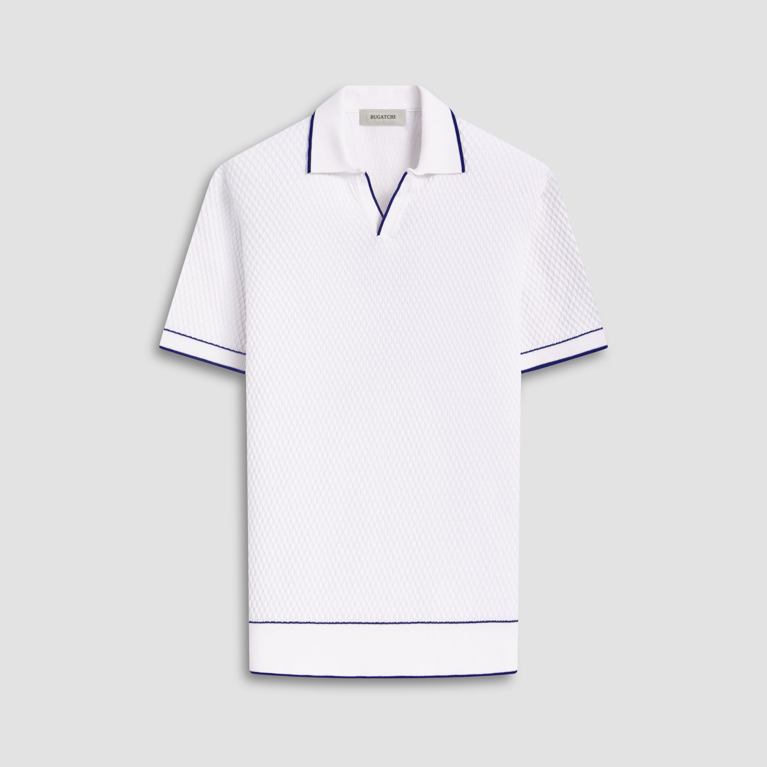 Crafted from soft cotton blend, this honeycomb stitch short-sleeved polo offers an impeccable balance of comfort, softness, breathability, and durability. It features a sleek Johnny collar and distinct contrast-tipped V-placket, collar, armbands, and hem for a modern touch, while the short sleeves offer versatility for layering or wearing solo on sunnier days.