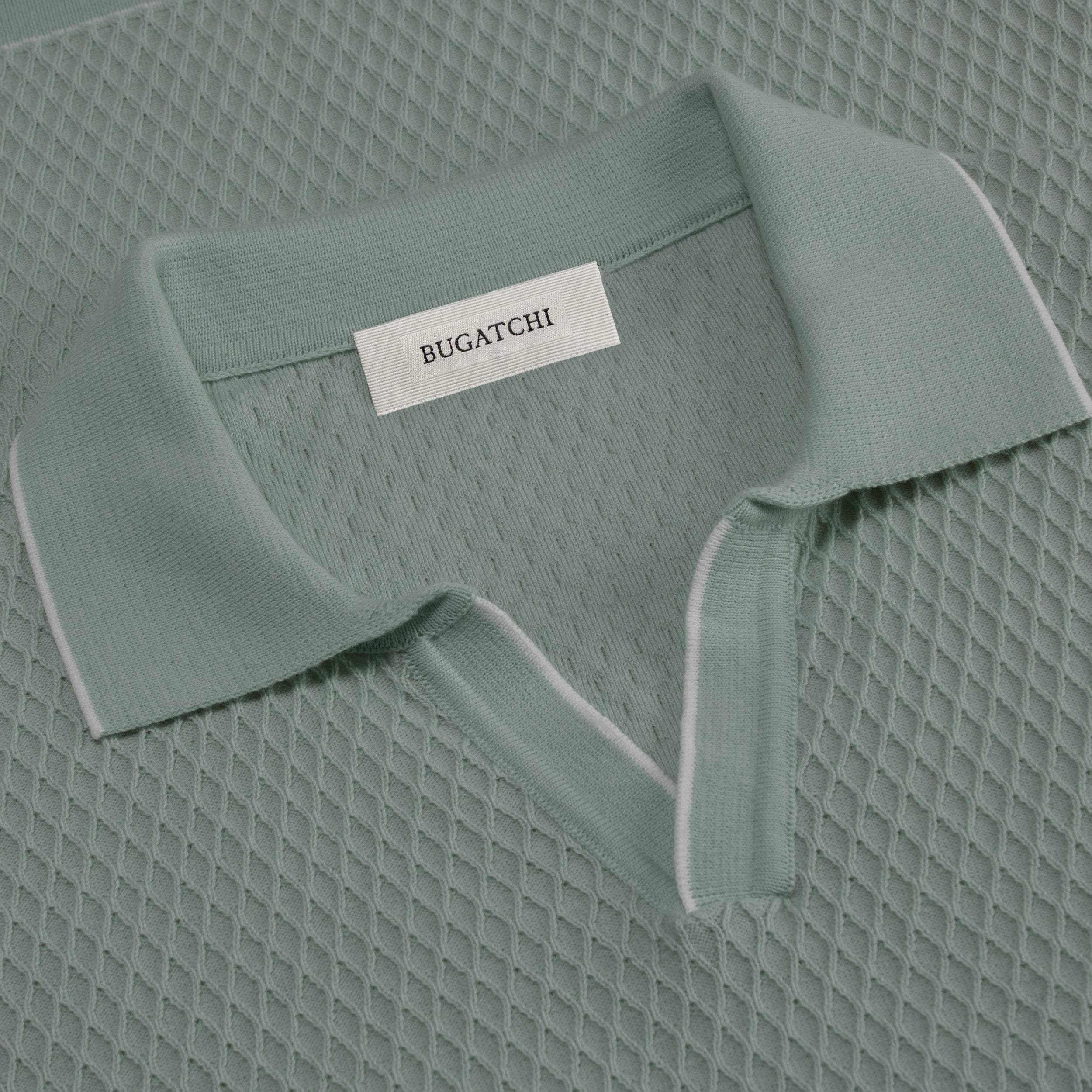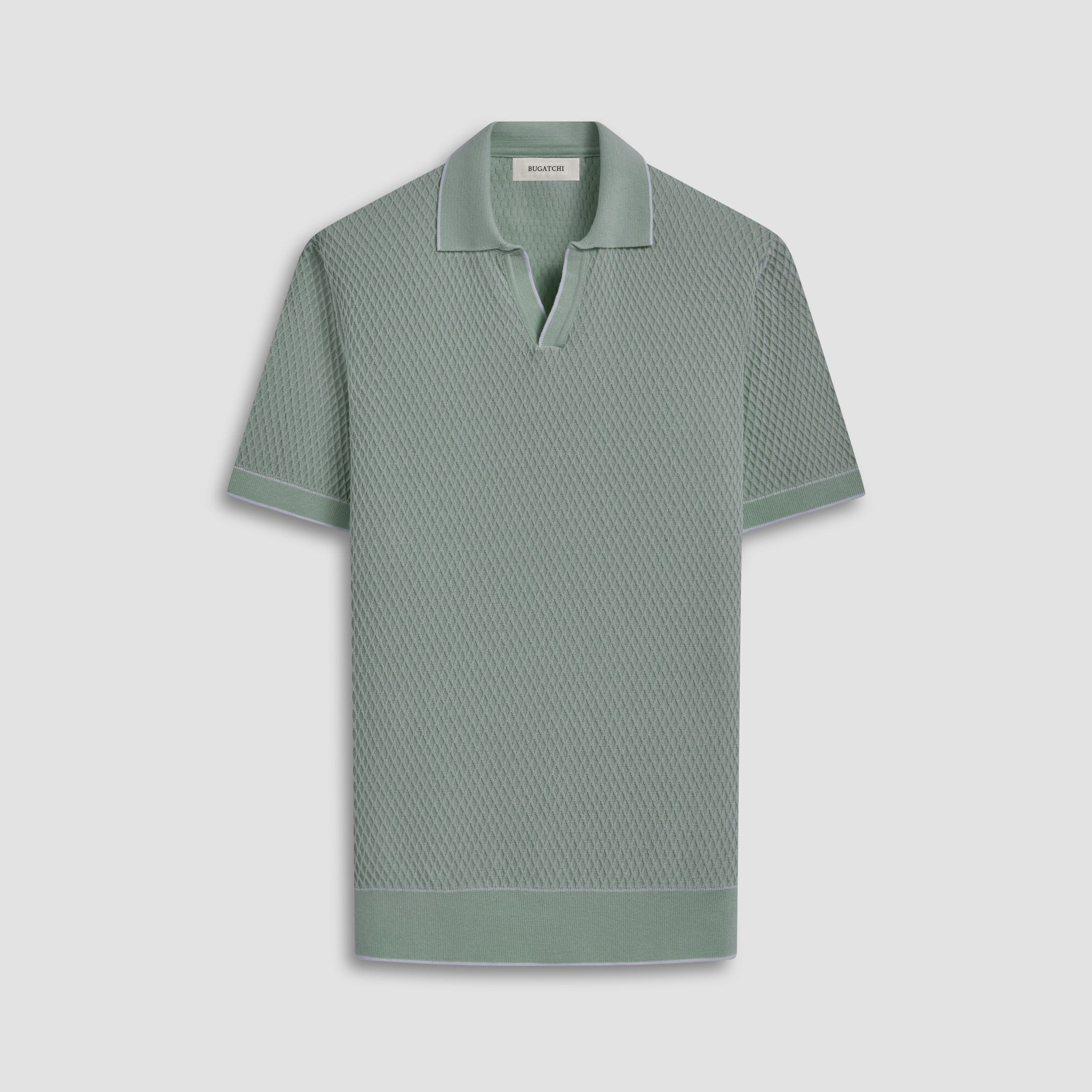 Crafted from soft cotton blend, this honeycomb stitch short-sleeved polo offers an impeccable balance of comfort, softness, breathability, and durability. It features a sleek Johnny collar and distinct contrast-tipped V-placket, collar, armbands, and hem for a modern touch, while the short sleeves offer versatility for layering or wearing solo on sunnier days.