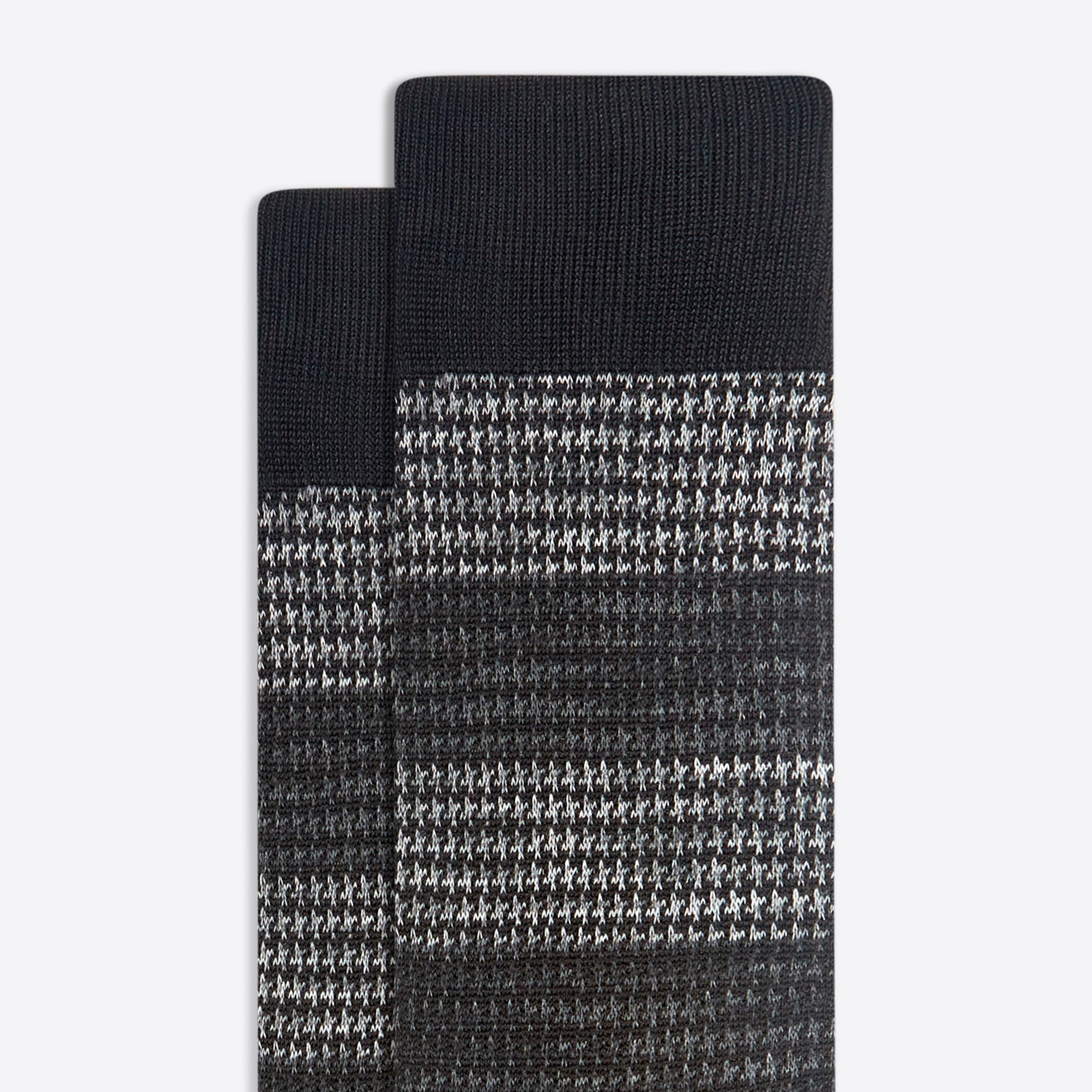 Hound's tooth check mid-calf socks in fine gauge mercerized cotton blend with rib knit cuff band, hand linked toe and reinforced heel seams. Made in Italy.