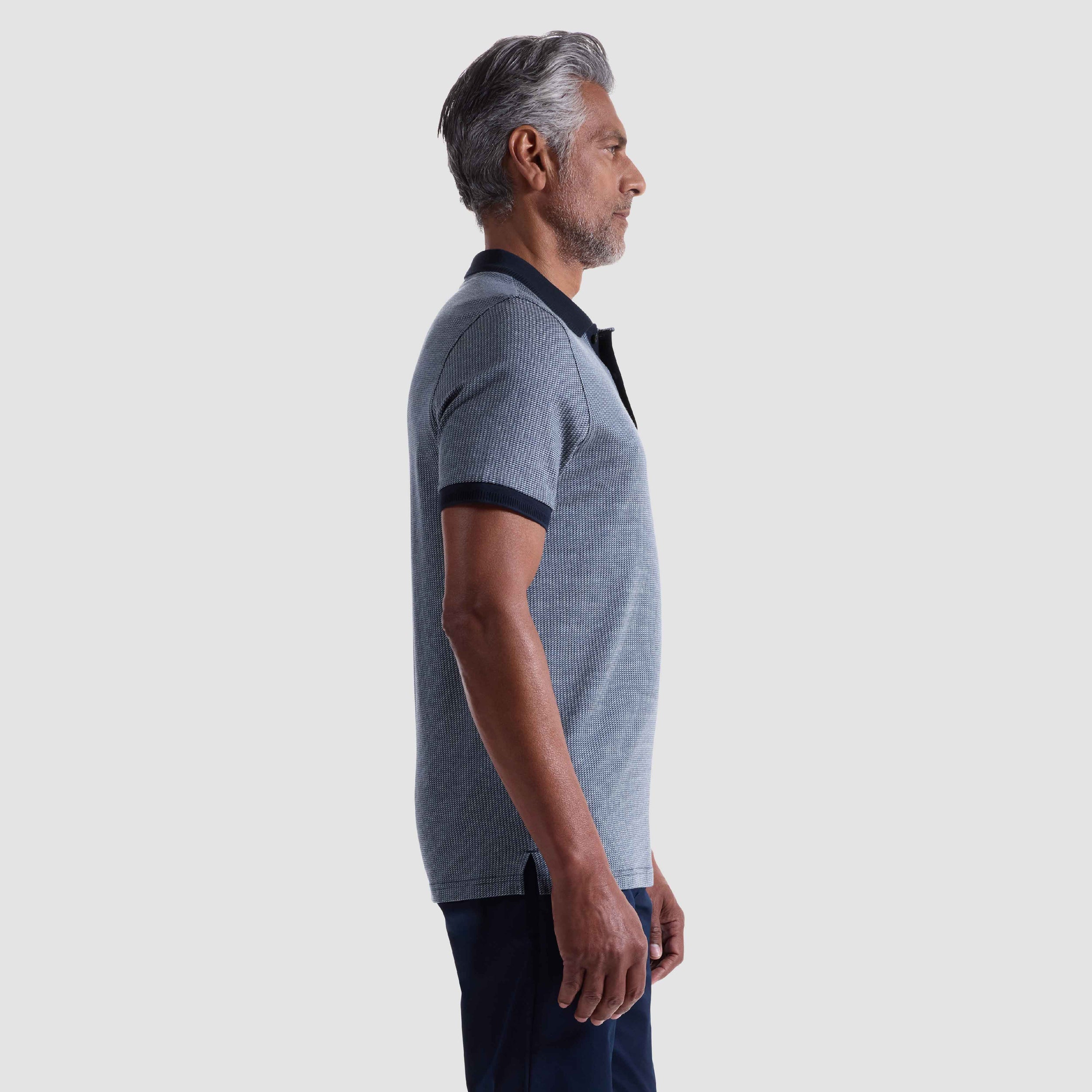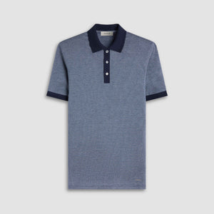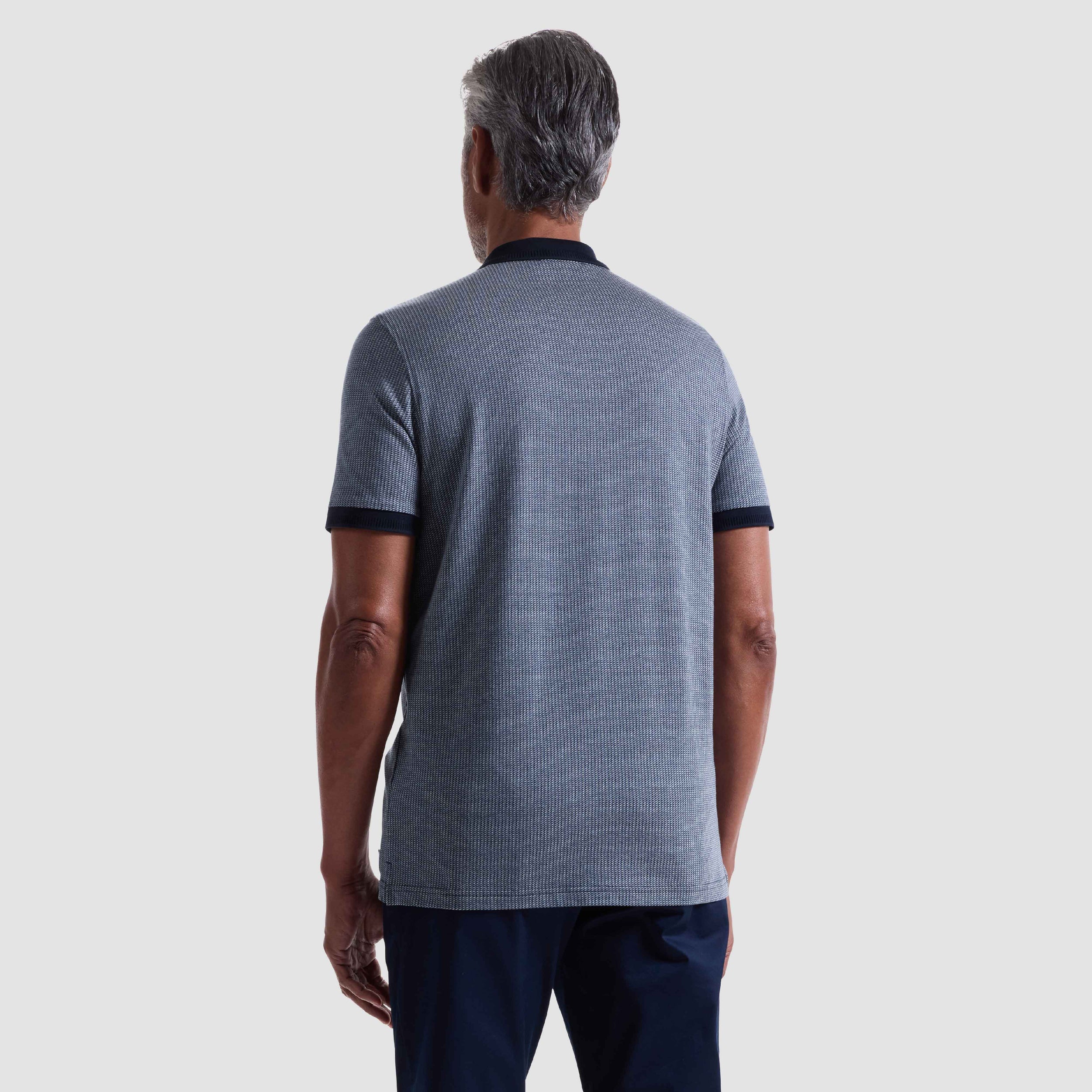 Crafted from 100% mercerized cotton, this short sleeve polo features a refined houndstooth pattern, mother-of-pearl buttons, and an elasticized rib collar and cuffs with tuck stitch detailing. Designed with side vents for added comfort and mobility, it is finished with a solid three-button placket for a polished look on the golf course or casual occasions.
