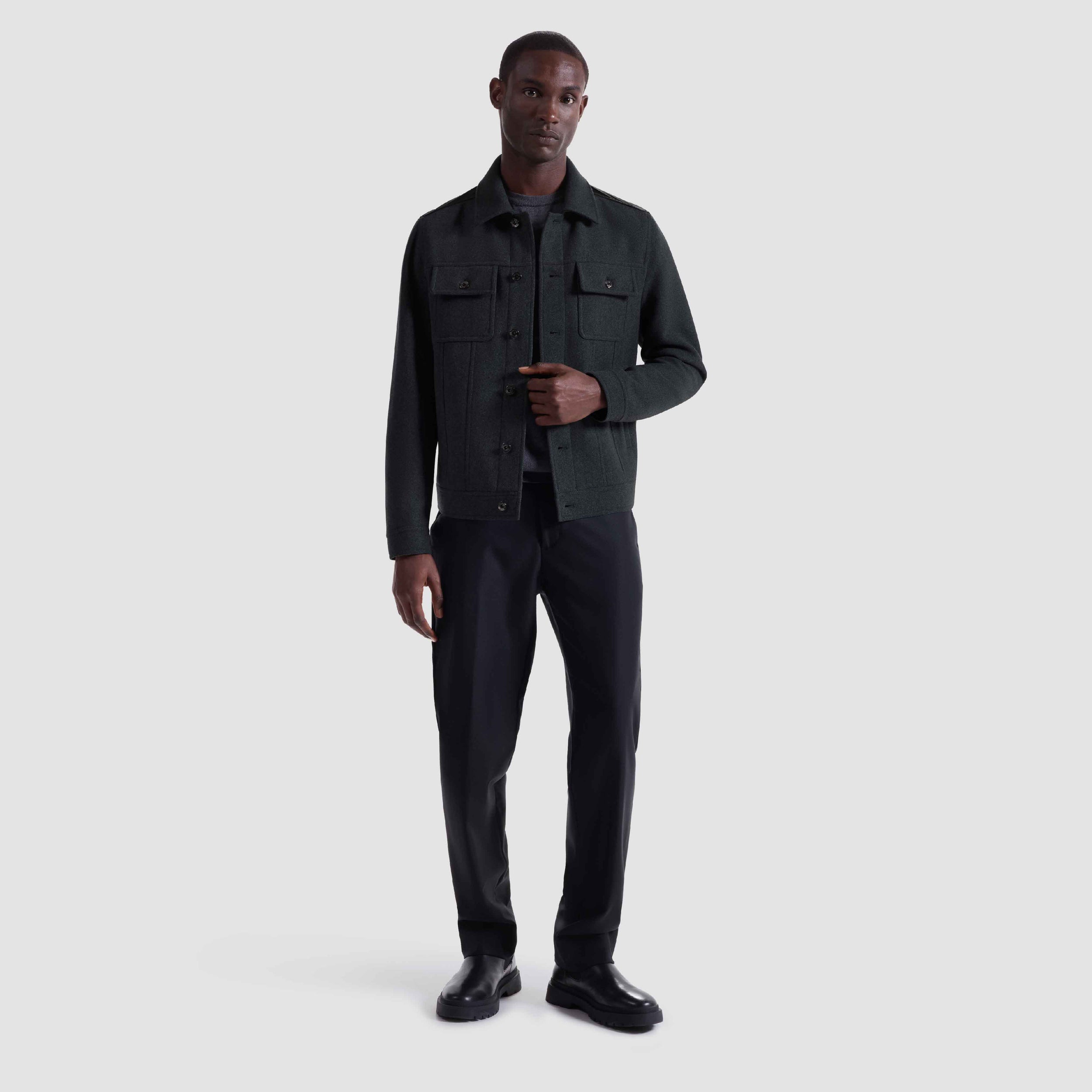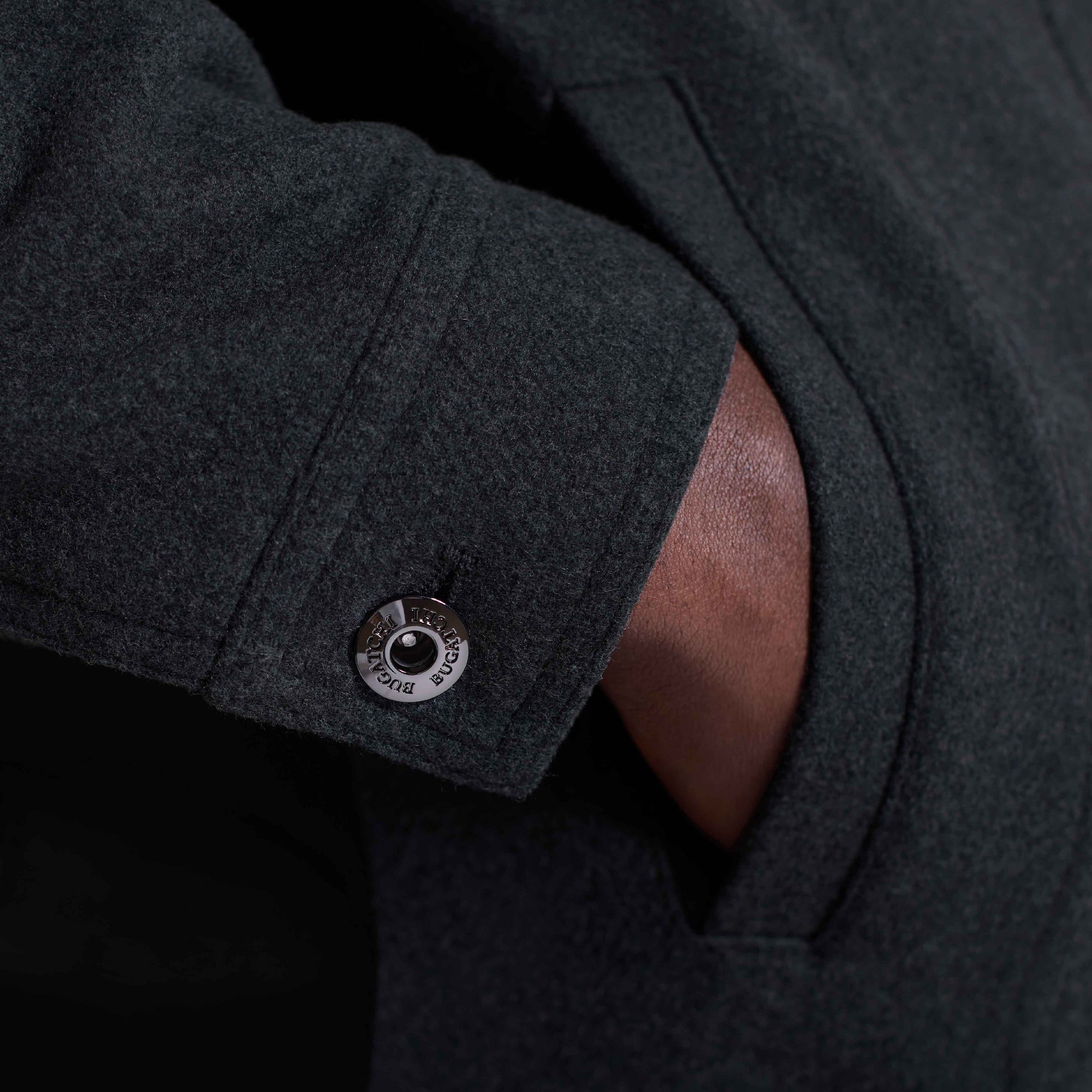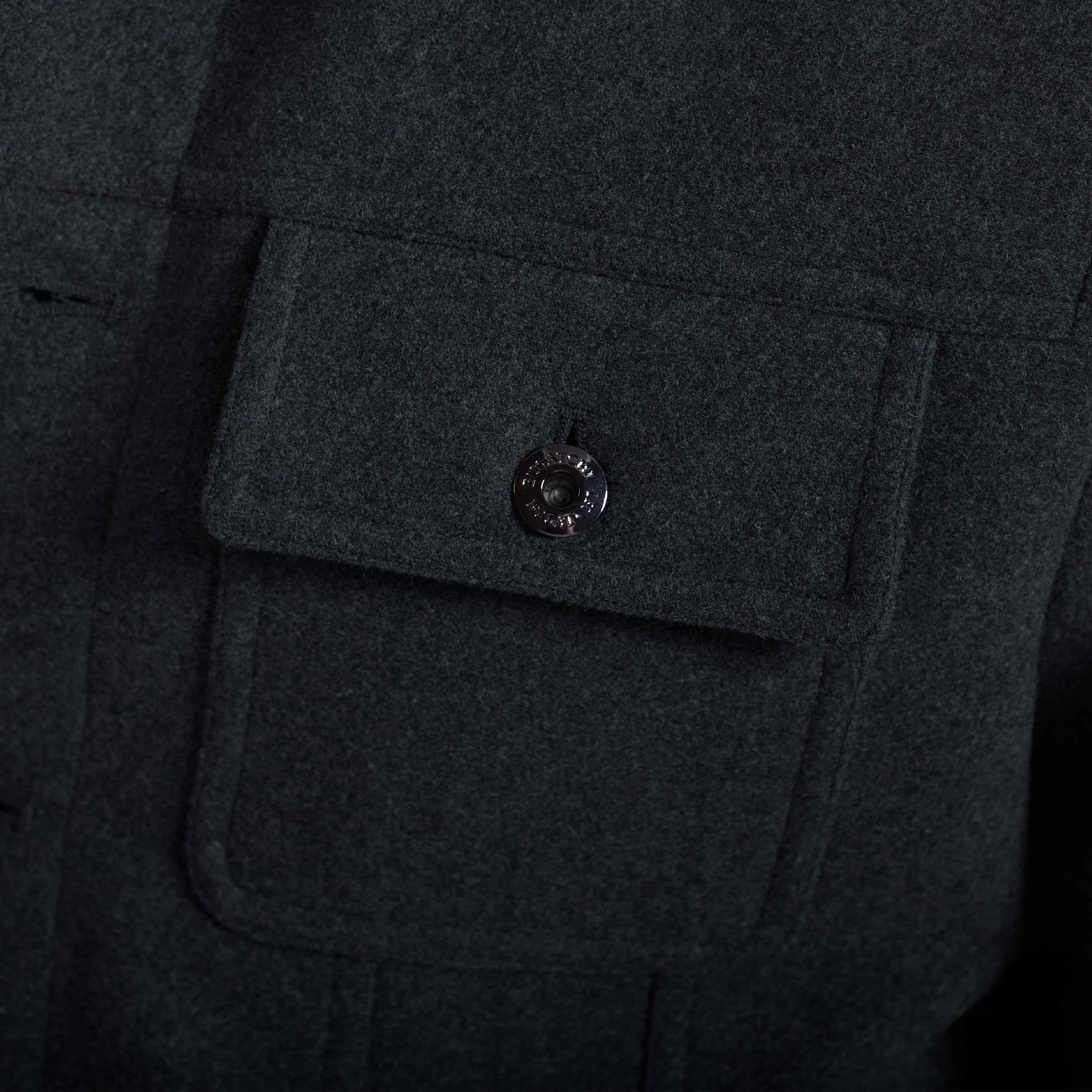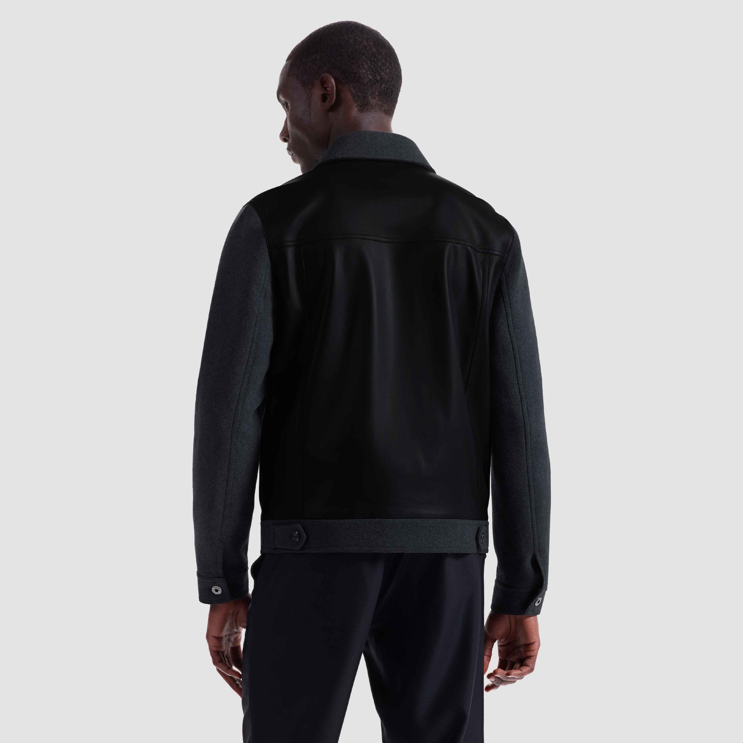 A hybrid trucker jacket that balances classic structure with contemporary edge. Crafted from a wool blend with leather shoulders and back, it features metal buttons, a point collar, buttoned cuffs, two chest flap pockets, two side welt pockets, and two interior pockets. Fully lined, this jacket delivers both warmth and style.