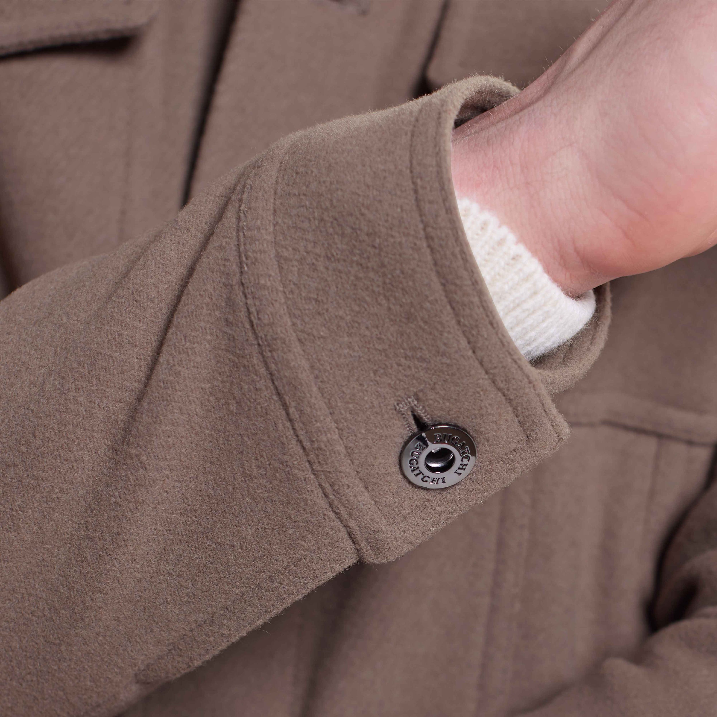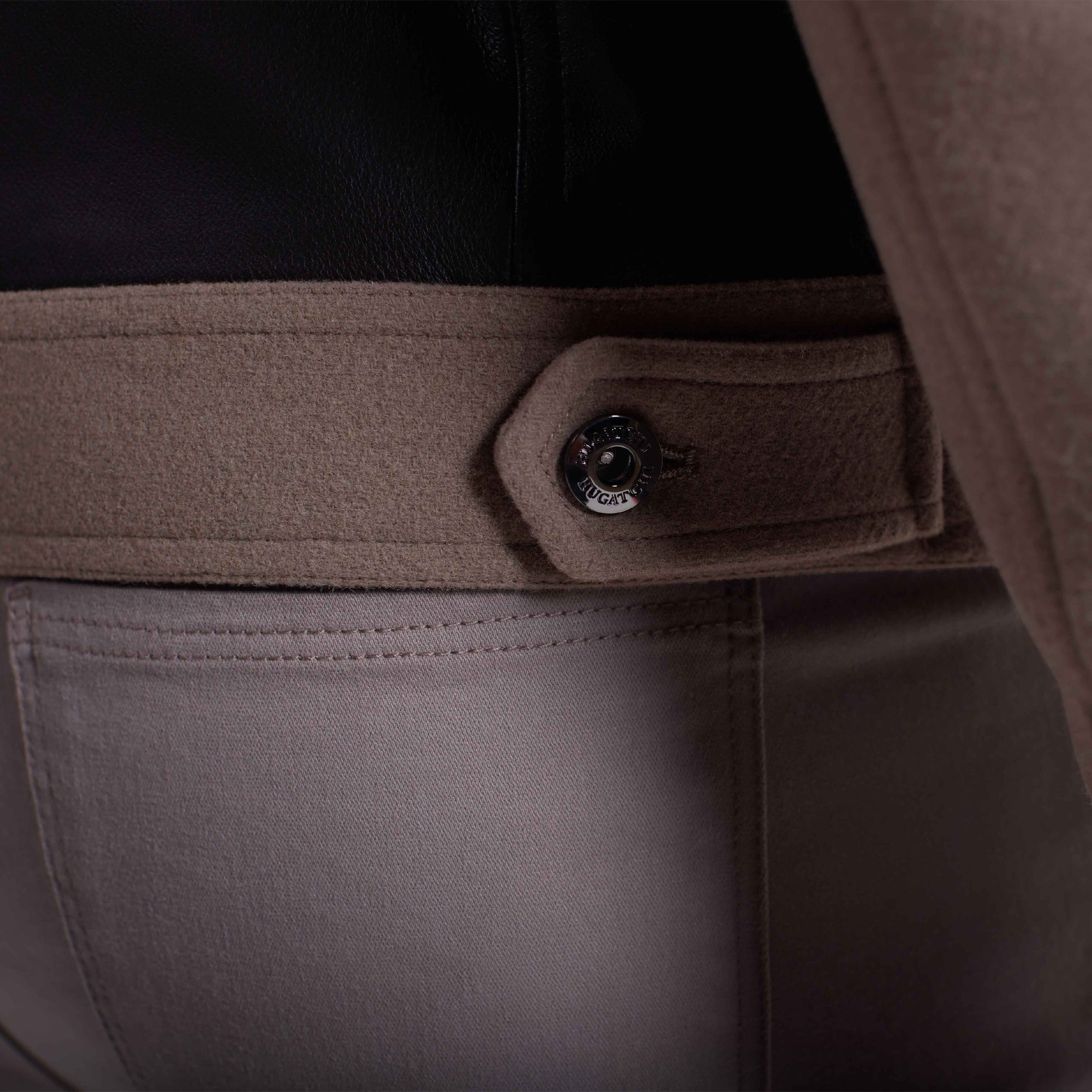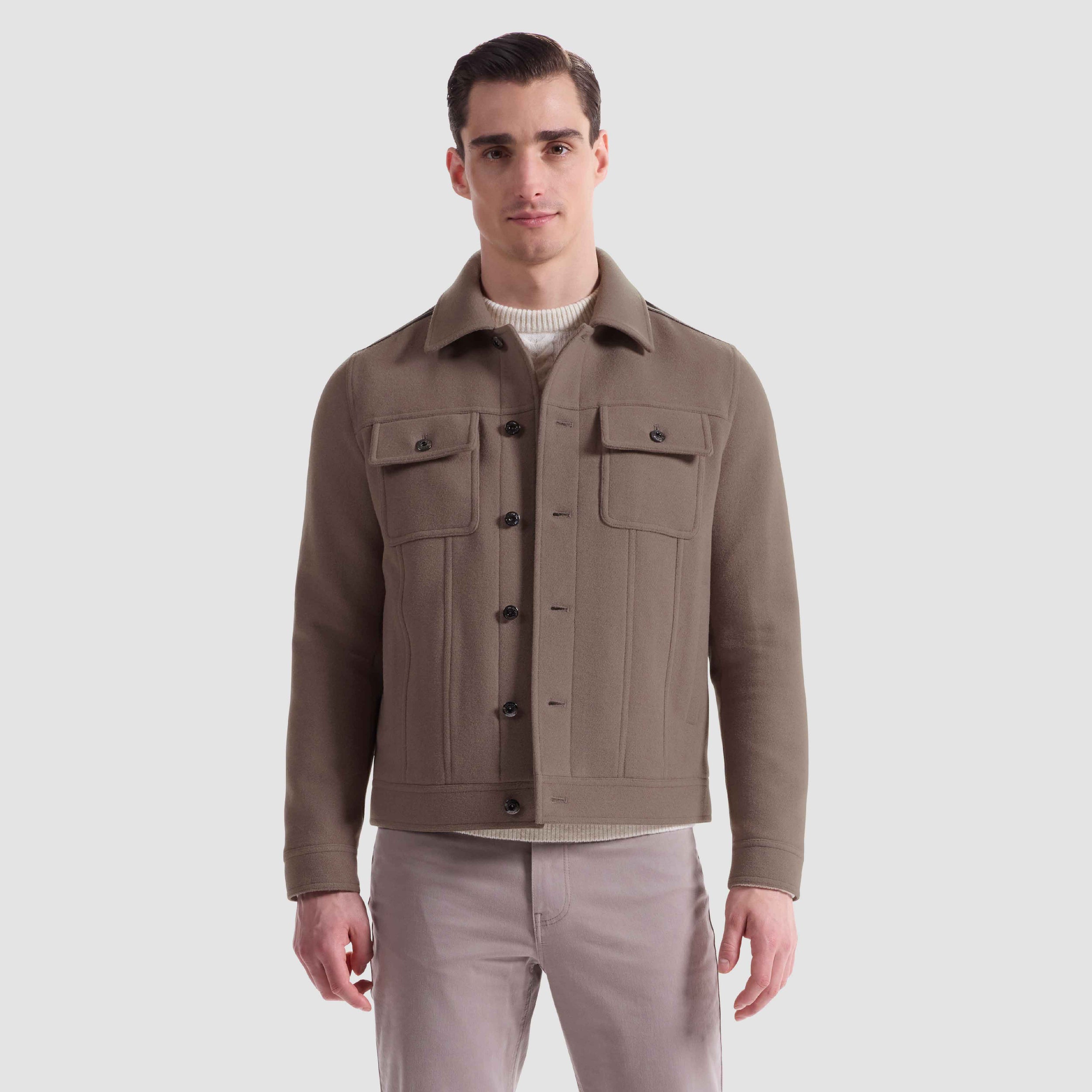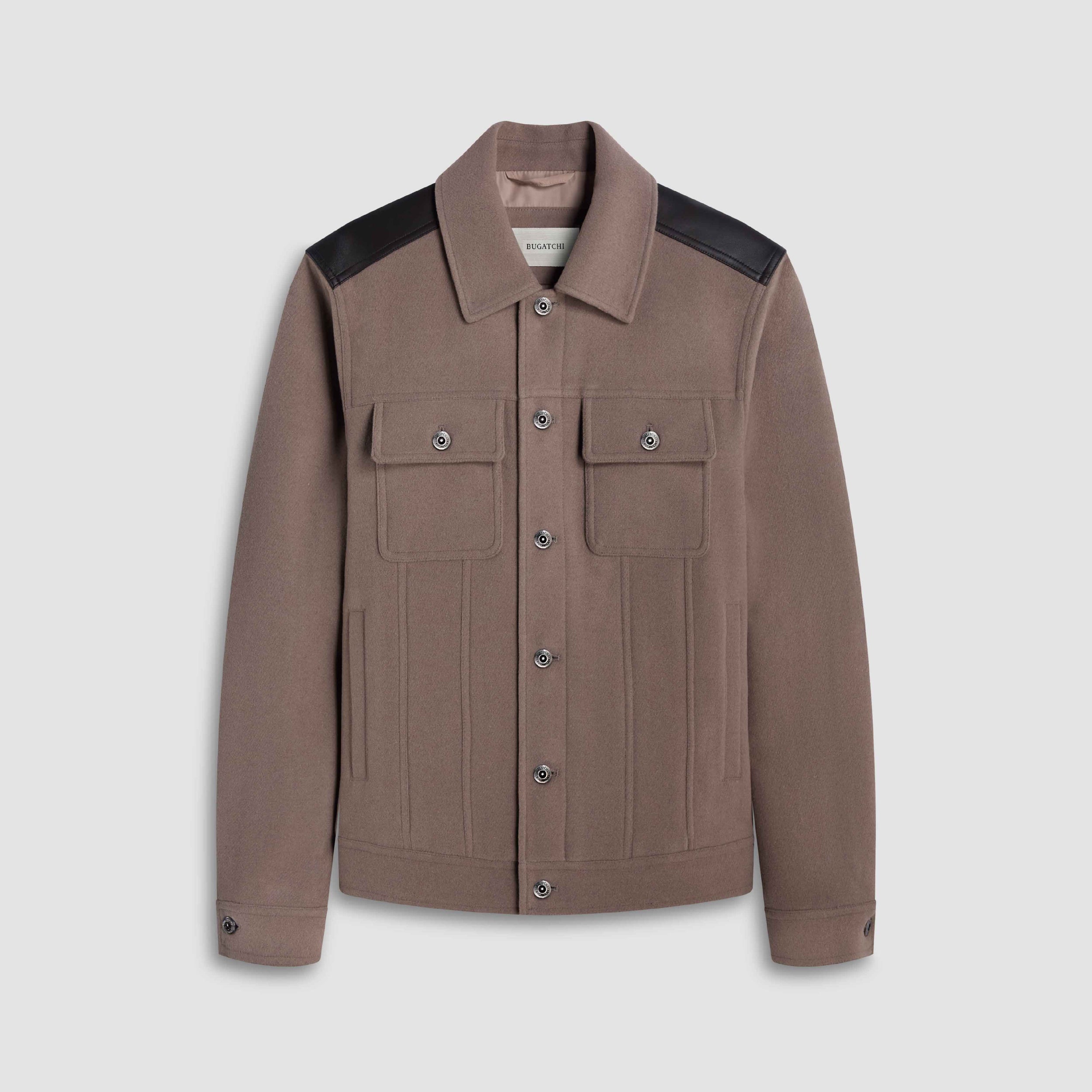 A hybrid trucker jacket that balances classic structure with contemporary edge. Crafted from a wool blend with leather shoulders and back, it features metal buttons, a point collar, buttoned cuffs, two chest flap pockets, two side welt pockets, and two interior pockets. Fully lined, this jacket delivers both warmth and style.