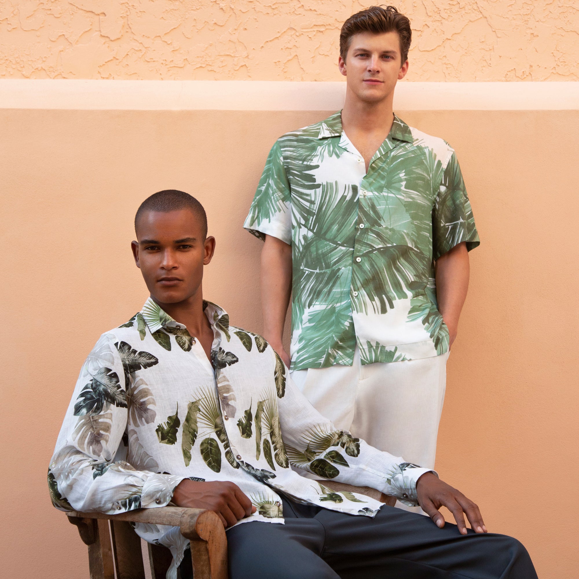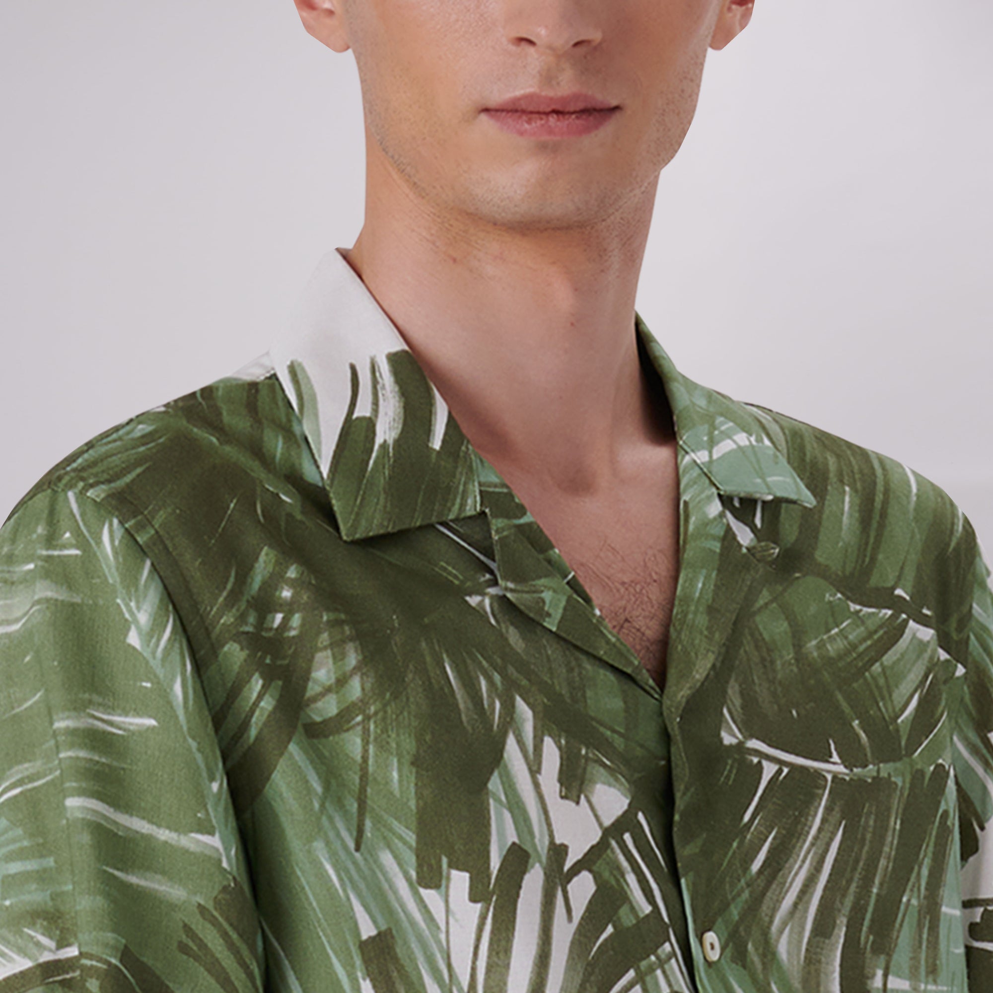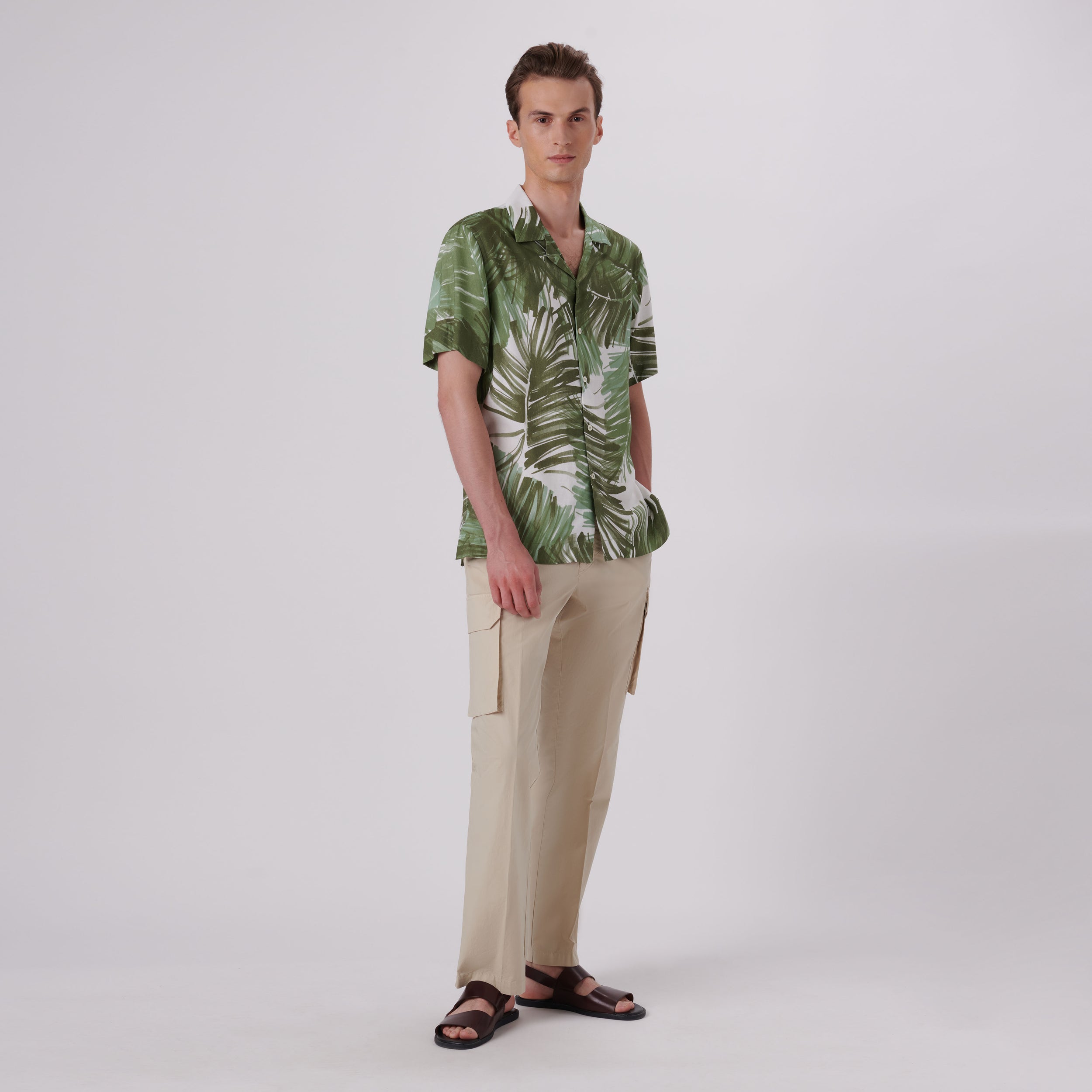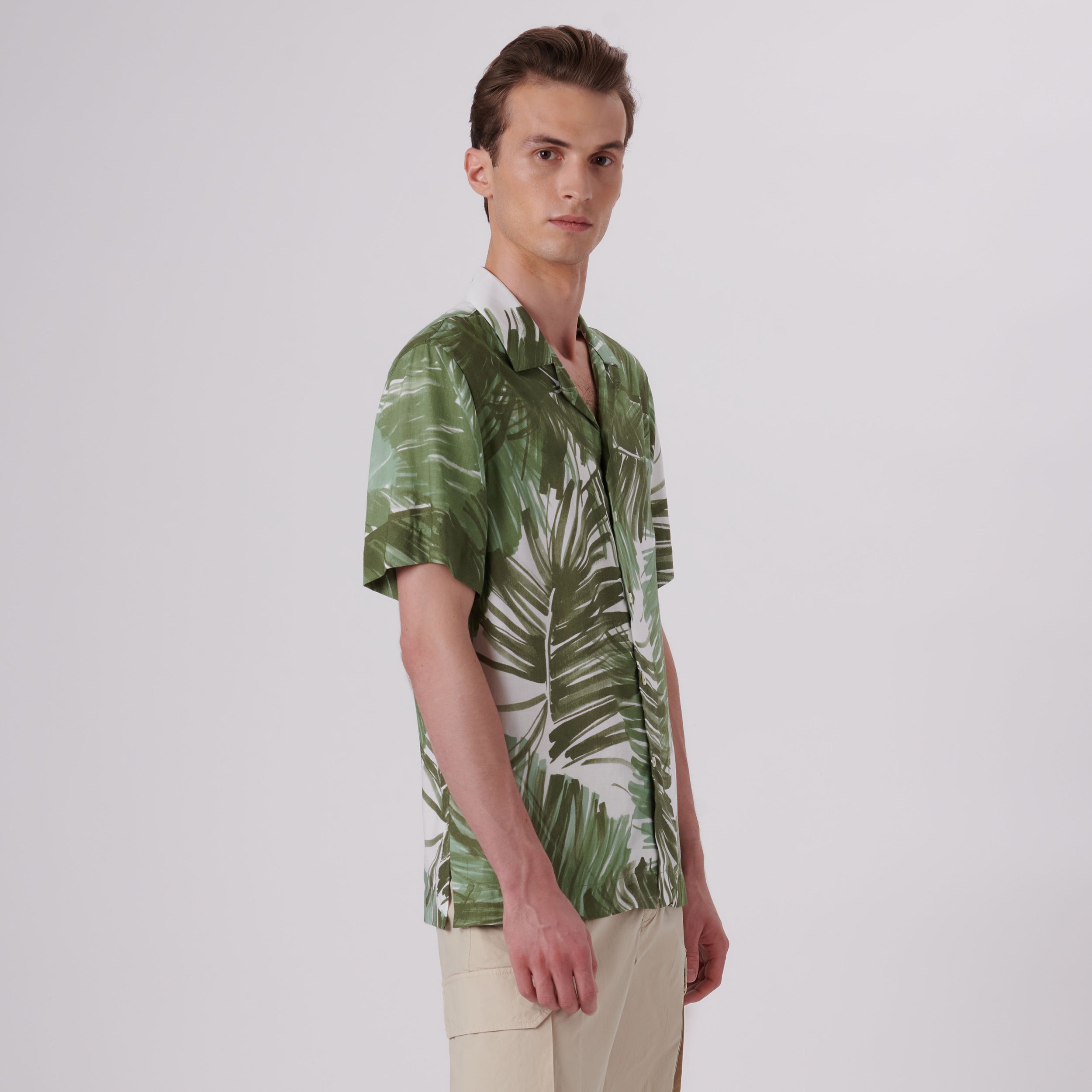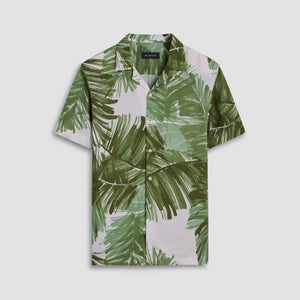 Jackson abstract print short-sleeved shirt in viscose and linen blend with camp collar, French placket, genuine shell buttons and a straight hemline.