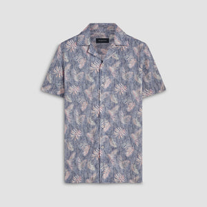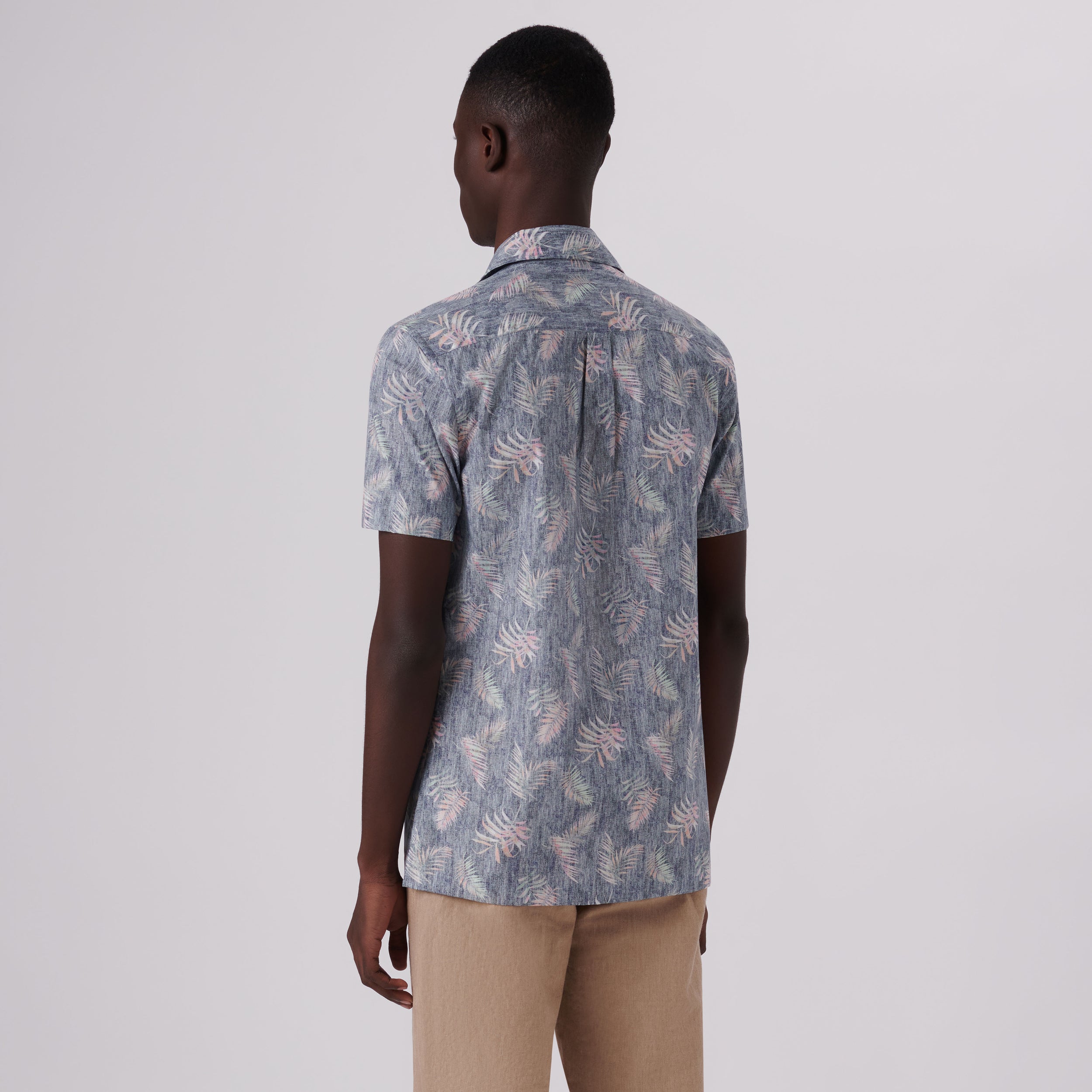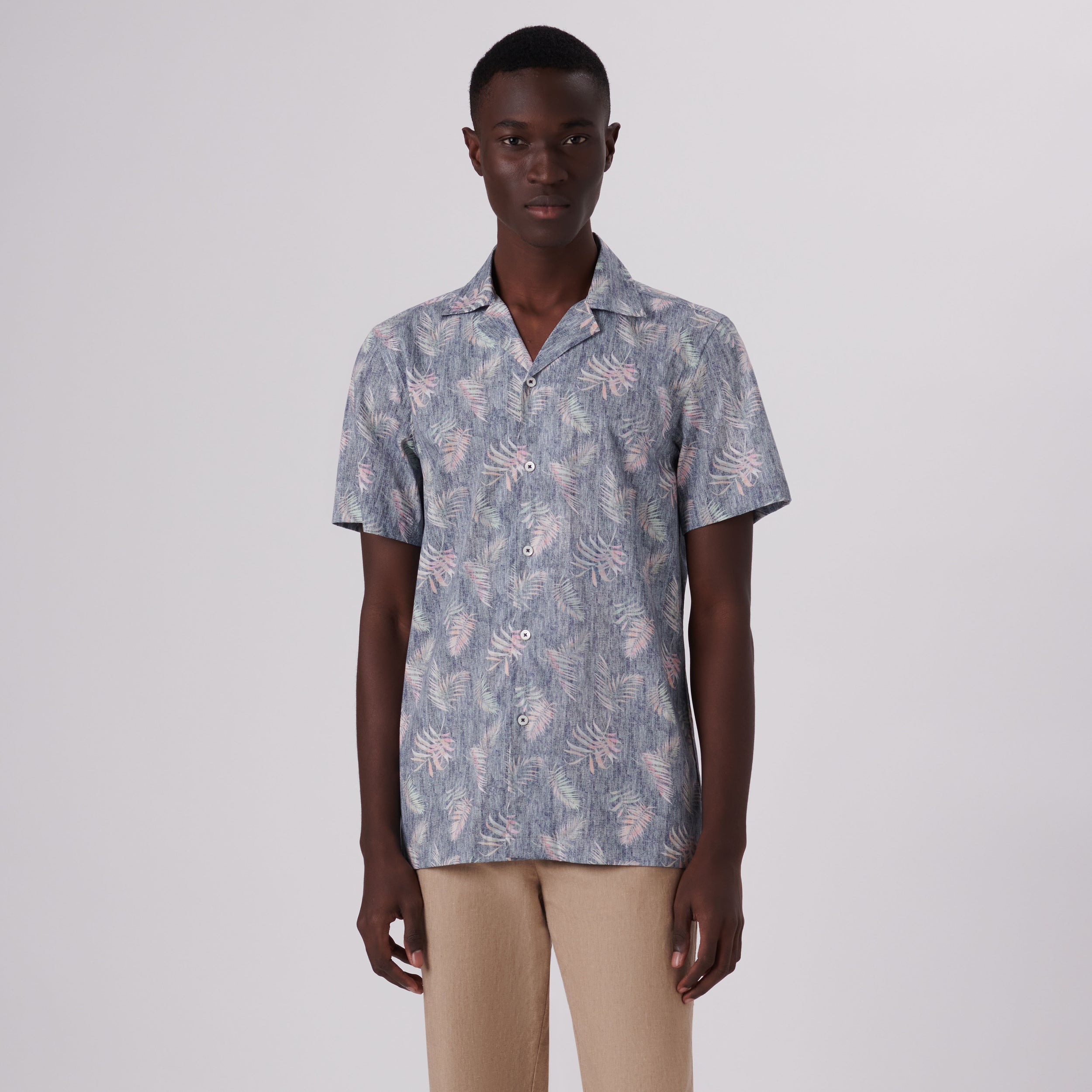 Jackson leaf print short-sleeved shirt in comfort stretch cotton with camp collar, French placket, genuine shell buttons and a straight hemline.