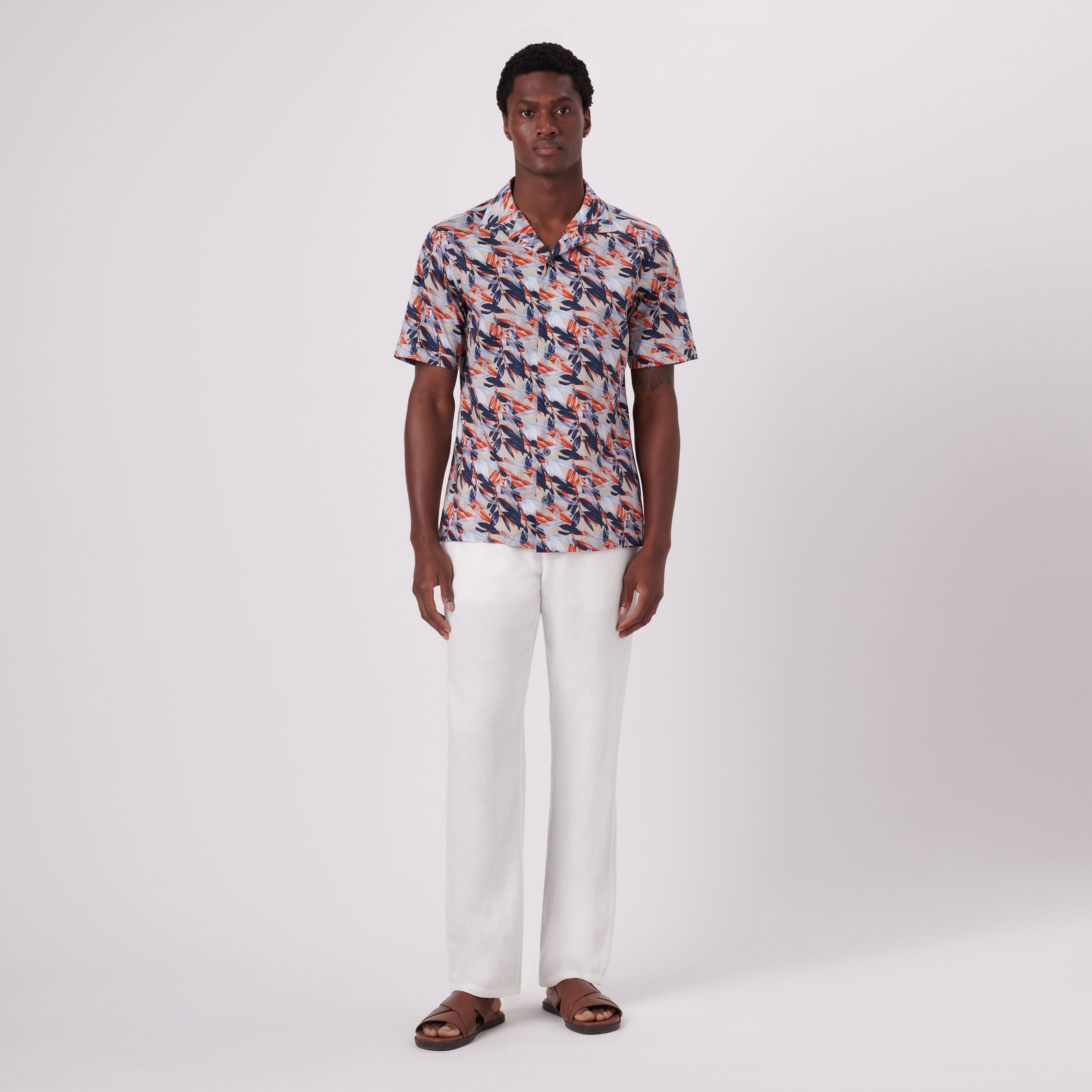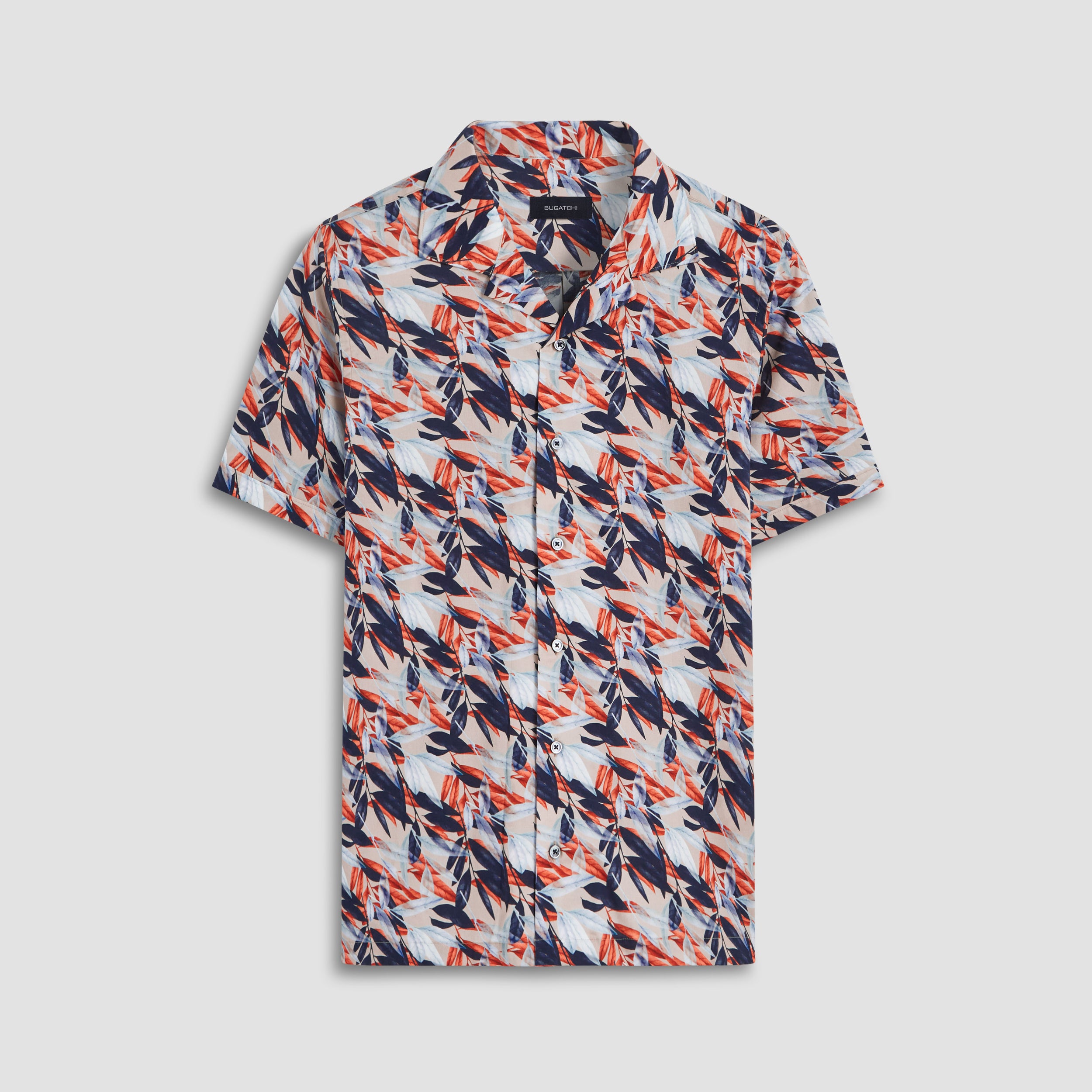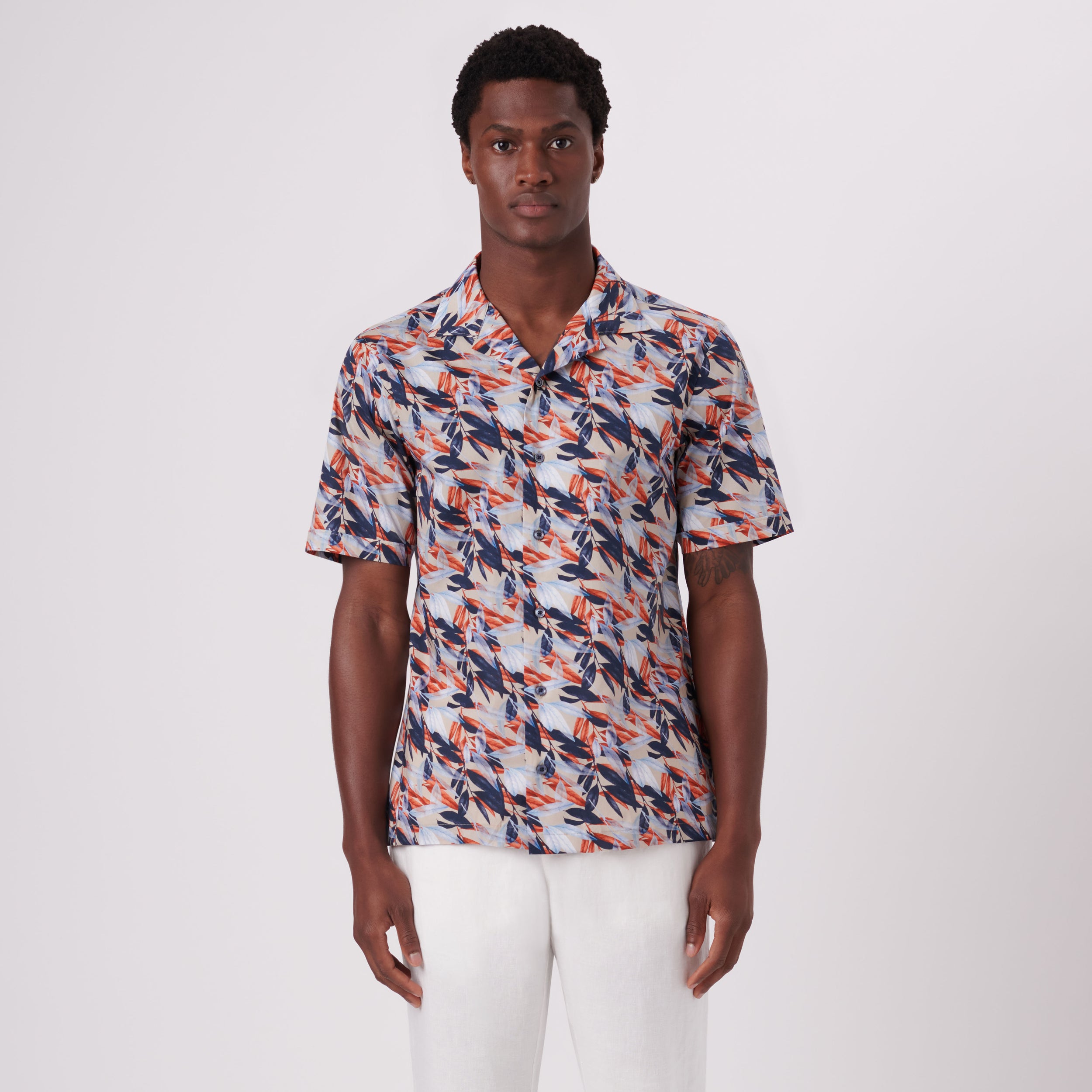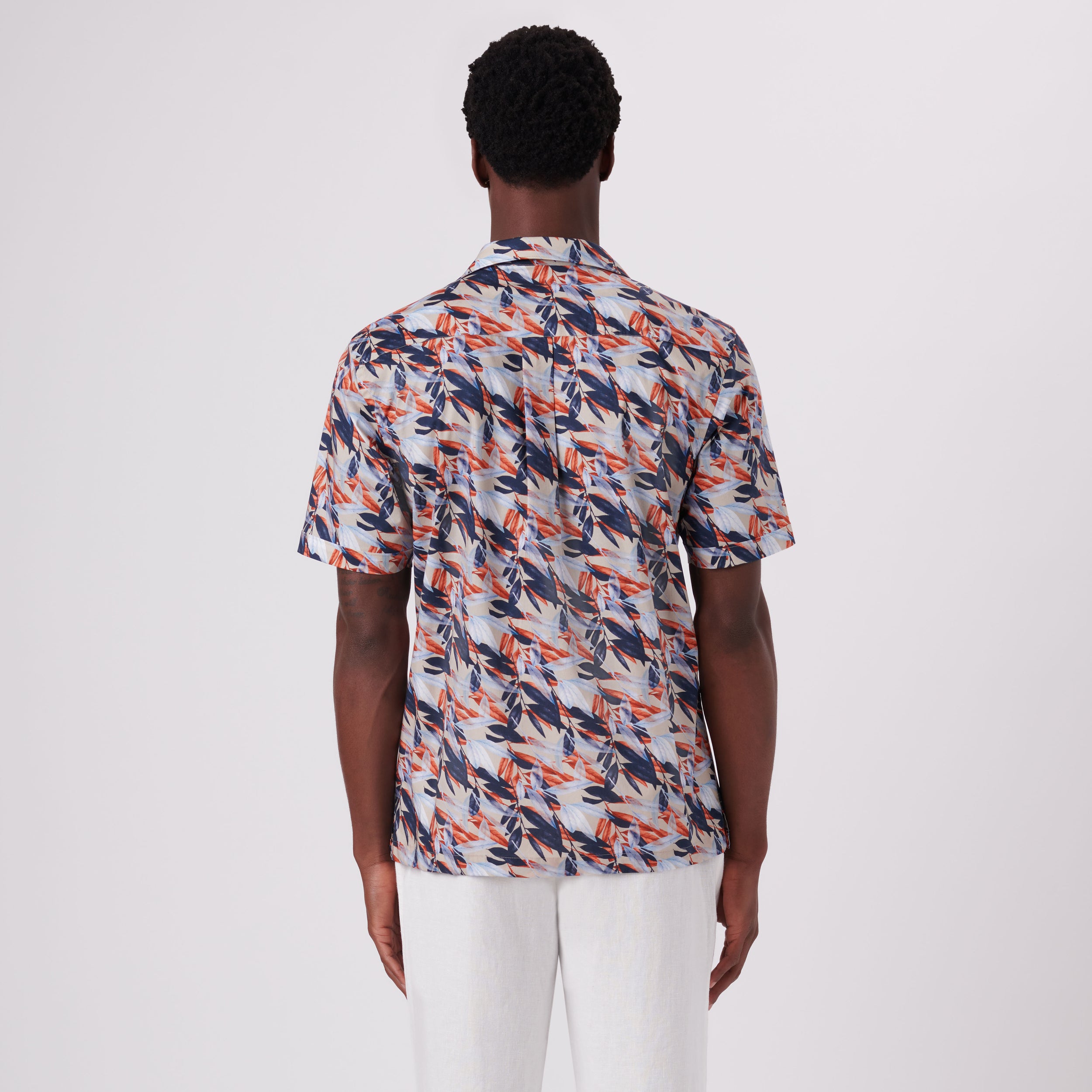 Jackson leaf print short-sleeved shirt in comfort stretch cotton with camp collar, French placket, genuine shell buttons and a straight hemline.