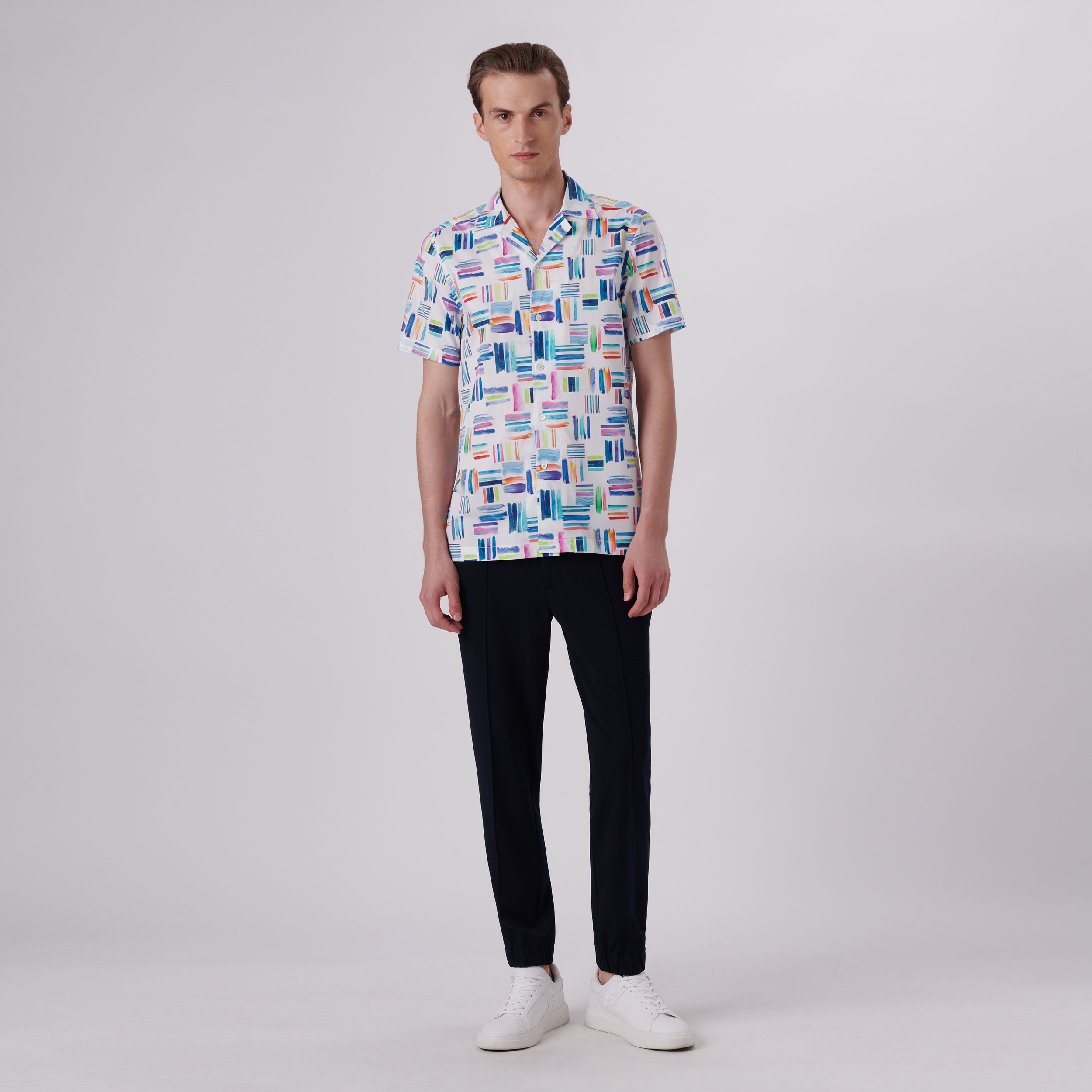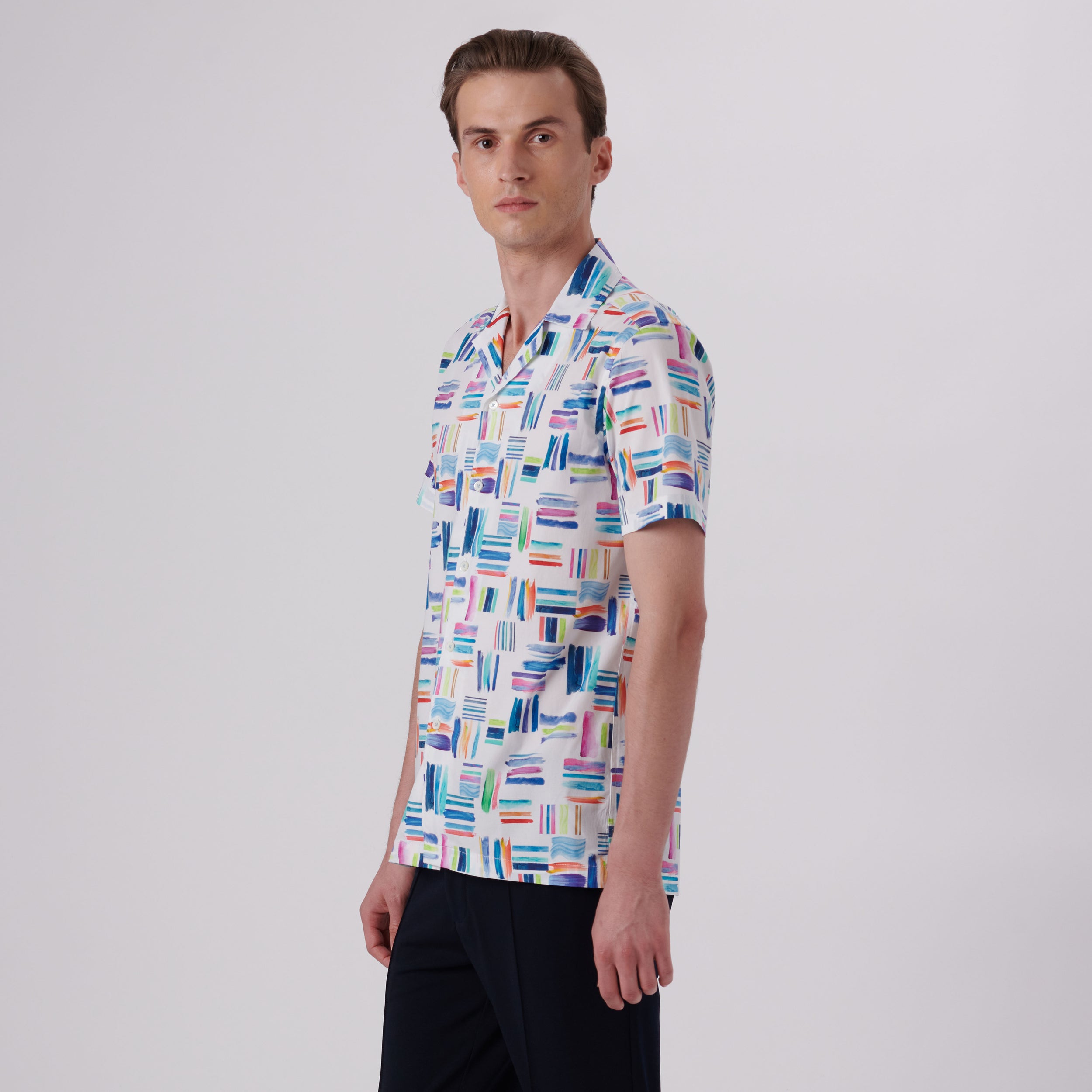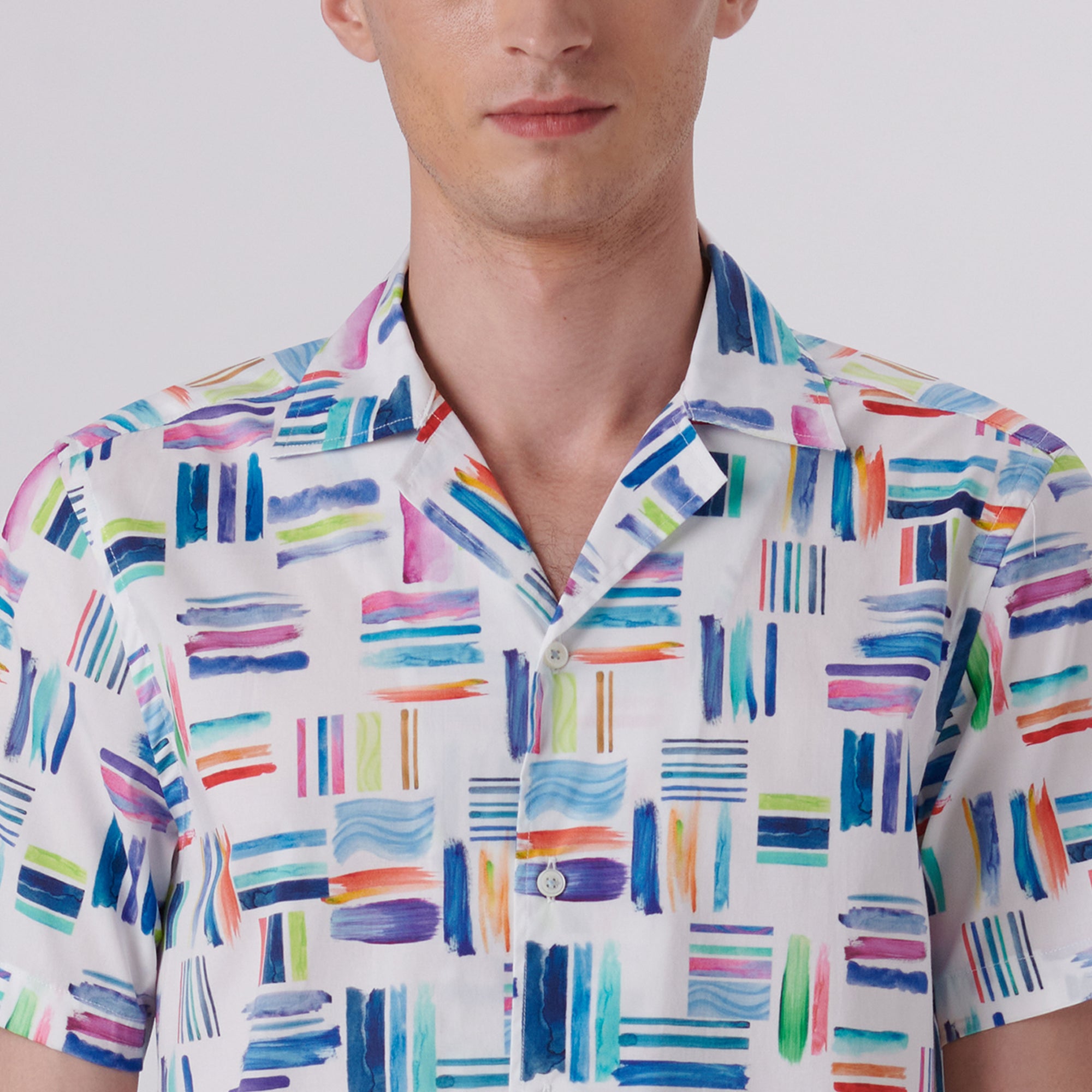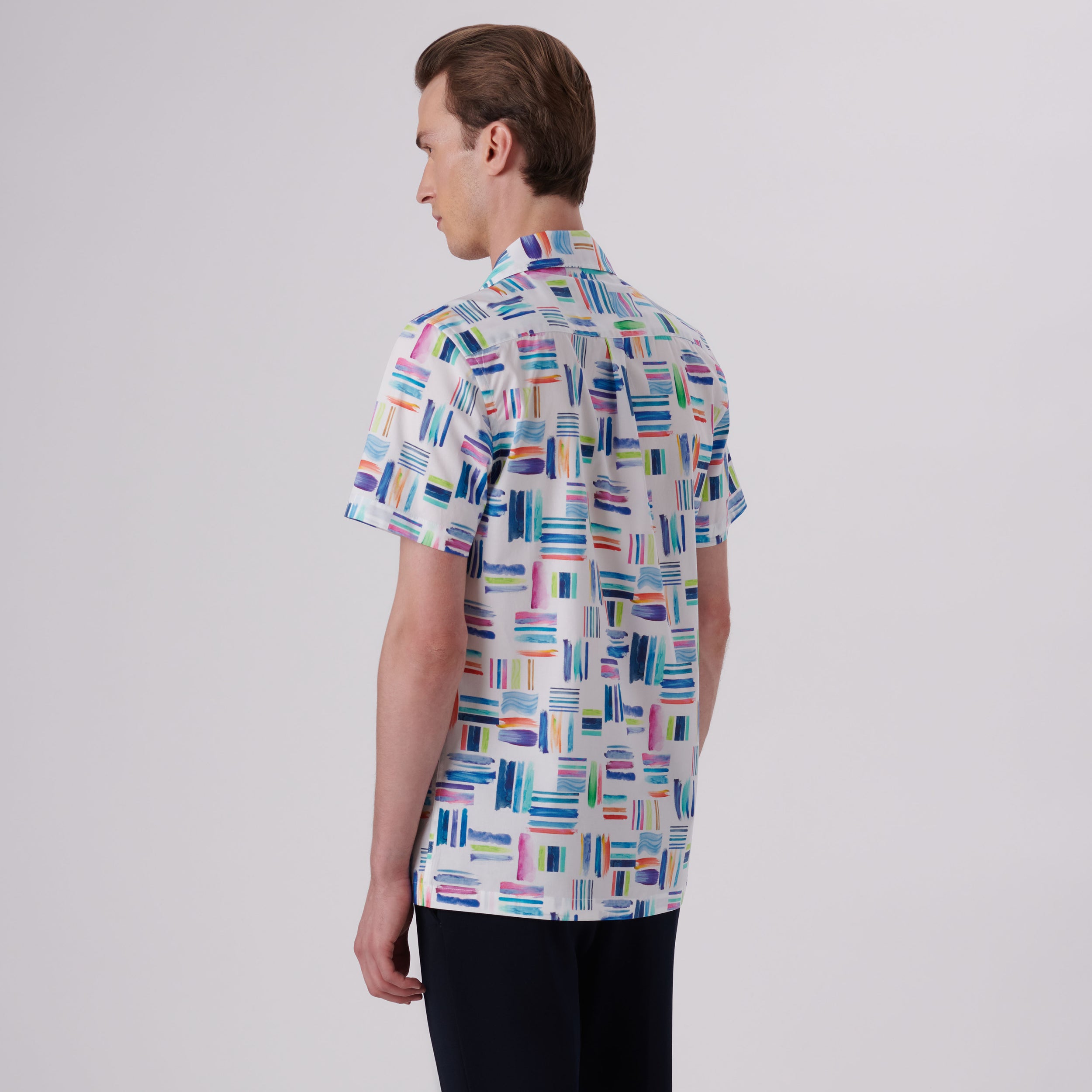 Jackson paint strokes print short-sleeved shirt in comfort stretch cotton with camp collar, French placket, genuine shell buttons and a straight hemline.