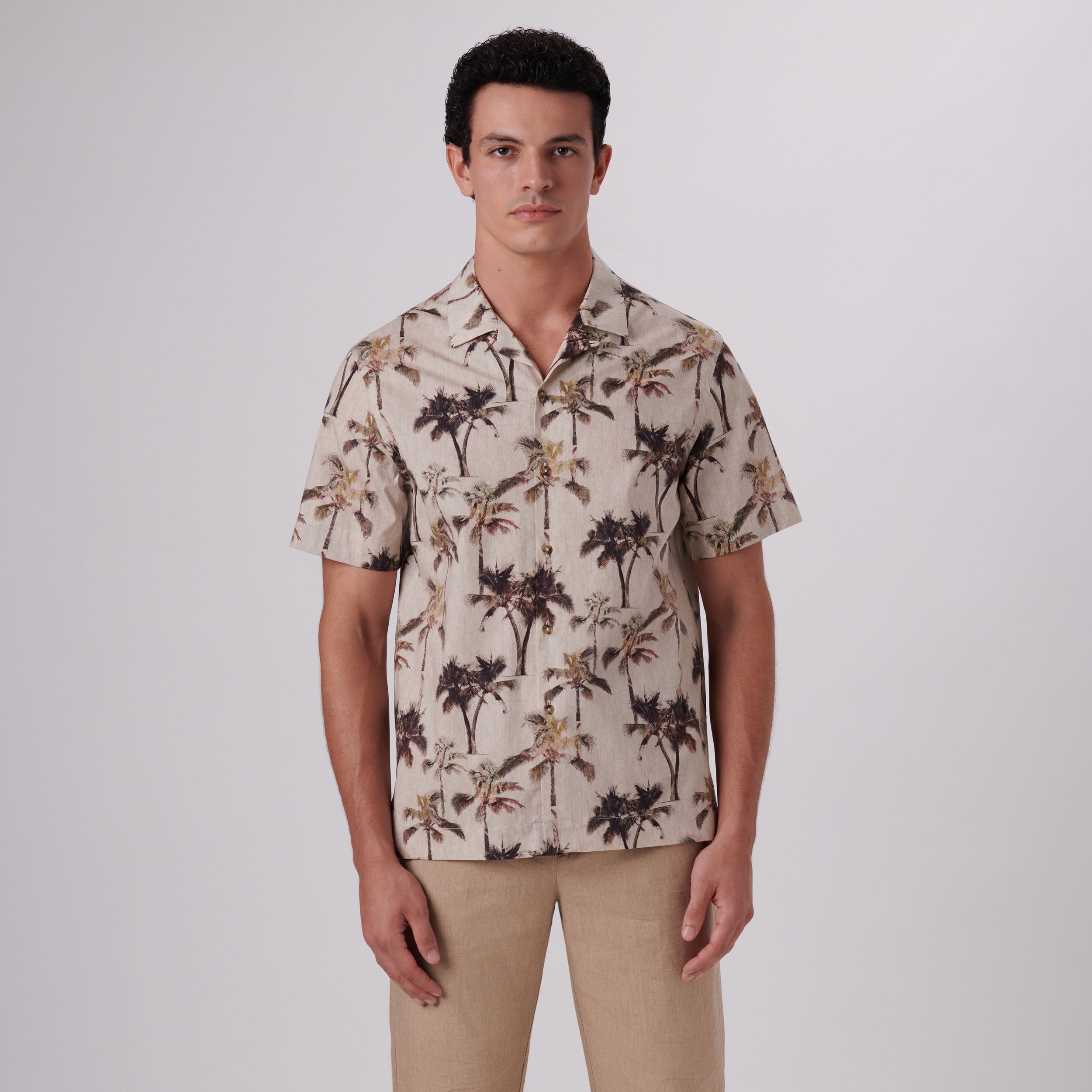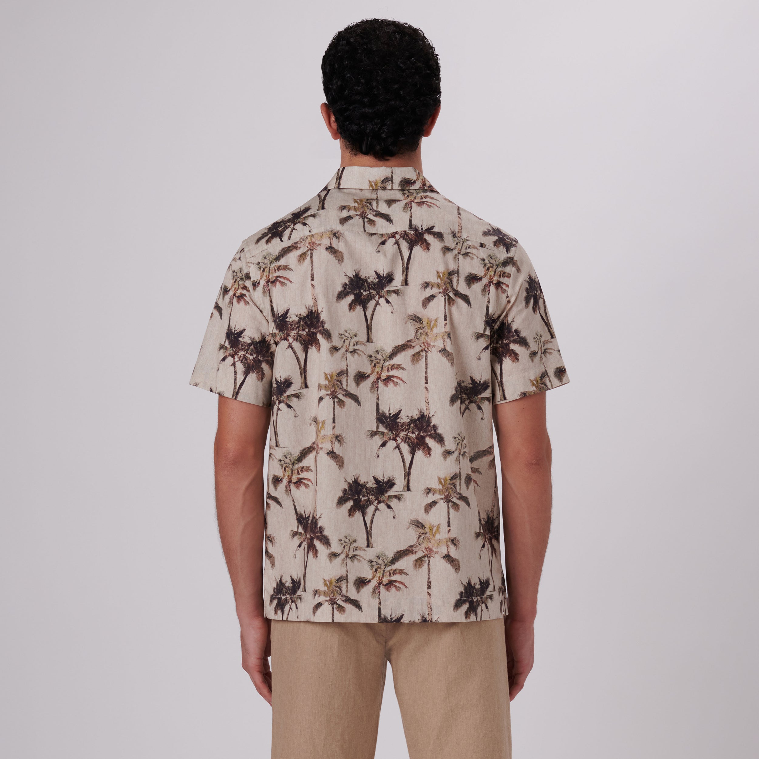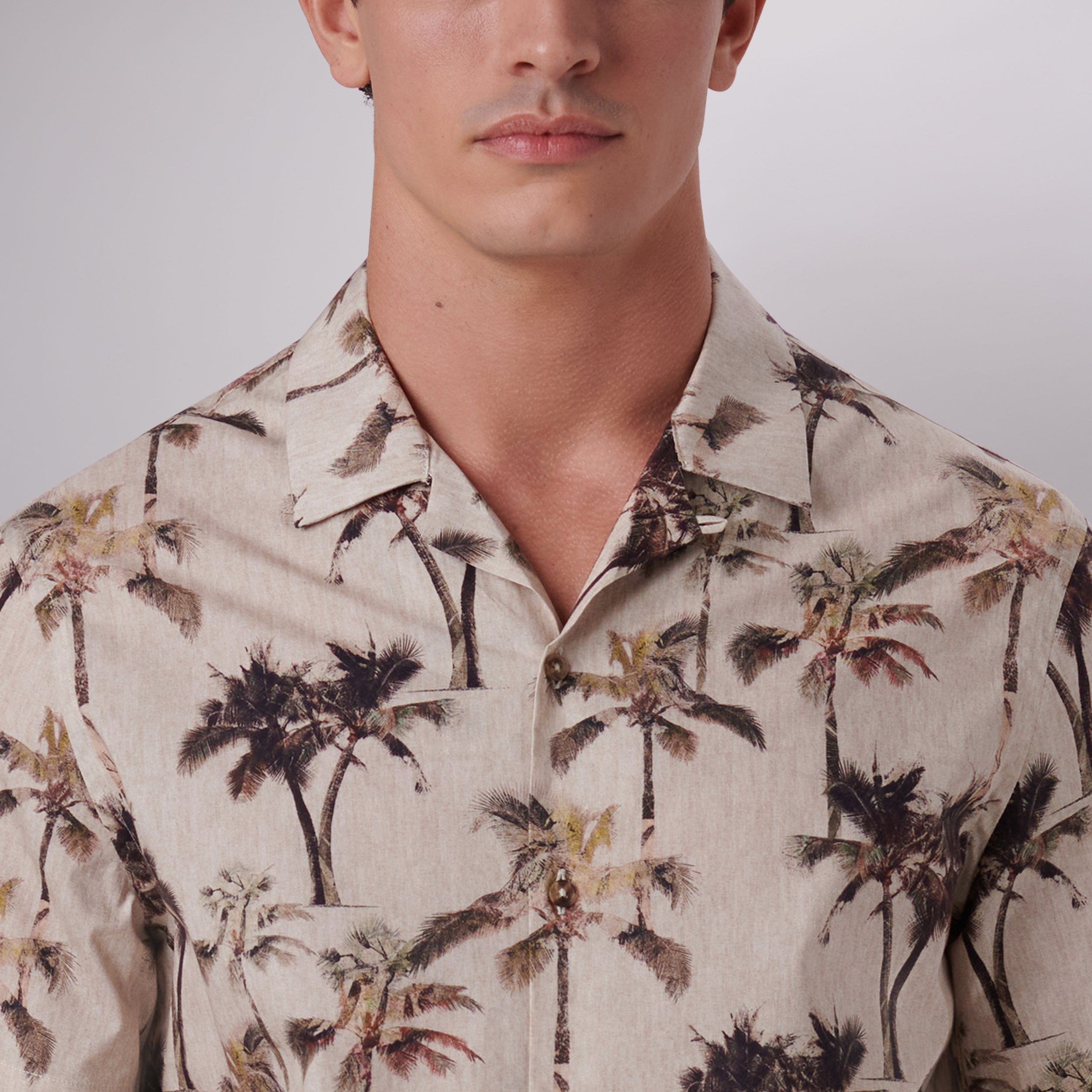 Jackson palm tree print short-sleeved shirt in comfort stretch cotton with camp collar, French placket, genuine shell buttons and a straight hemline.