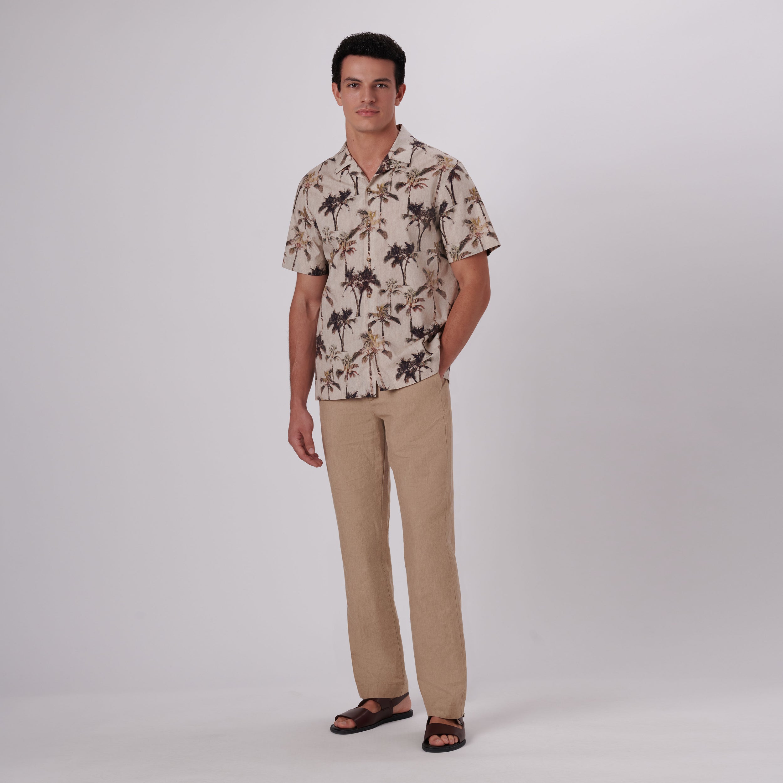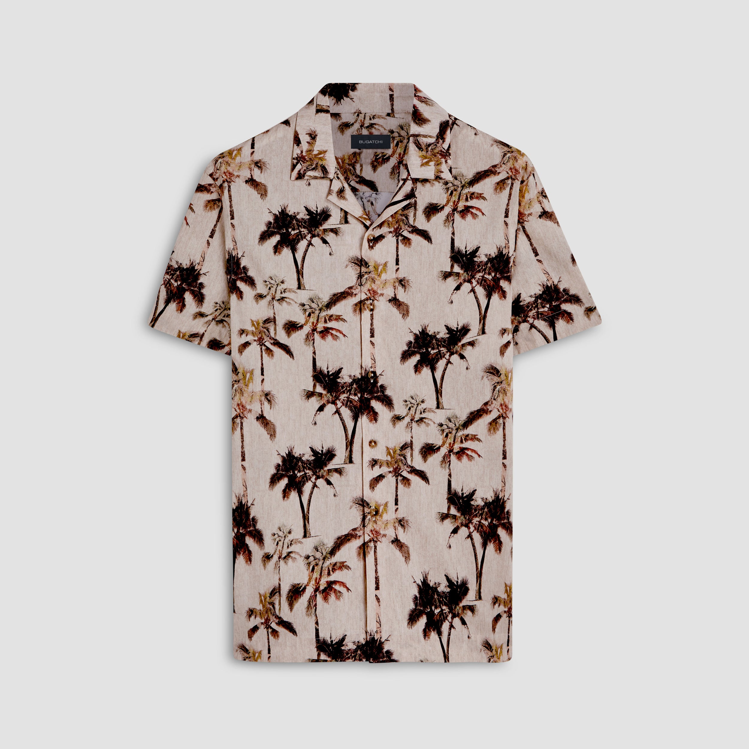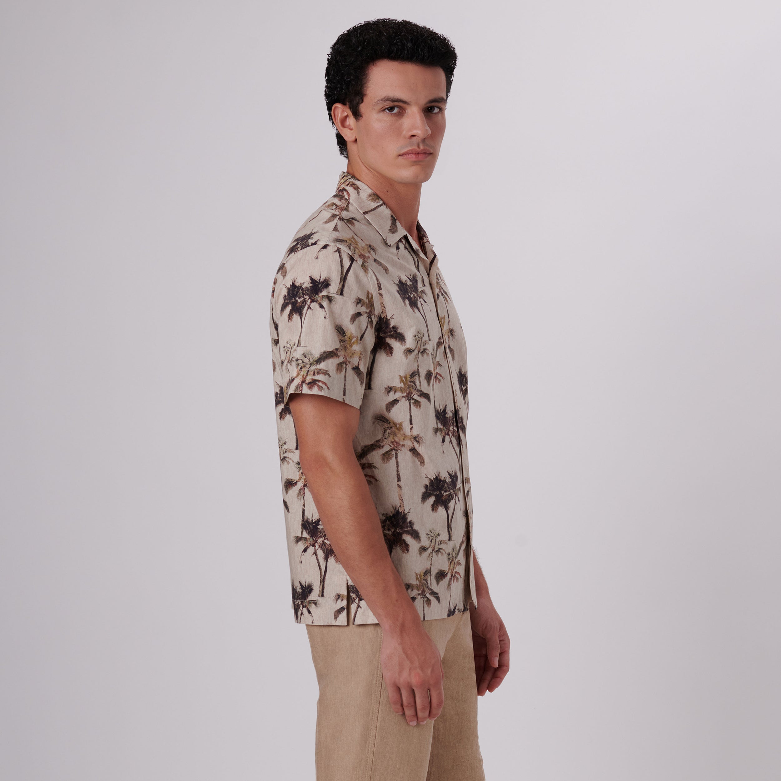 Jackson palm tree print short-sleeved shirt in comfort stretch cotton with camp collar, French placket, genuine shell buttons and a straight hemline.