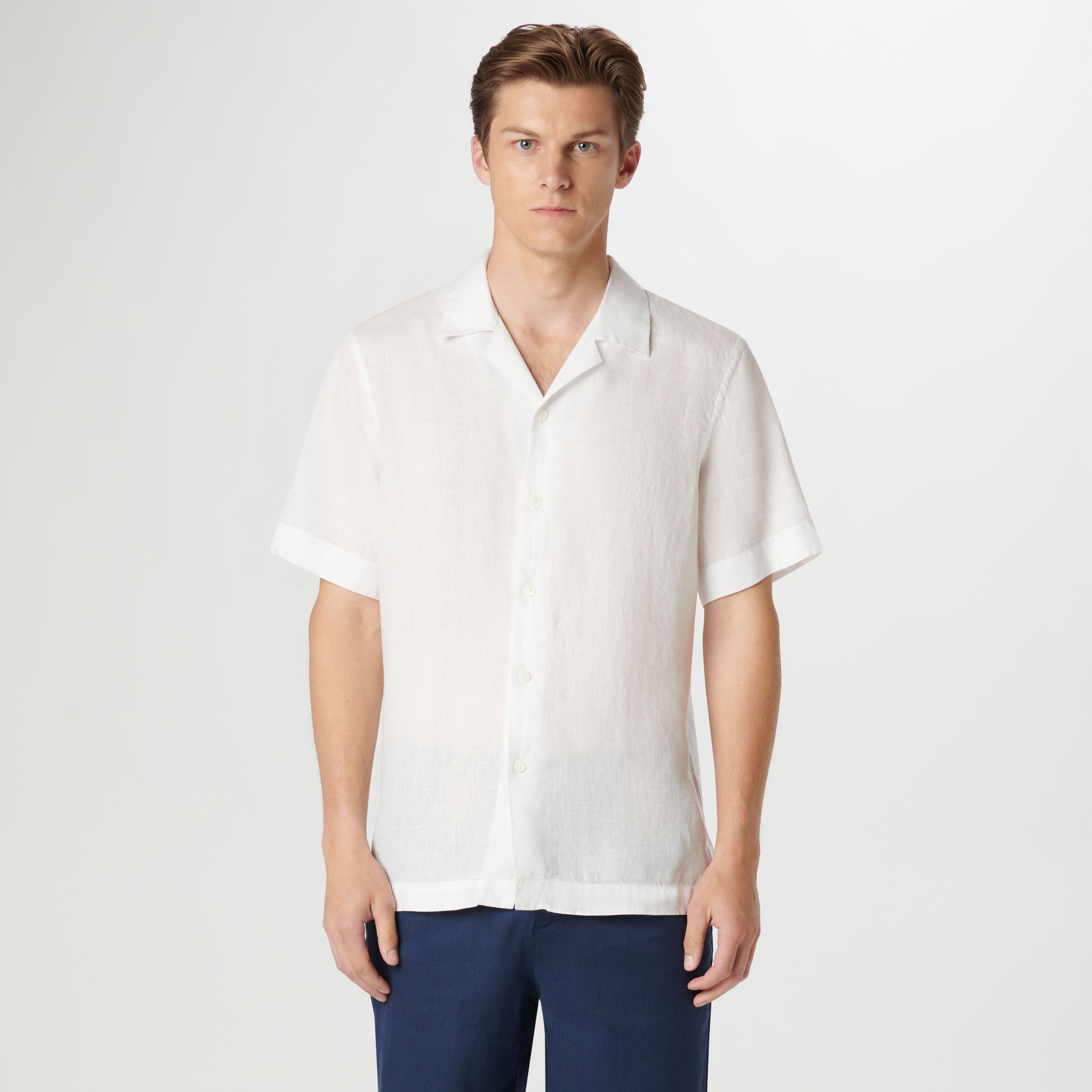 Jackson solid short-sleeved shirt in 100% linen with camp collar, French placket, genuine shell buttons and a straight hemline.