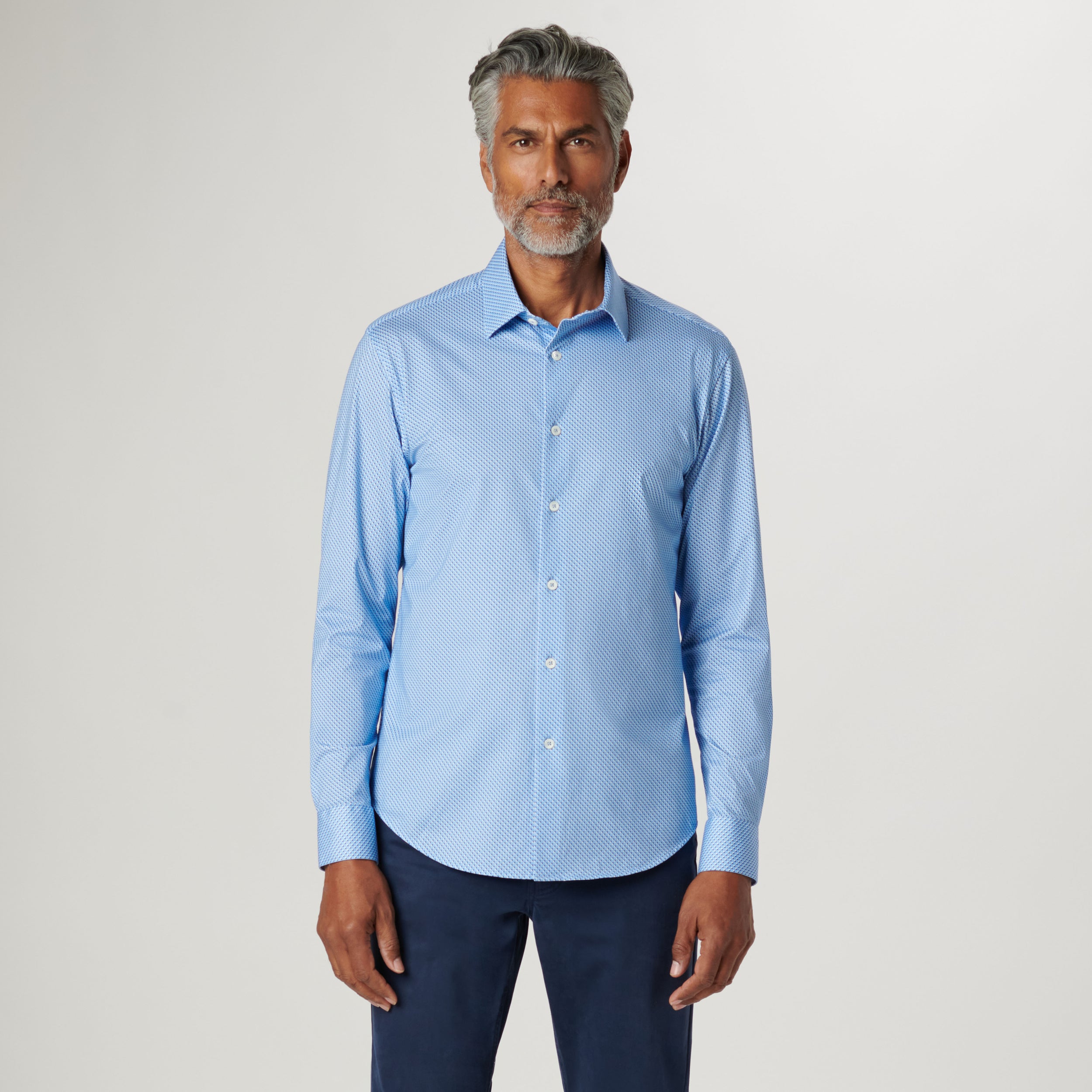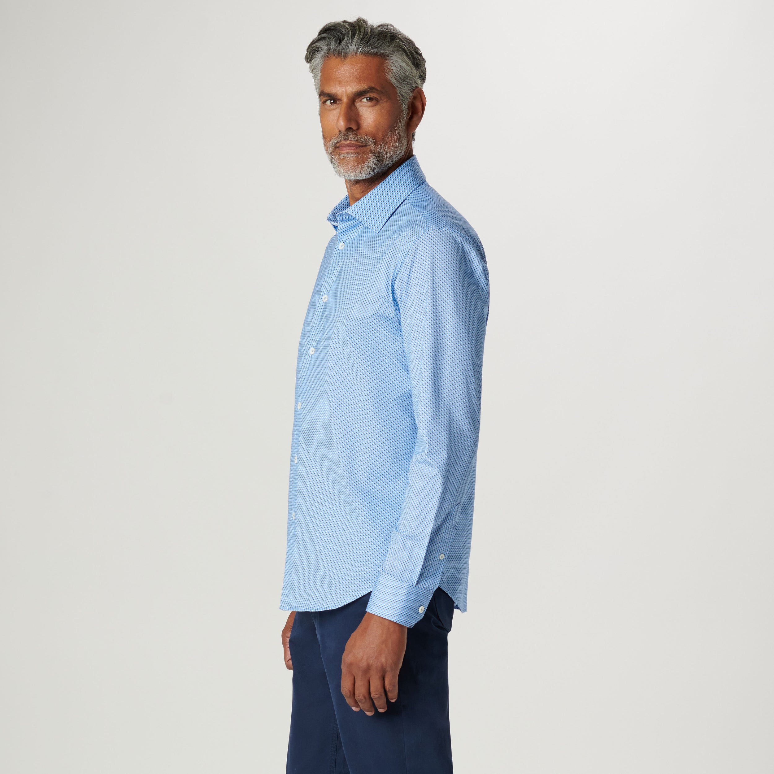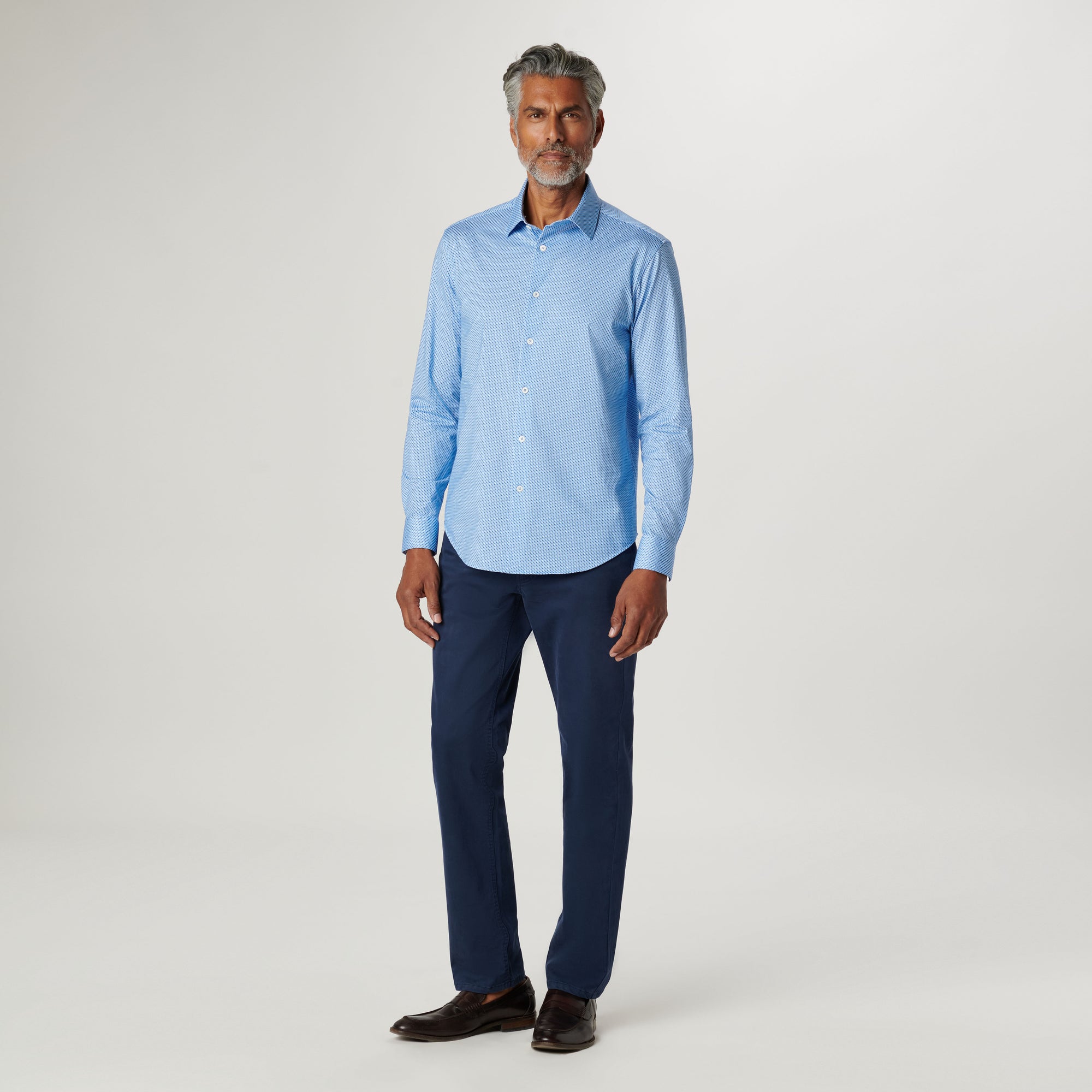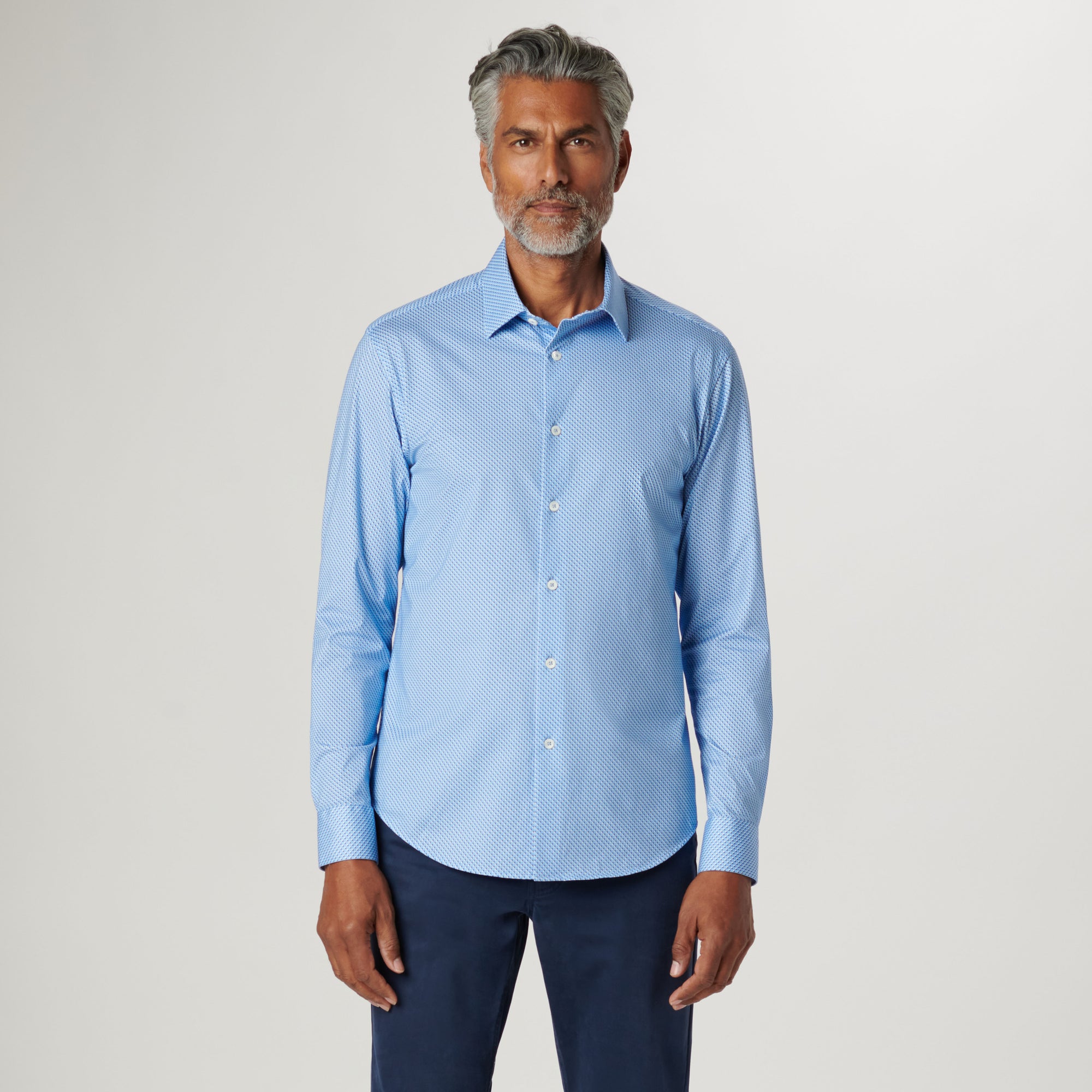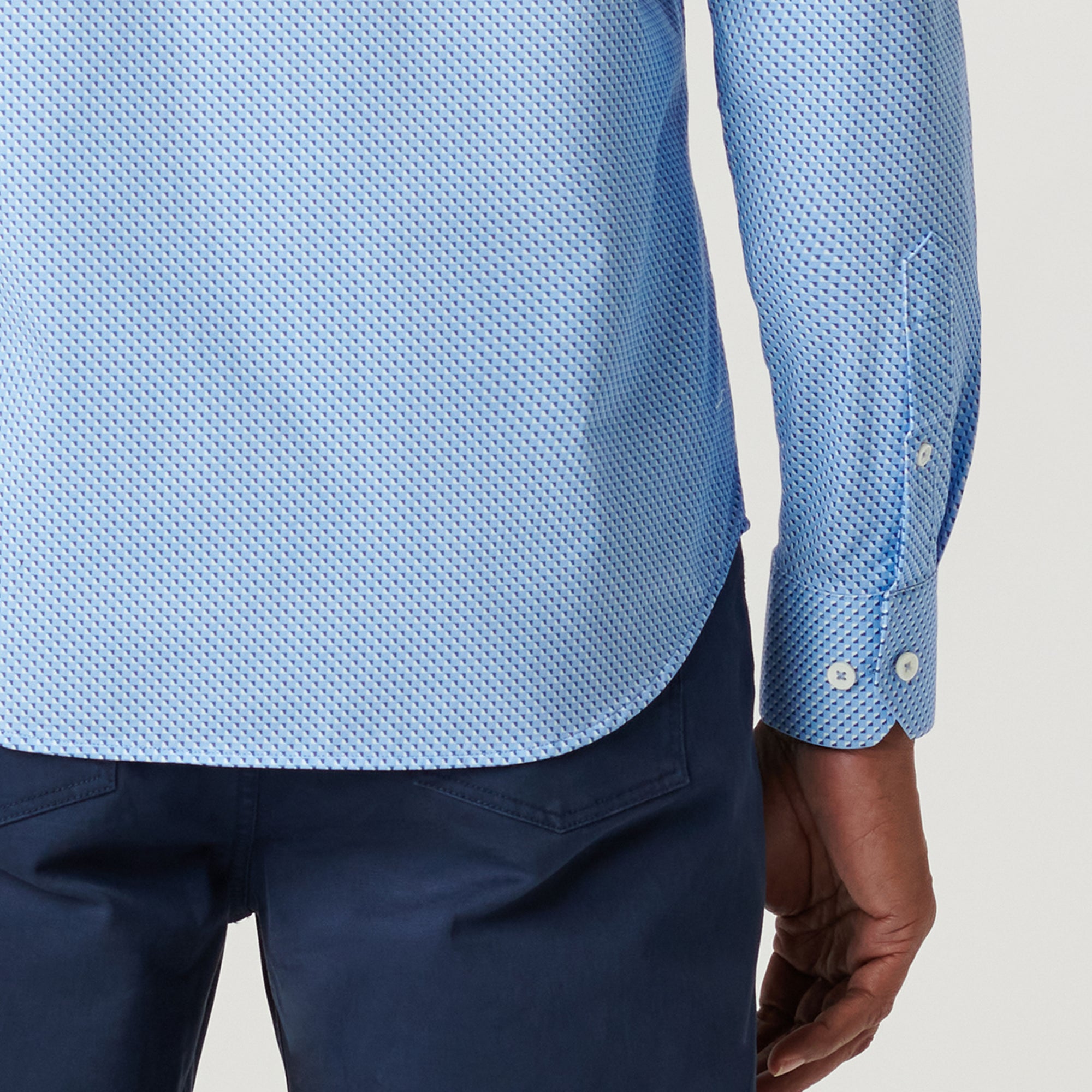 The James long-sleeved shirt features a geometric print on OoohCotton fabric, a point collar, adjustable notched cuffs, genuine shell buttons, and a curved hem. OoohCotton is a double-mercerized, wrinkle-resistant, breathable, and easy-care cotton blend with 8-way stretch, quick-dry, and thermal comfort properties.