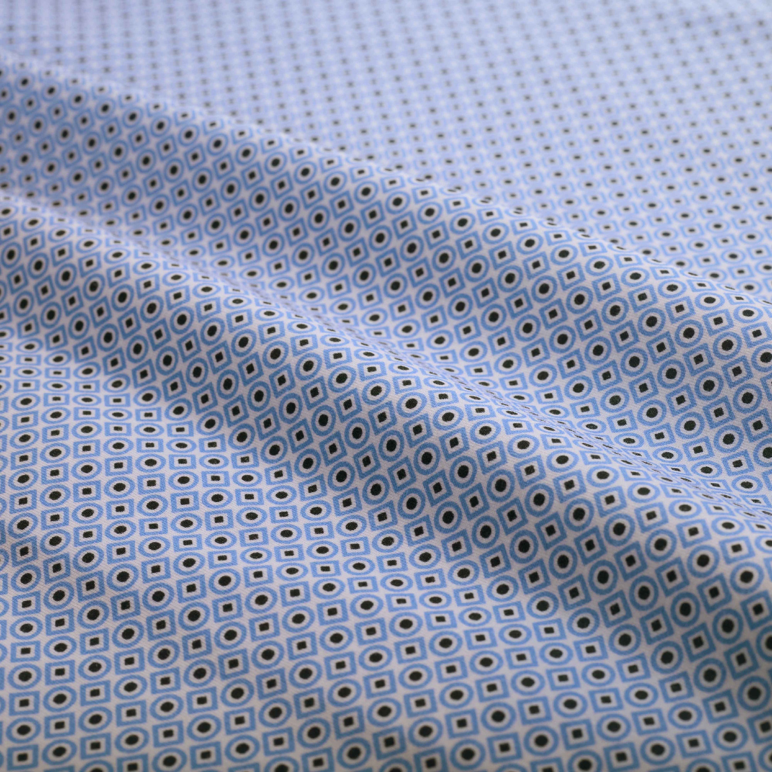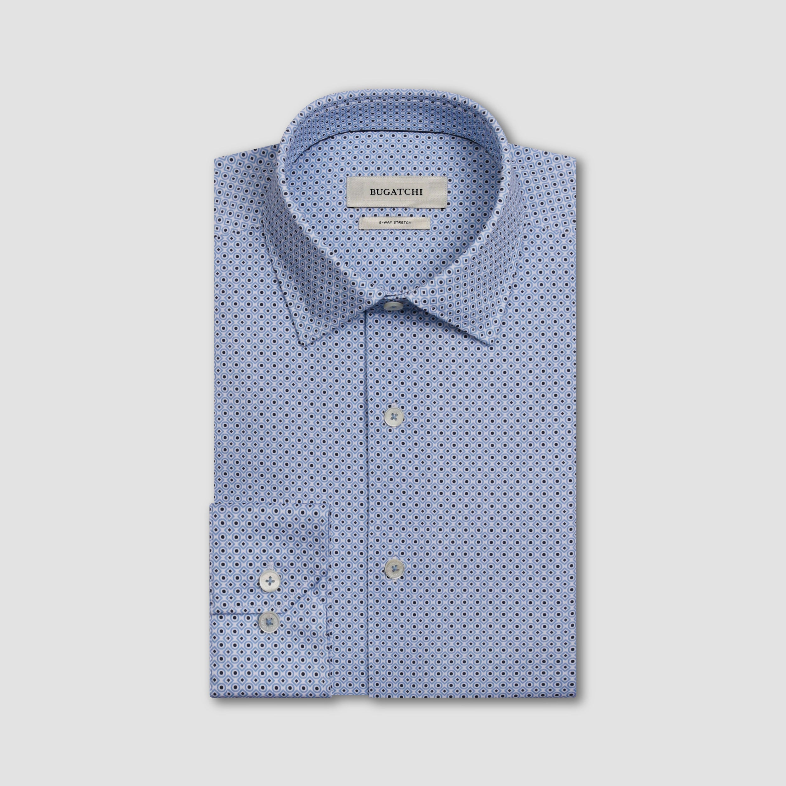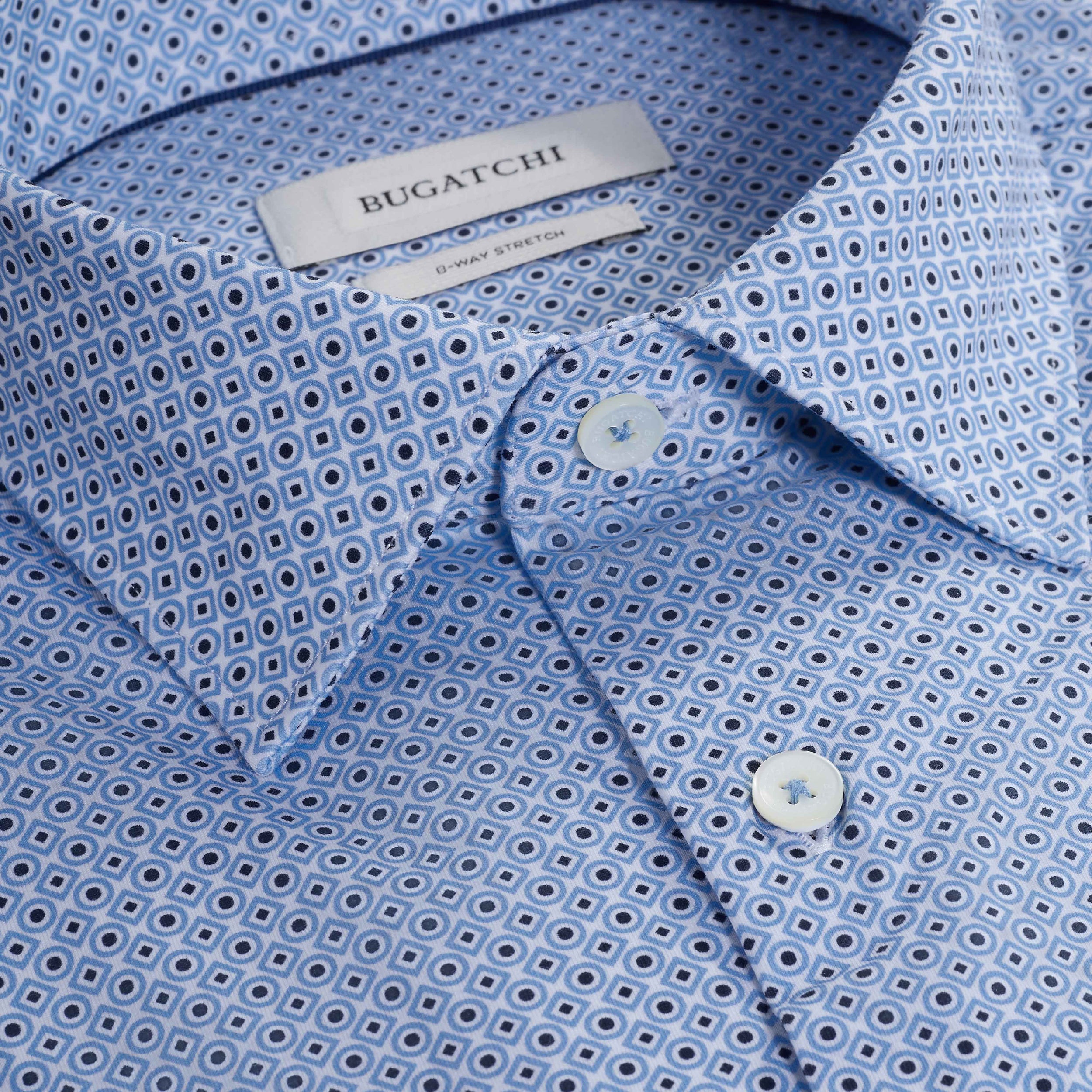 The James OoohCotton long-sleeved shirt in geometric print features a point collar, mother-of-pearl buttons, and a curved hem for a sleek tucked or untucked look. The notched cuffs are adjustable to allow for customized fit and also convertible to accommodate cufflinks. OoohCotton is a performance, double-mercerized, wrinkle-resistant, breathable, and easy-care cotton blend with 8-way stretch, quick-dry, and thermal comfort properties.