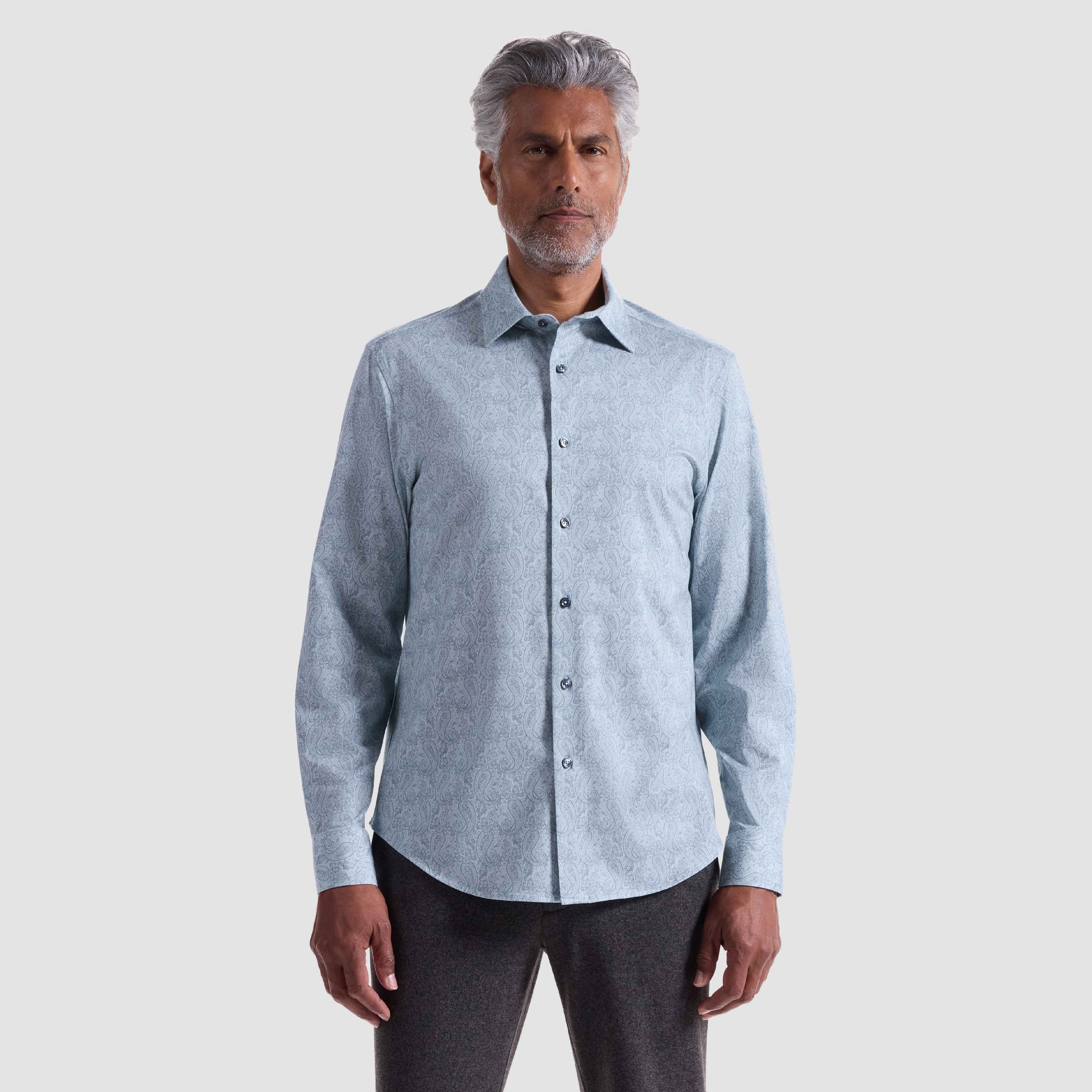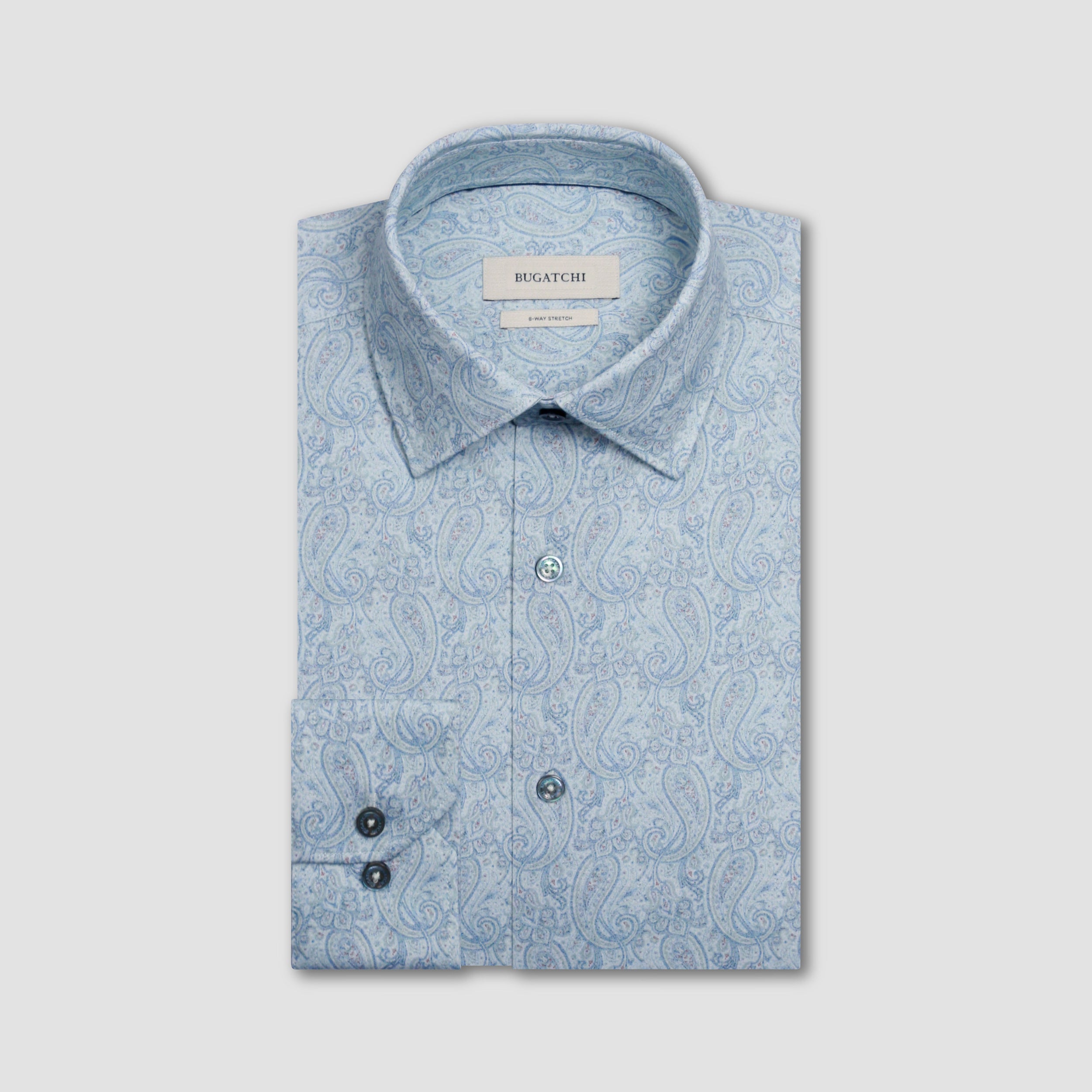 The James OoohCotton long-sleeved shirt in paisley print features a point collar, mother-of-pearl buttons, and a curved hem for a sleek tucked or untucked look. The notched cuffs are adjustable to allow for customized fit and also convertible to accommodate cufflinks. OoohCotton is a performance, double-mercerized, wrinkle-resistant, breathable, and easy-care cotton blend with 8-way stretch, quick-dry, and thermal comfort properties.