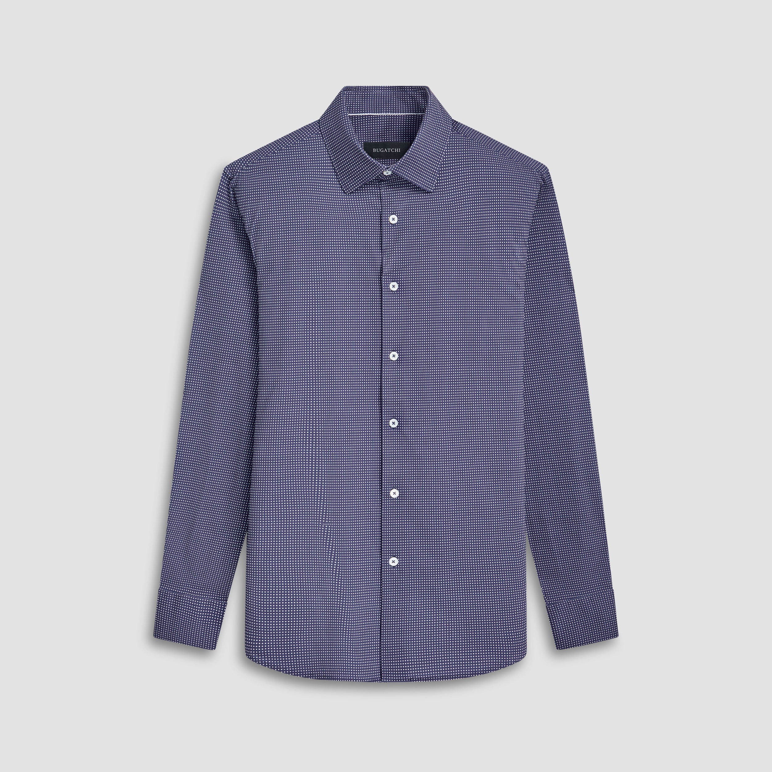 The James long-sleeved shirt features a pin dot print on OoohCotton fabric, a point collar, adjustable notched cuffs, genuine shell buttons, and a curved hem. OoohCotton is a double-mercerized, wrinkle-resistant, breathable, and easy-care cotton blend with 8-way stretch, quick-dry, and thermal comfort properties.