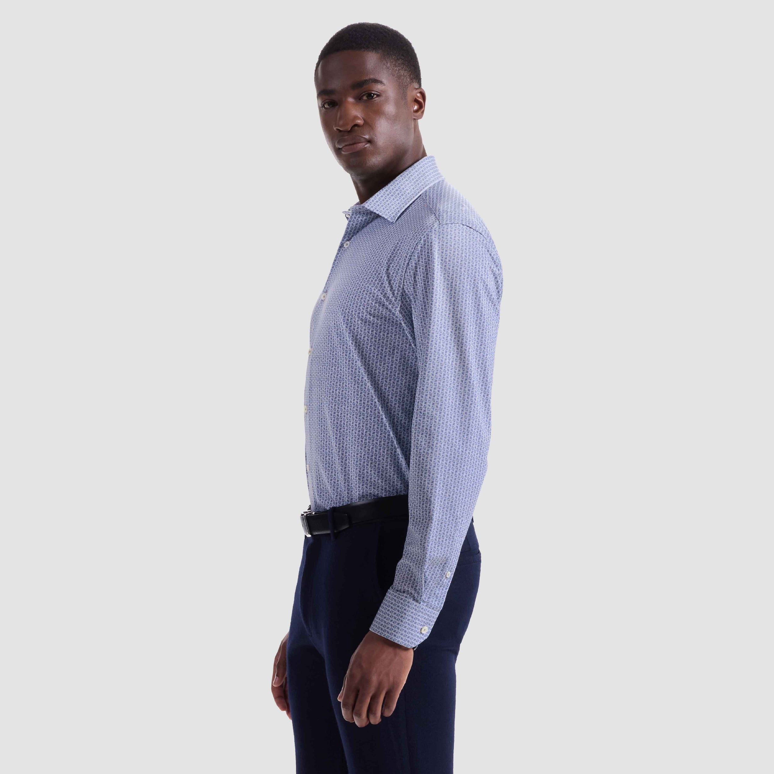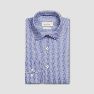 The James OoohCotton long-sleeved shirt in tile print features a point collar, mother-of-pearl buttons, and a curved hem for a sleek tucked or untucked look. The notched cuffs are adjustable to allow for customized fit and also convertible to accommodate cufflinks. OoohCotton is a performance, double-mercerized, wrinkle-resistant, breathable, and easy-care cotton blend with 8-way stretch, quick-dry, and thermal comfort properties.