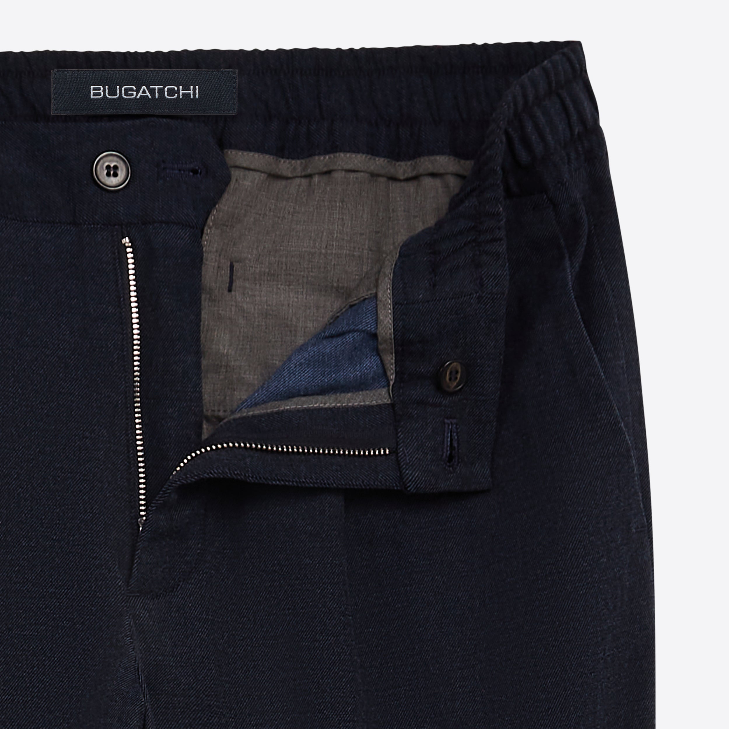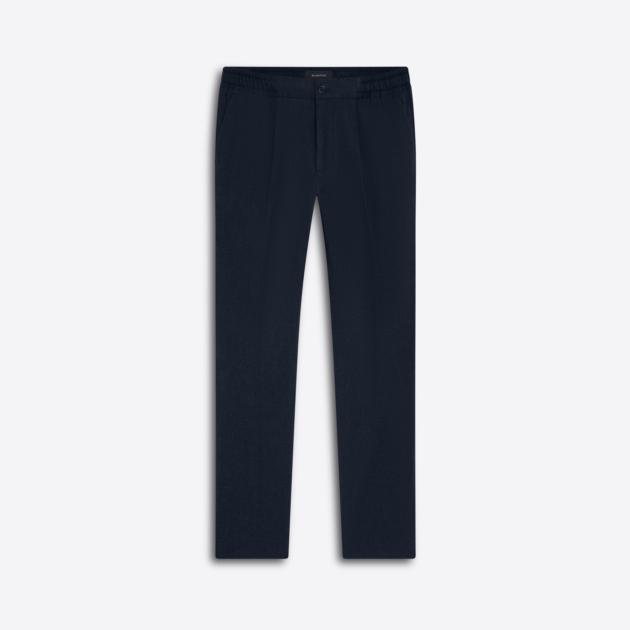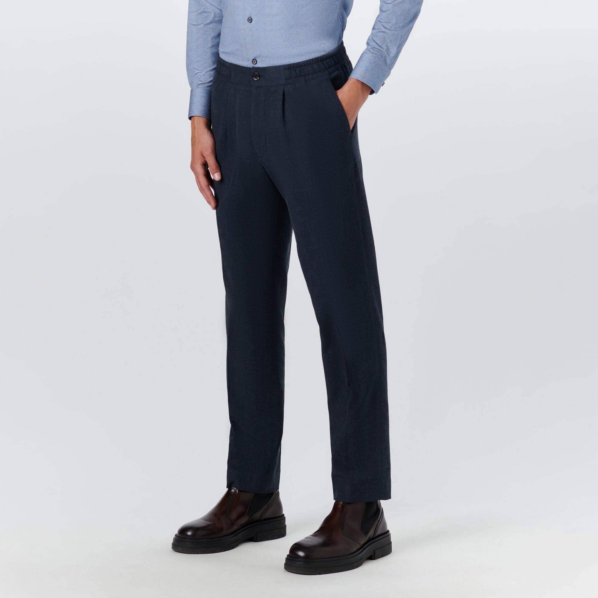 Jasper slim, straight leg, single pleat chino pant in twill with stretch, elasticized waistband, side pockets and buttoned reese back pockets. Made in Portugal.