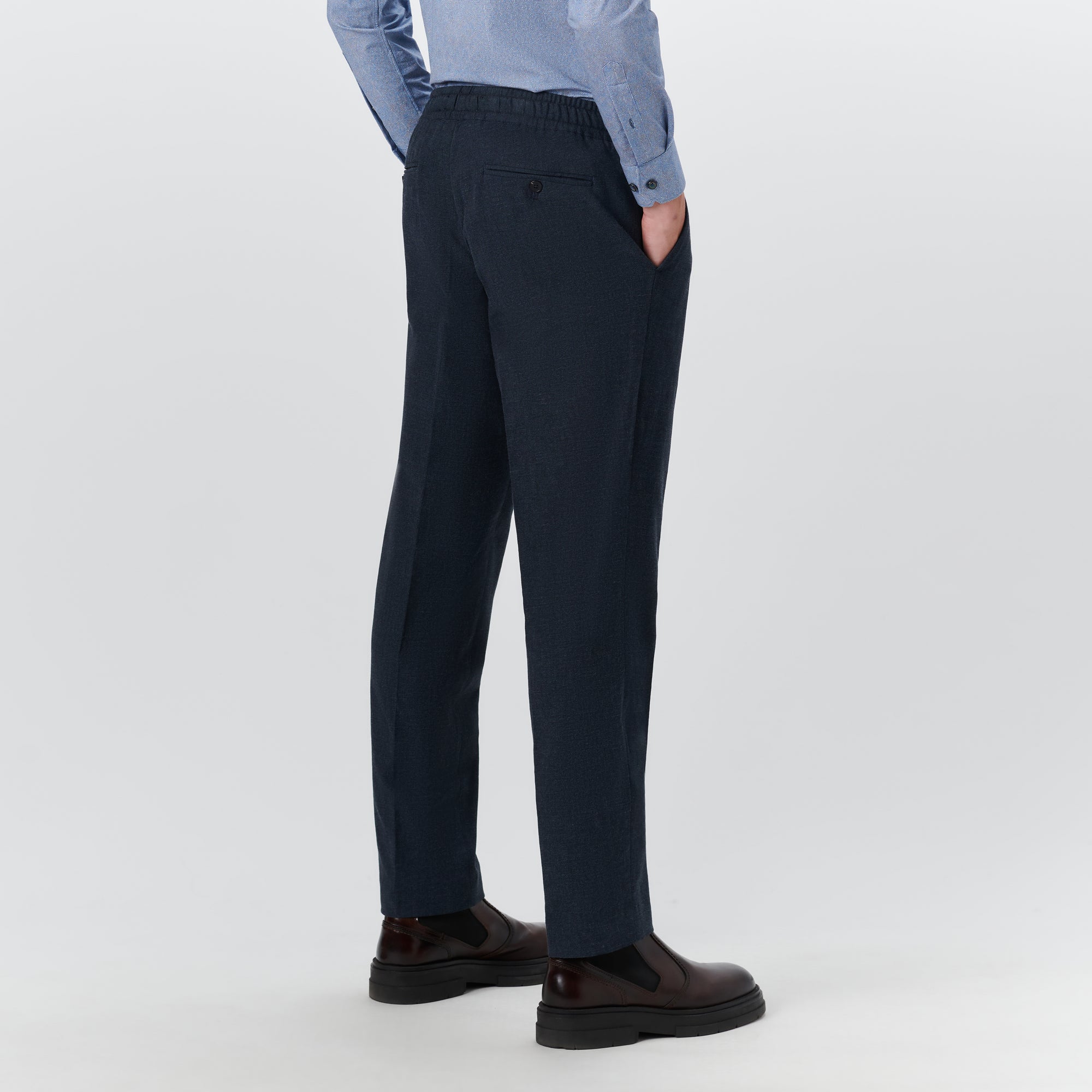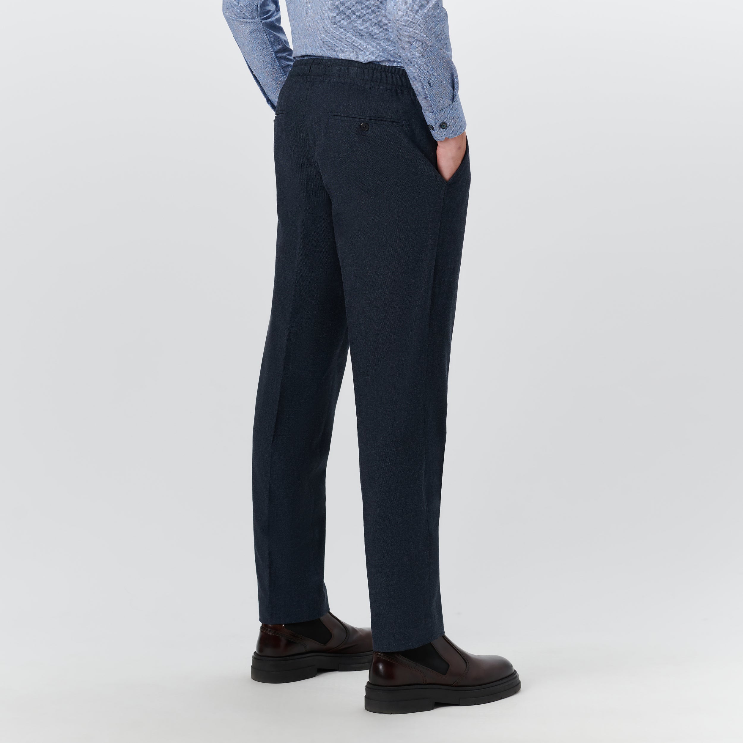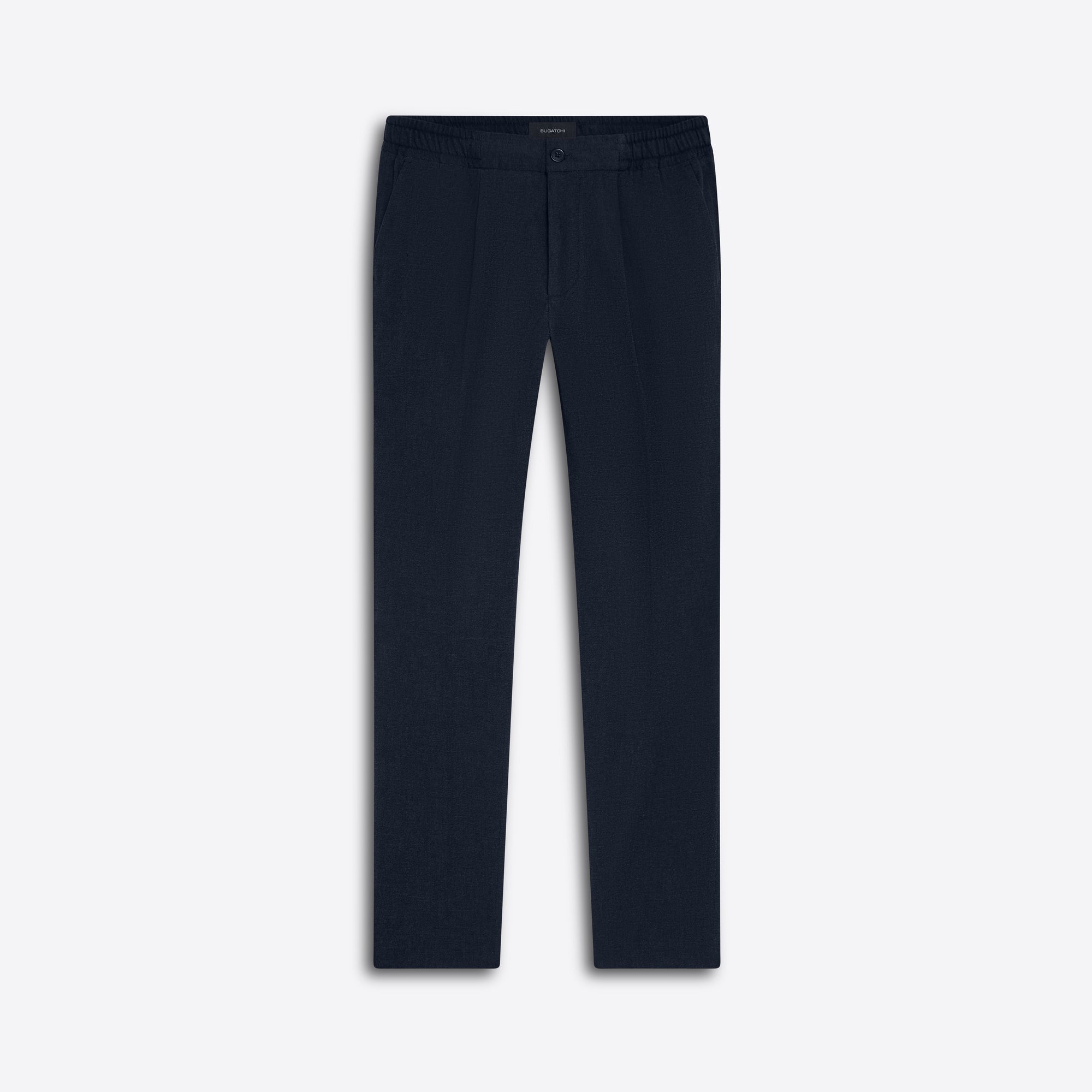 Jasper slim, straight leg, single pleat chino pant in twill with stretch, elasticized waistband, side pockets and buttoned reese back pockets. Made in Portugal.