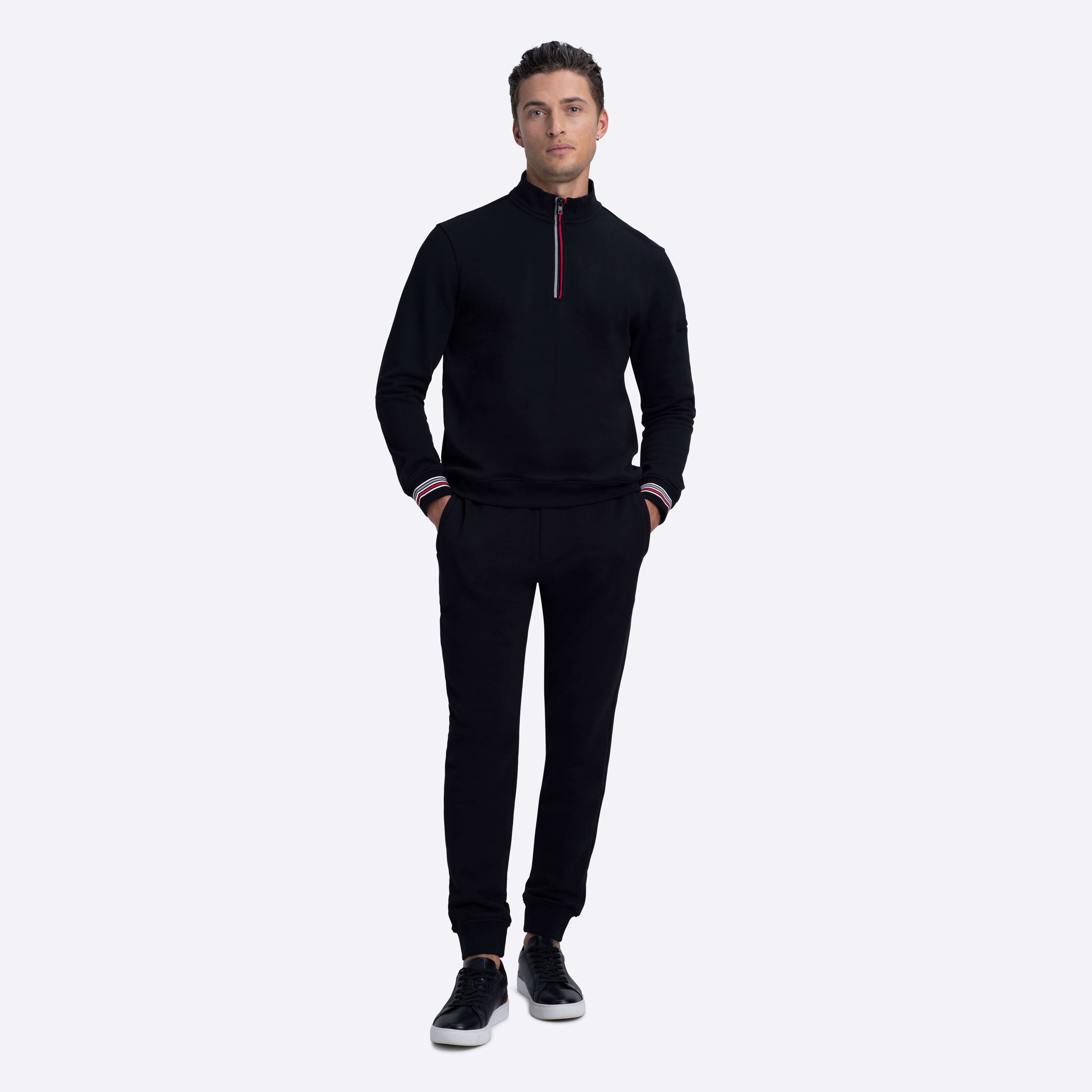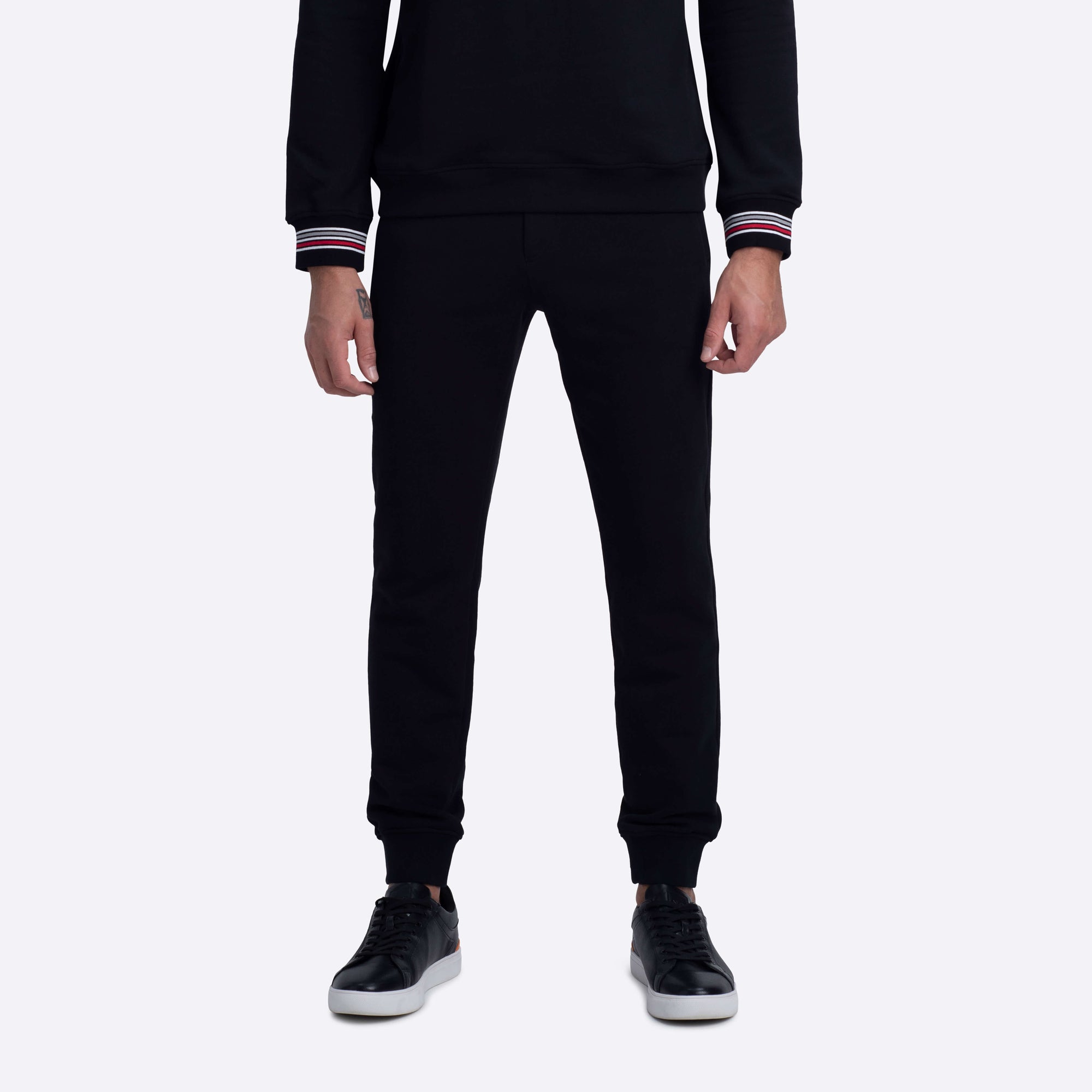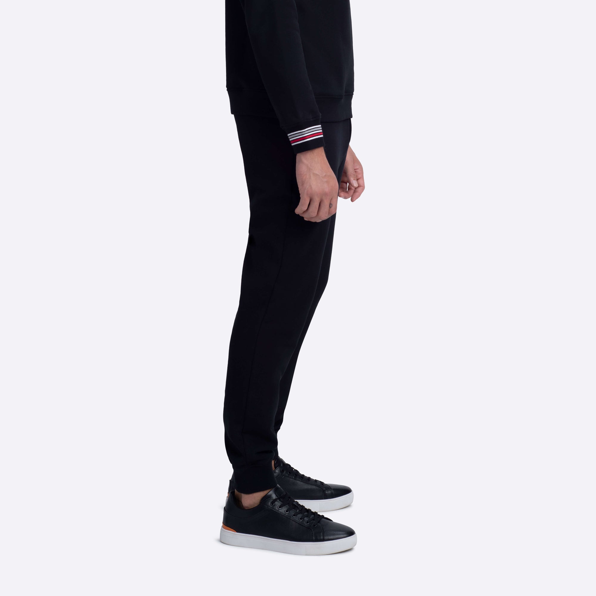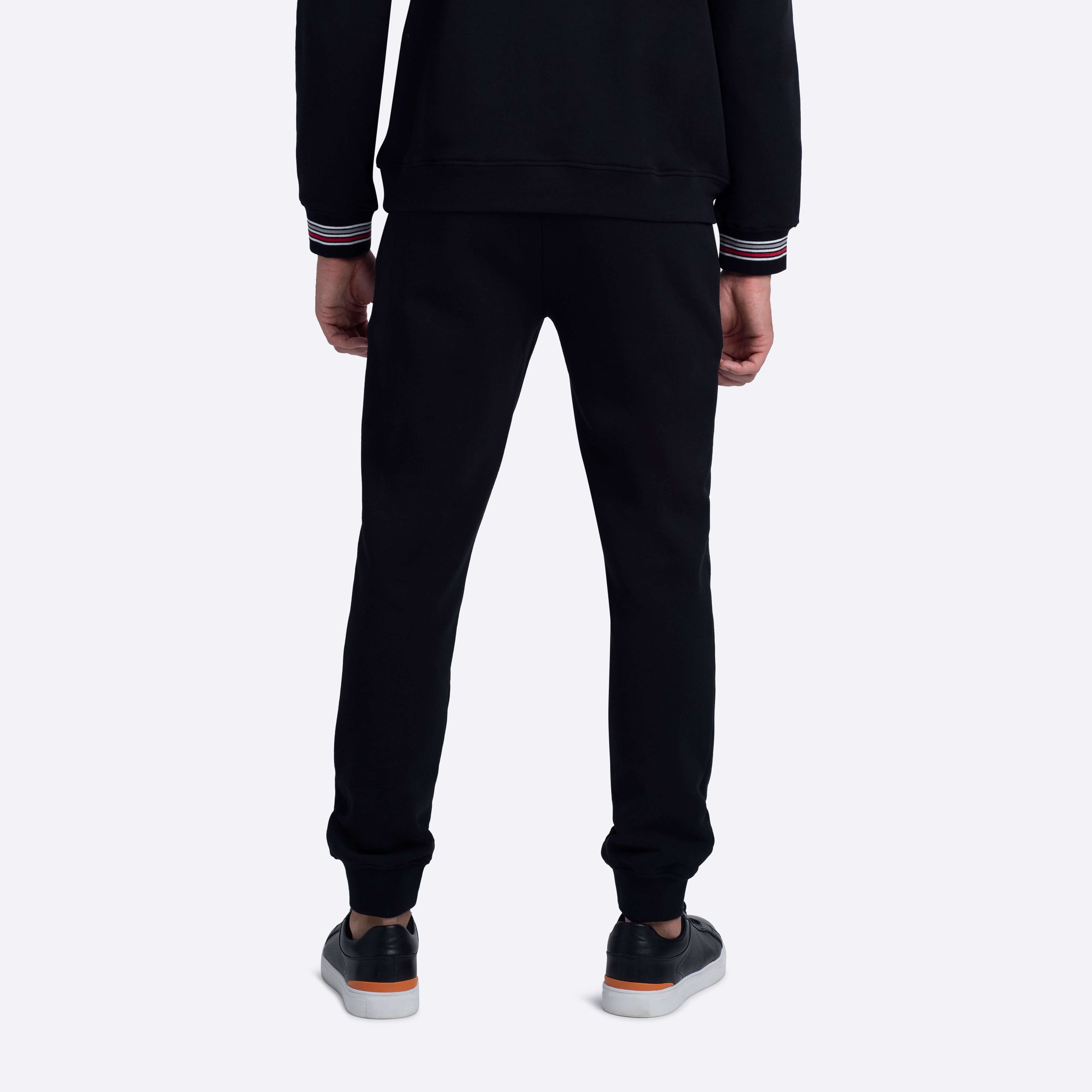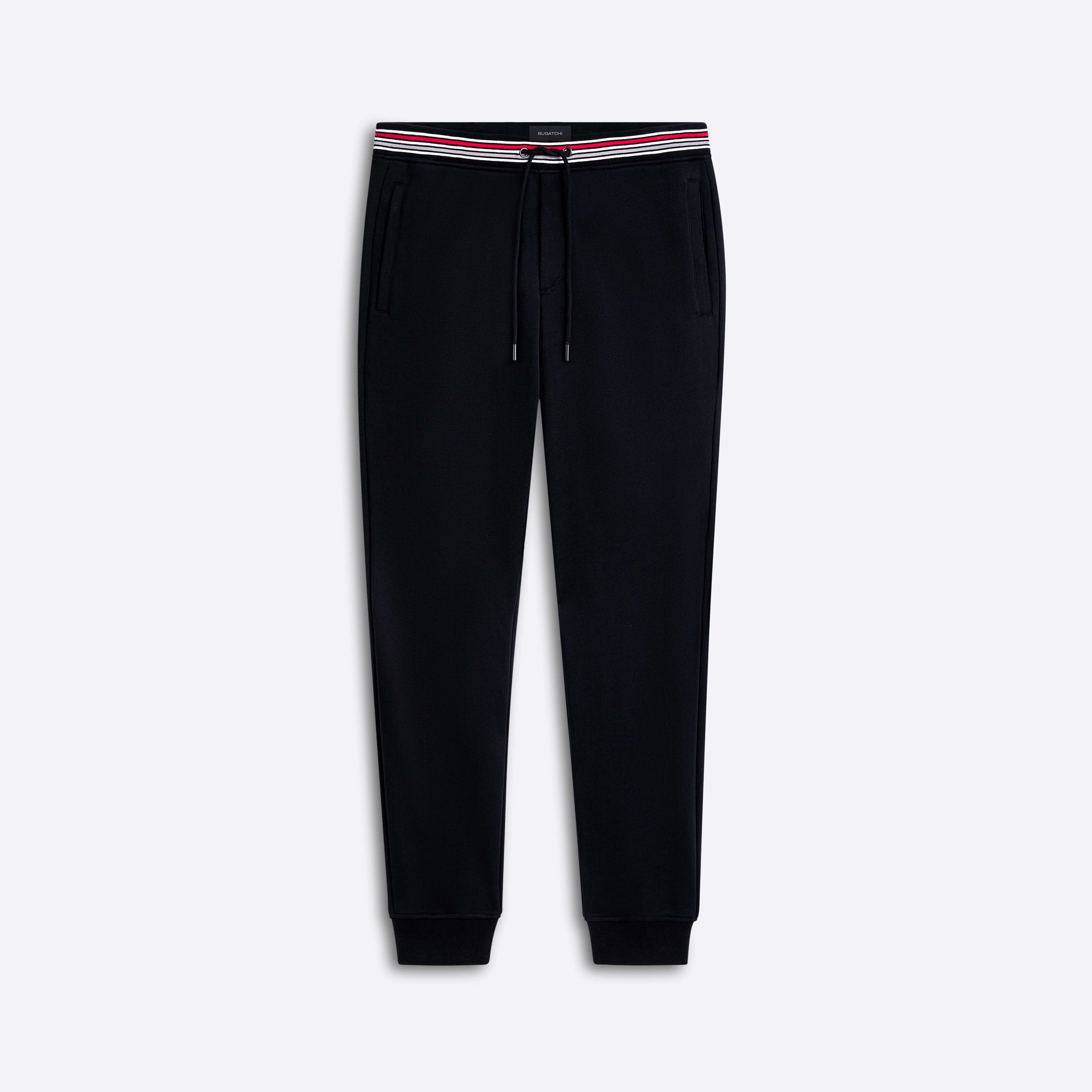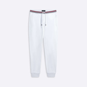 Jogging style pants in COMFORT 100% cotton with contrast striped waistband, drawstring, rib cuffs, two side slit and one rear pockets.