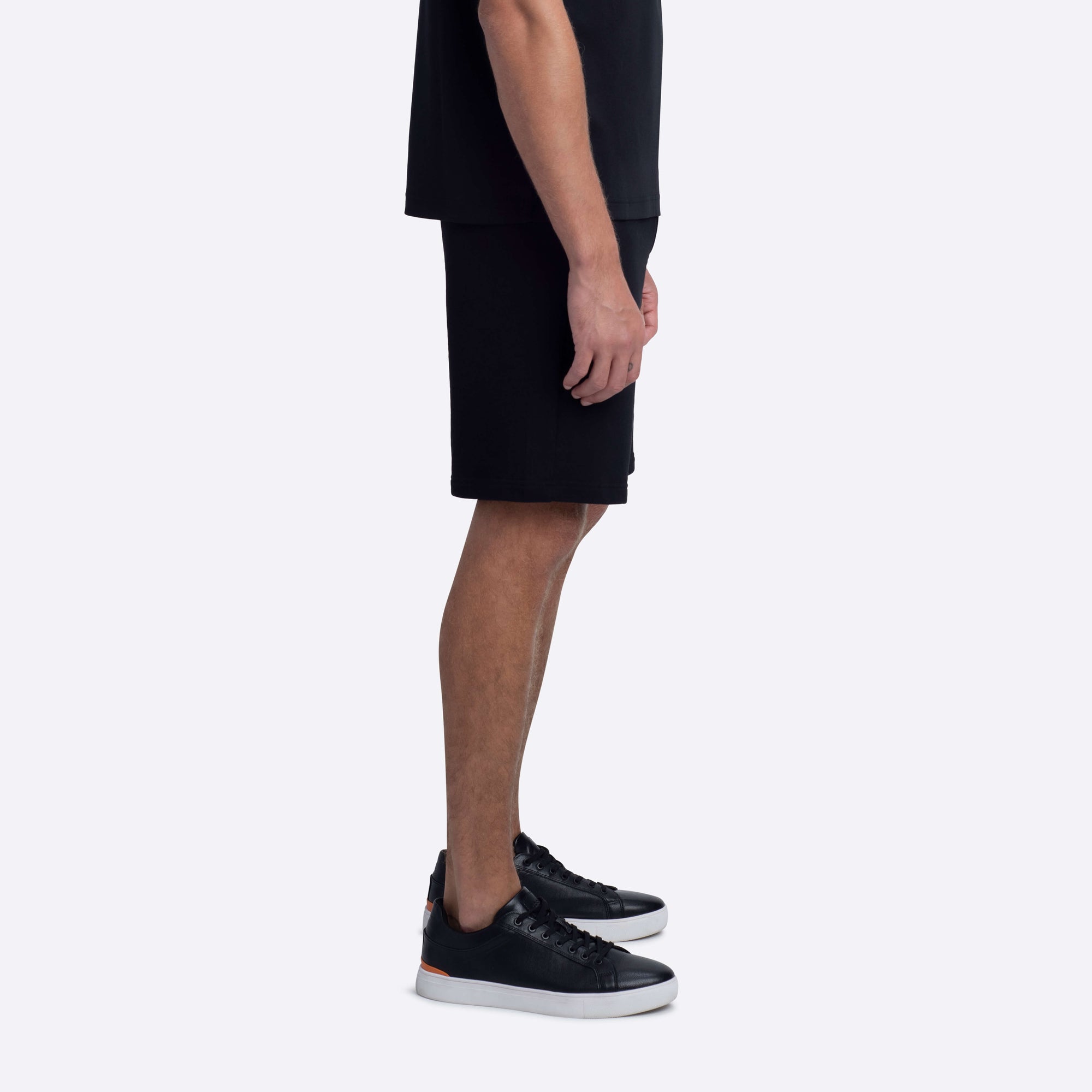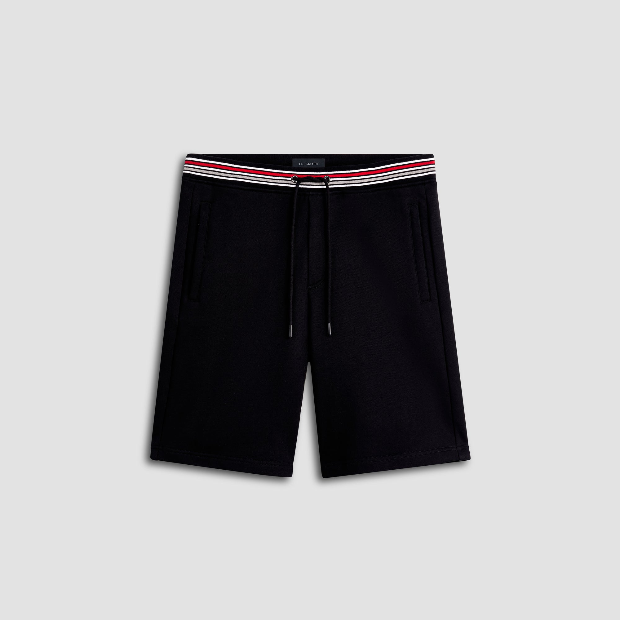 Jogging style shorts in COMFORT 100% cotton with contrast striped rib waistband, drawstring, two side slit and one rear pockets.